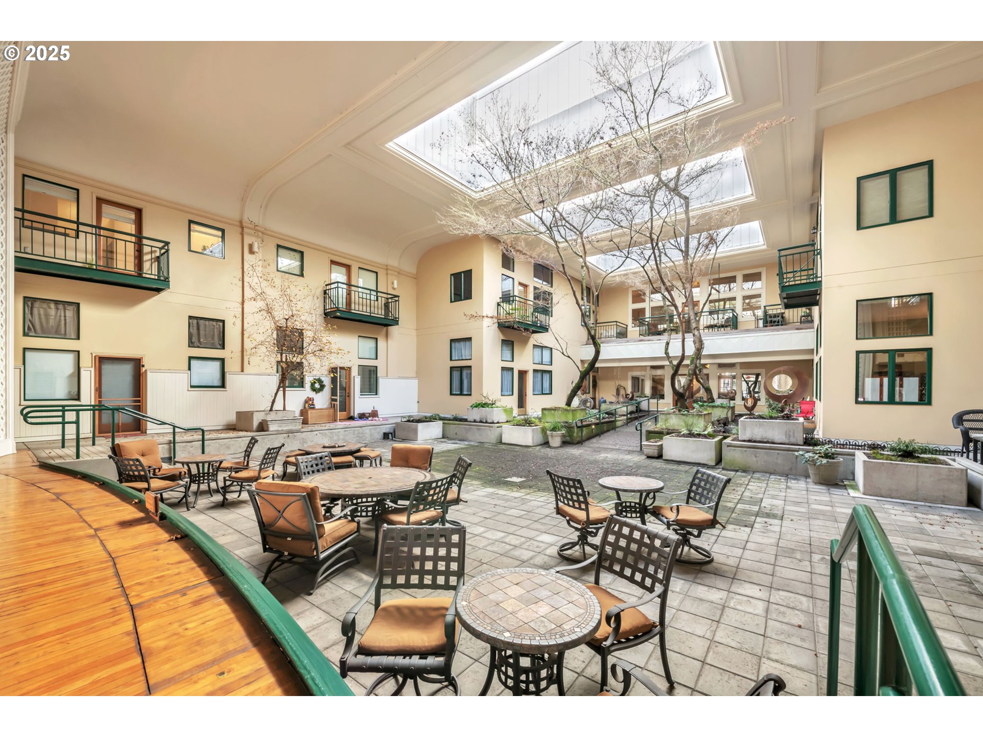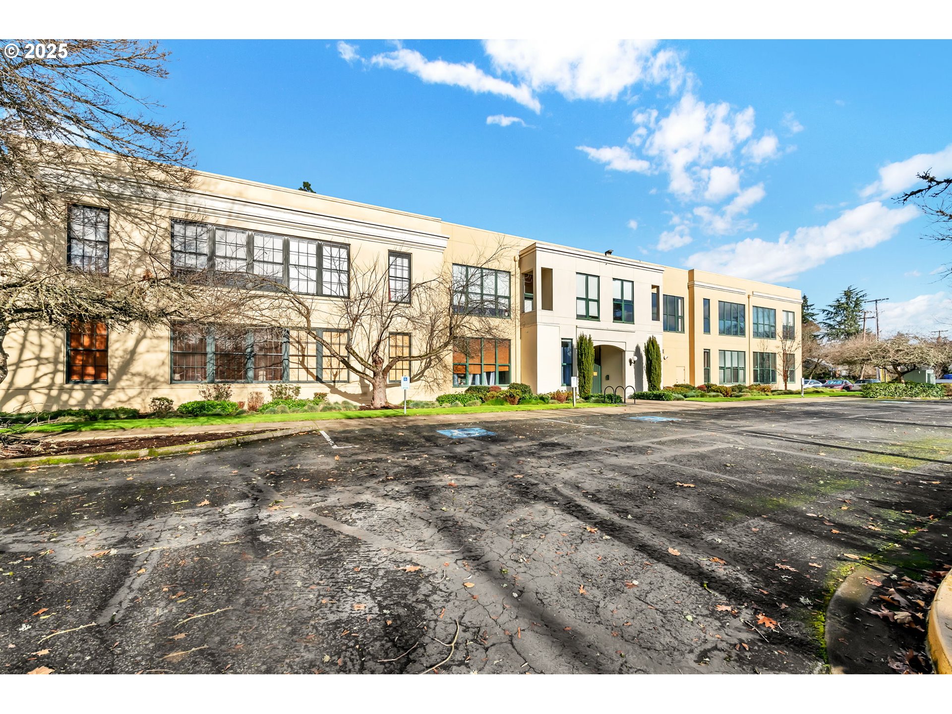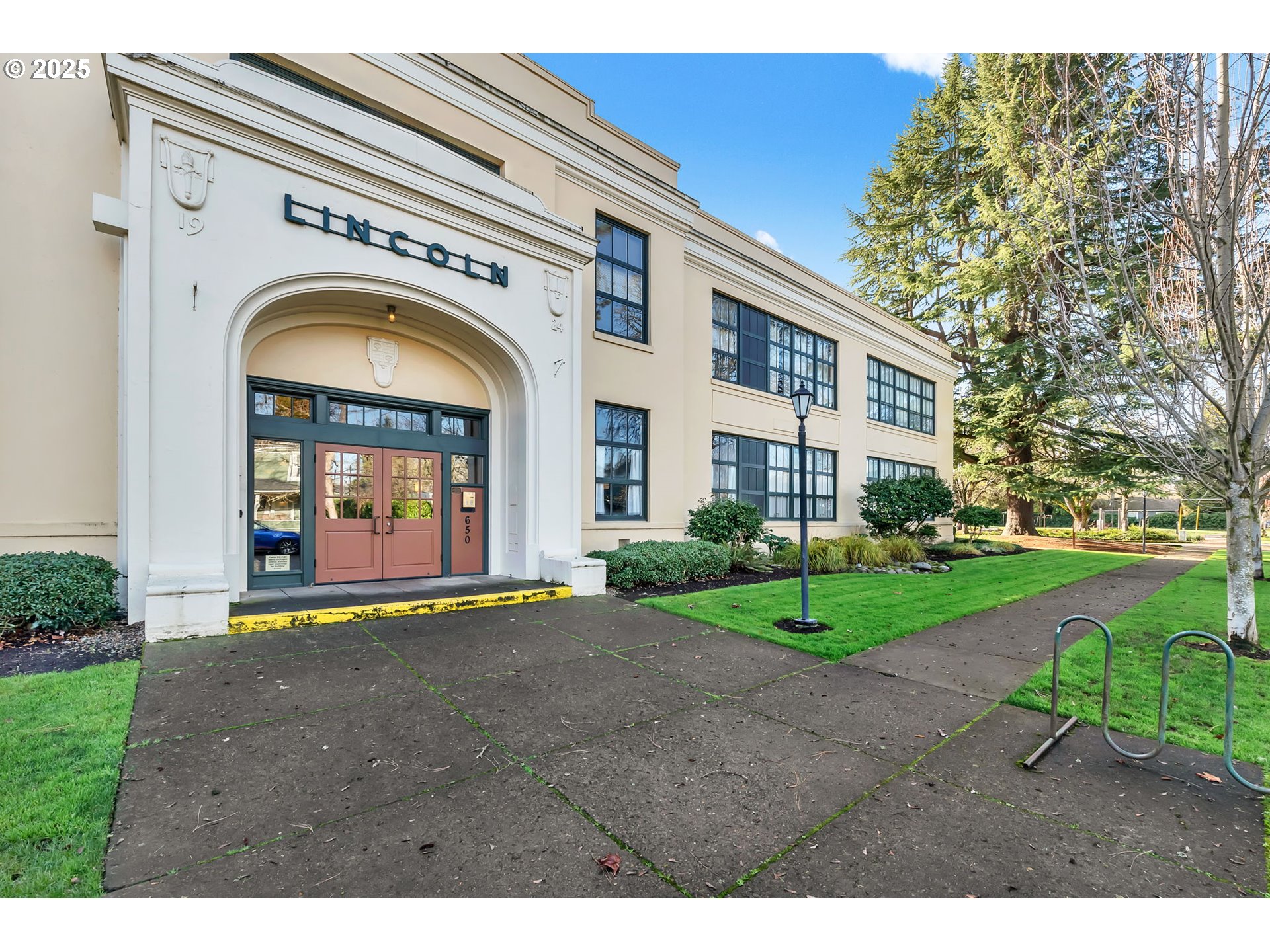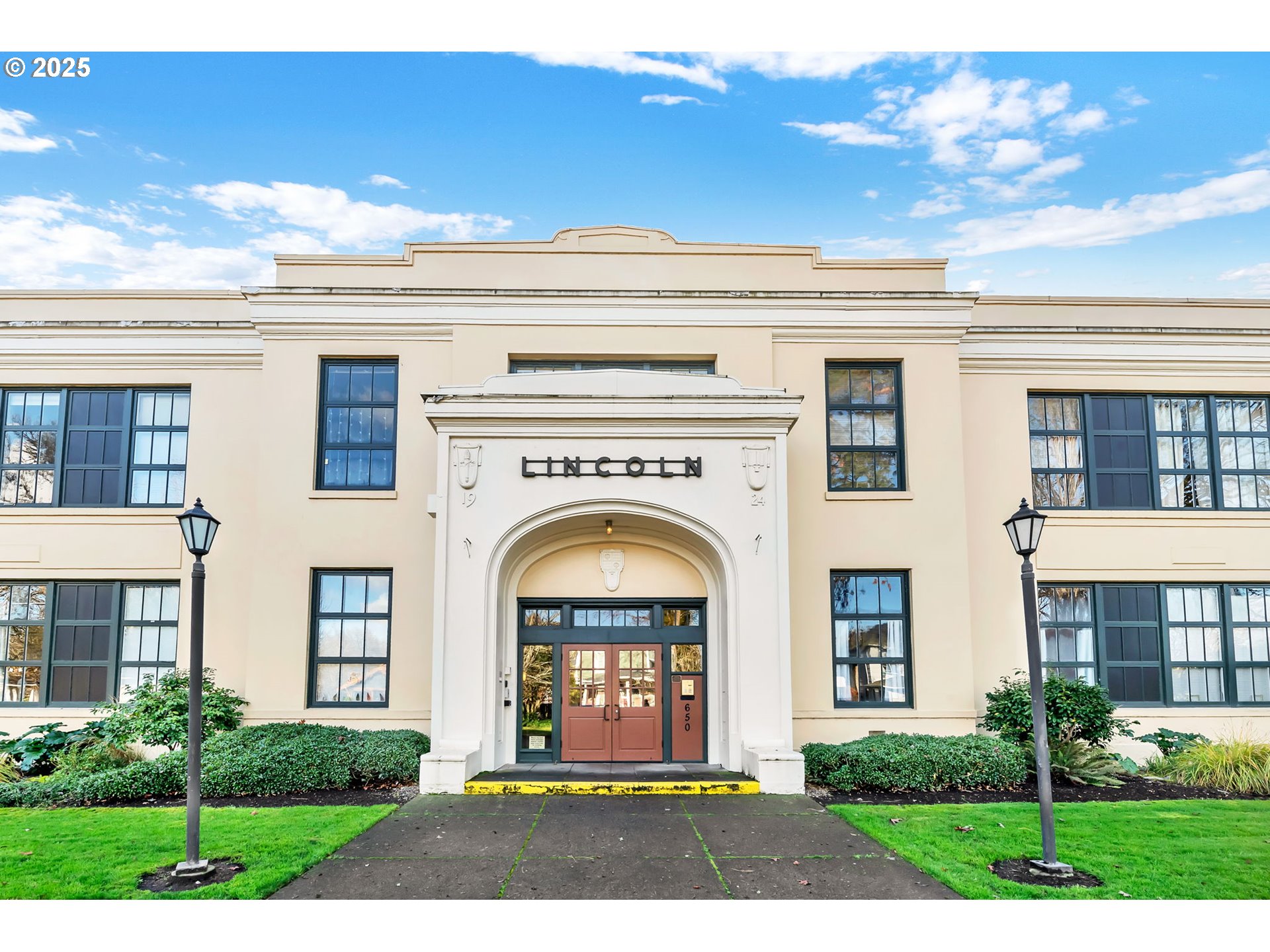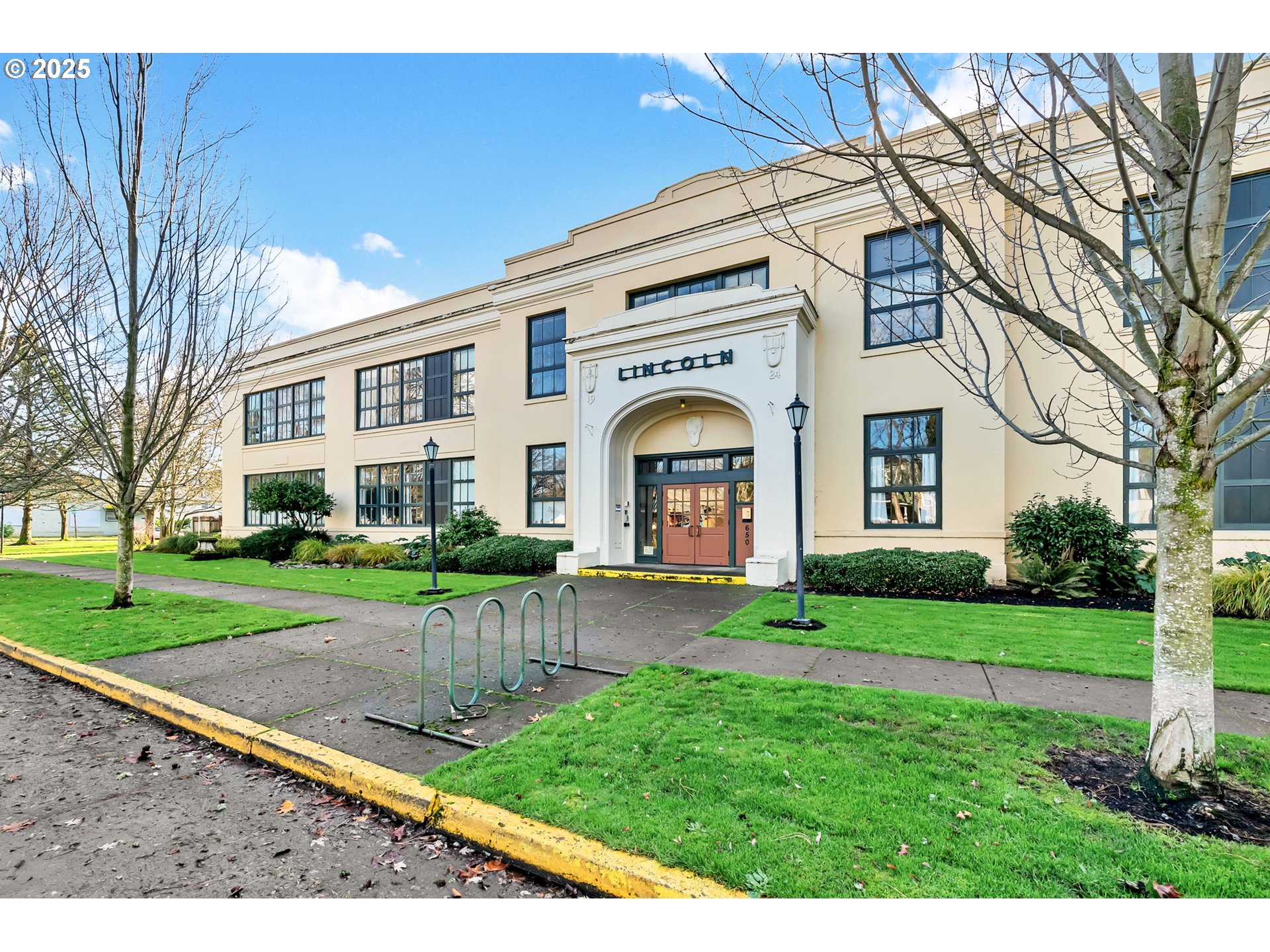 Located in the historic Lincoln School Condominiums, Unit 211 offers a rare blend of character, comfort, and convenience near downtown Eugene, the University of Oregon, and the Lane County Fairgrounds. Originally built as Woodrow Wilson Junior High and later converted to condos, the building is listed on the National Register of Historic Places. This bright studio features tall, vaulted ceilings, abundant natural light, and modern updates including granite countertops, maple cabinets, stainless steel appliances, and includes partial furnishings with a sleeper sofa. A covered balcony overlooks the open, light-filled atrium, providing a peaceful indoor-outdoor feel year-round. The secure, gated building offers well-kept grounds, on-level laundry, secure indoor bike storage, and a deeded parking space. Just next door, enjoy a city park with open green space, a playground, outdoor gym, seating areas, and a community garden. A unique opportunity to own a piece of Eugene history in a prime location.