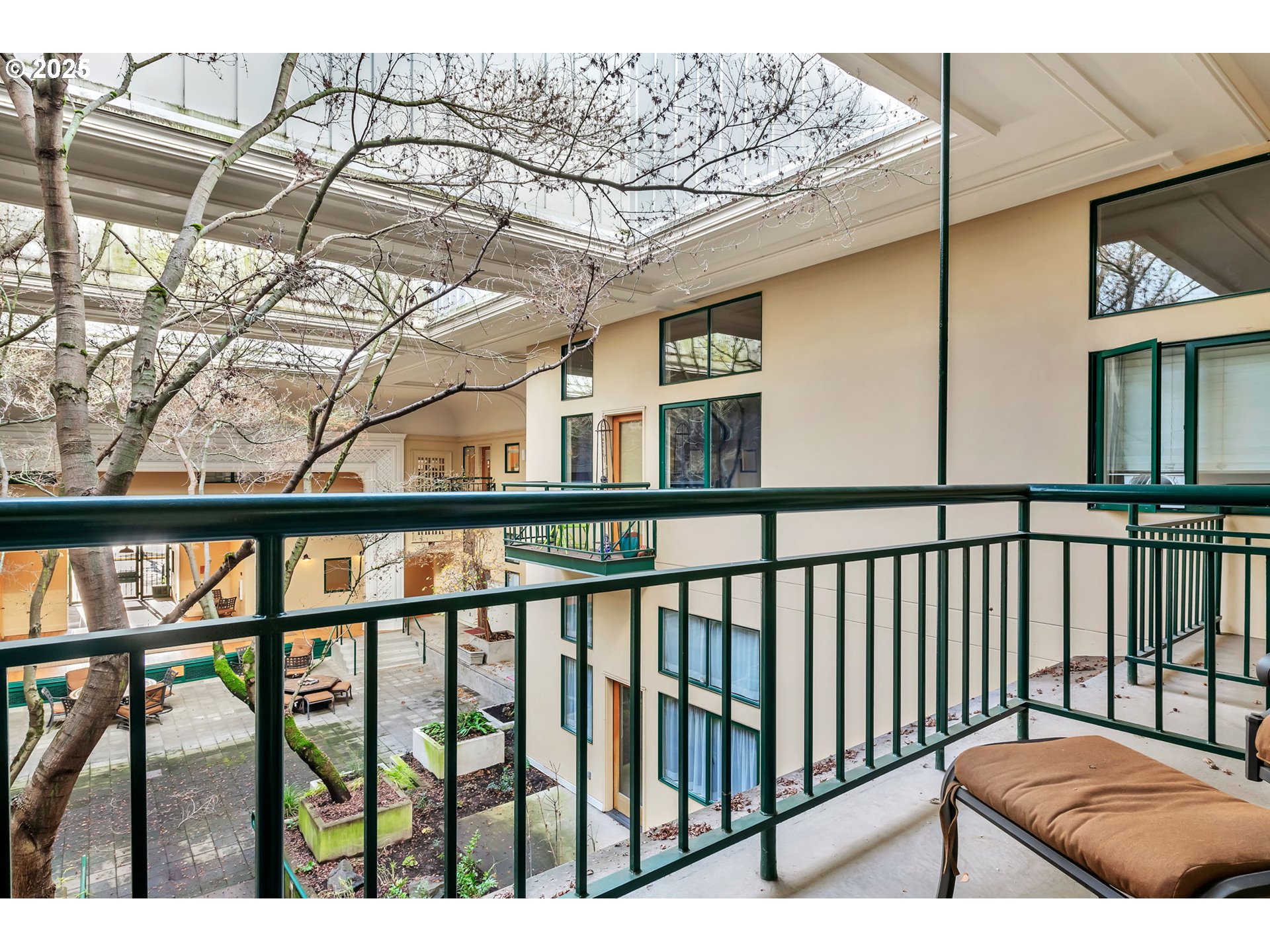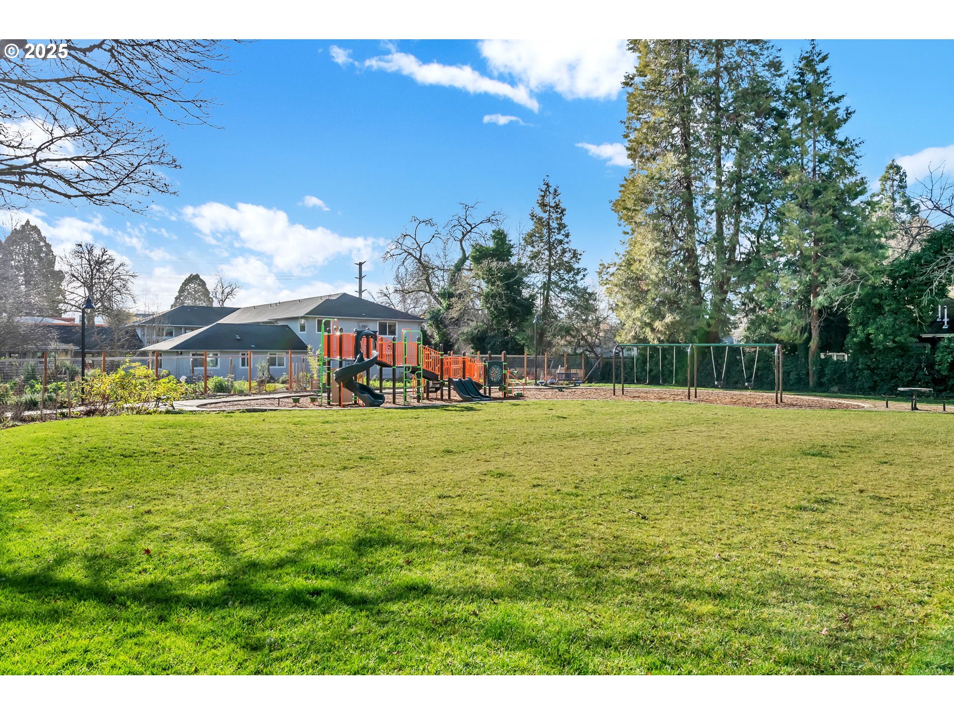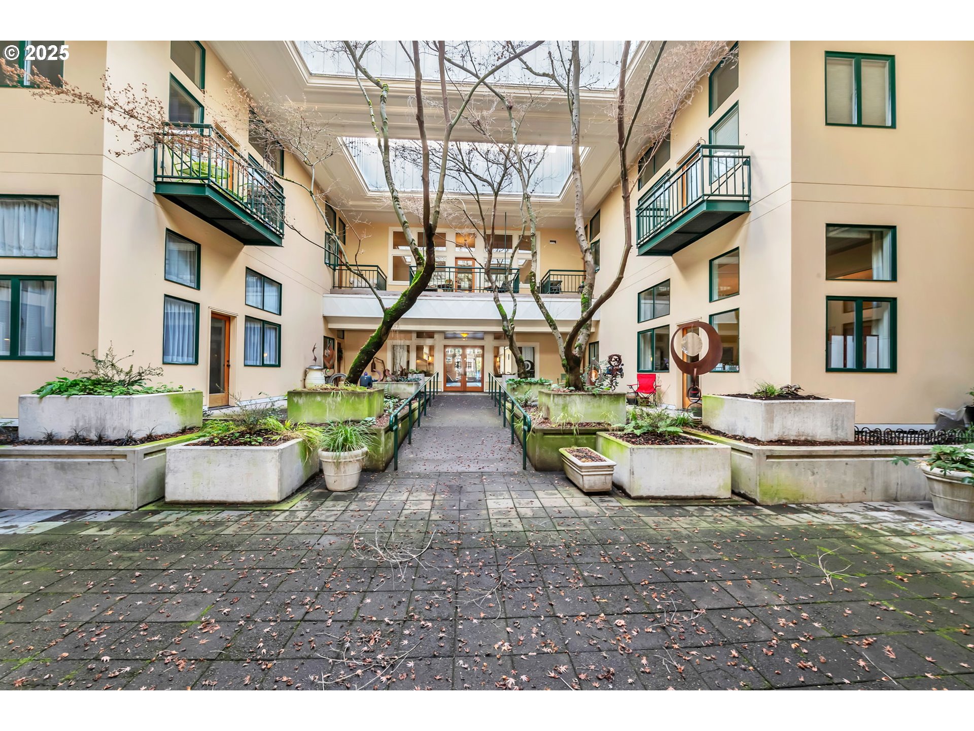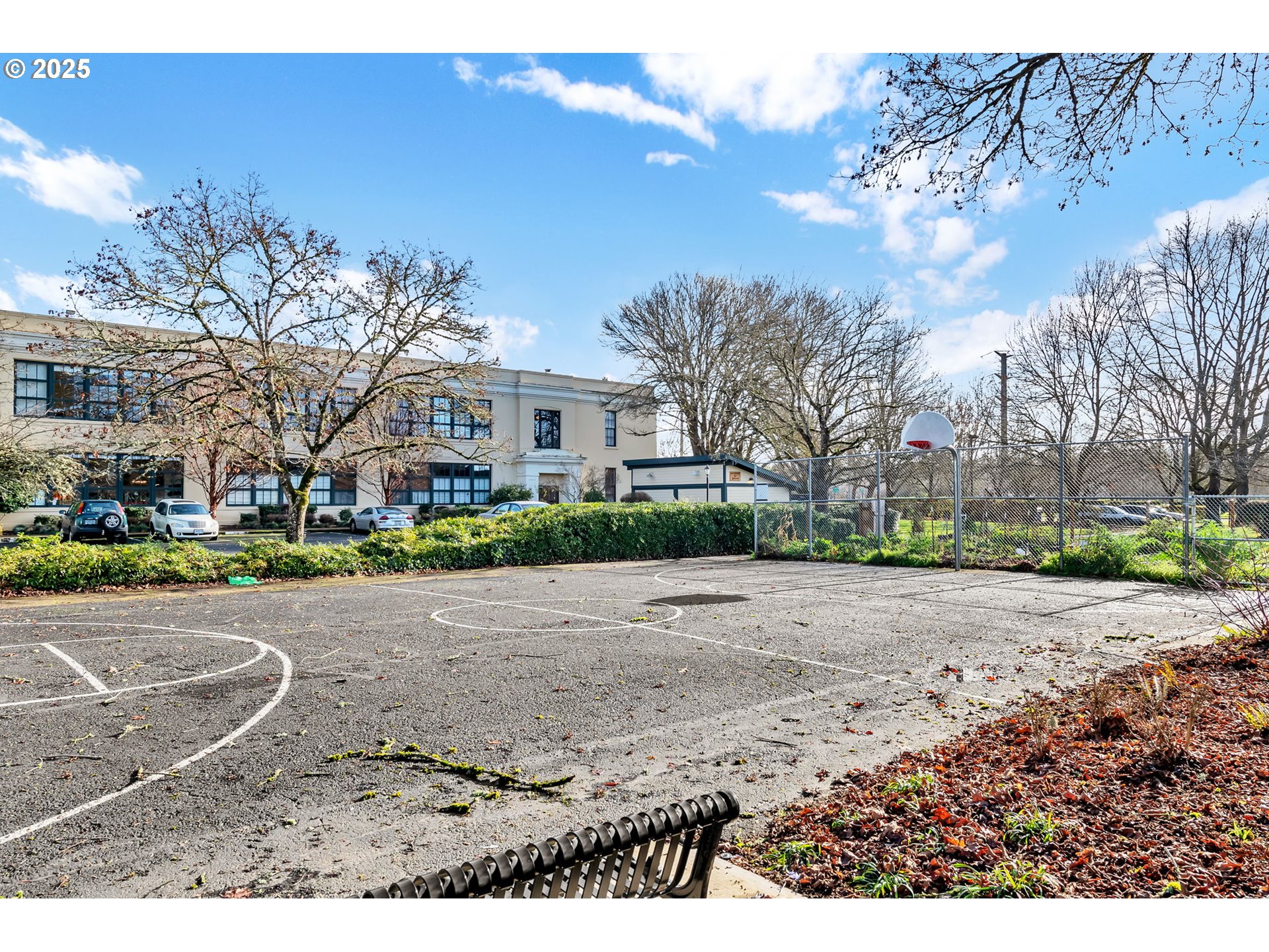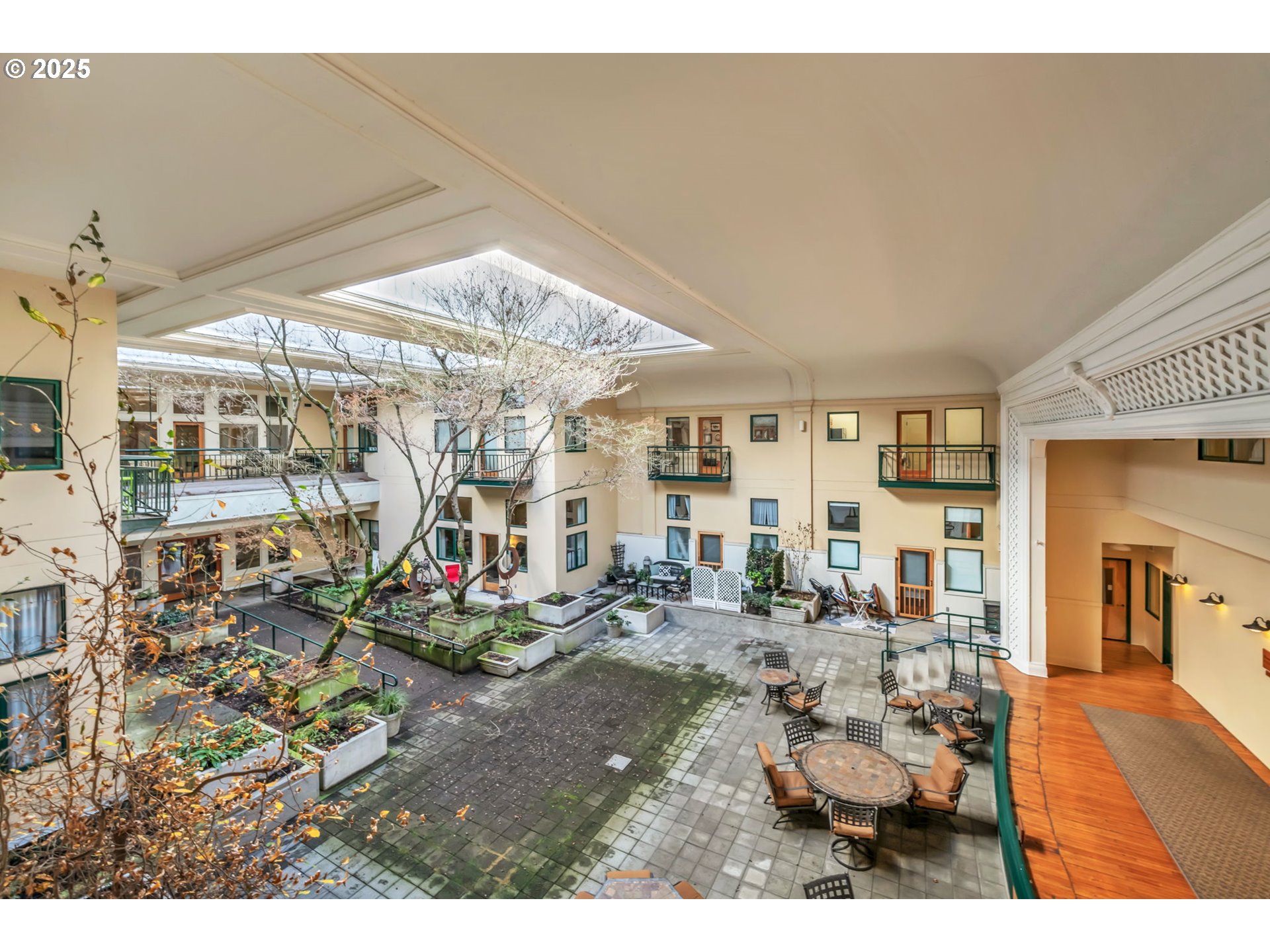 Located in the historic Lincoln School Condominiums, Unit 211 offers a rare blend of character, comfort, and convenience near downtown Eugene, the University of Oregon, and the Lane County Fairgrounds. Originally built as Woodrow Wilson Junior High and later converted to condos, the building is listed on the National Register of Historic Places. This bright studio features tall, vaulted ceilings, abundant natural light, and modern updates including granite countertops, maple cabinets, stainless steel appliances, and includes partial furnishings with a sleeper sofa. A covered balcony overlooks the open, light-filled atrium, providing a peaceful indoor-outdoor feel year-round. The secure, gated building offers well-kept grounds, on-level laundry, secure indoor bike storage, and a deeded parking space. Just next door, enjoy a city park with open green space, a playground, outdoor gym, seating areas, and a community garden. A unique opportunity to own a piece of Eugene history in a prime location.