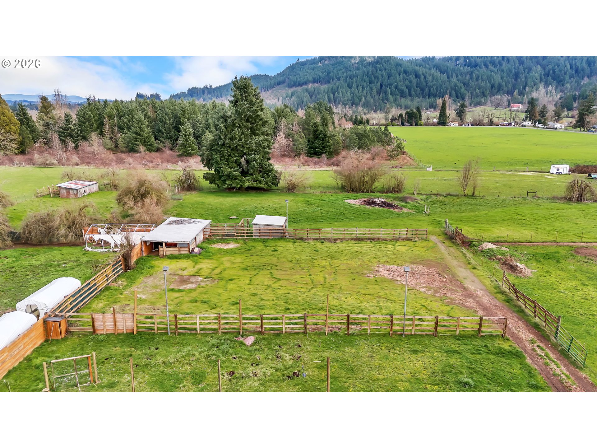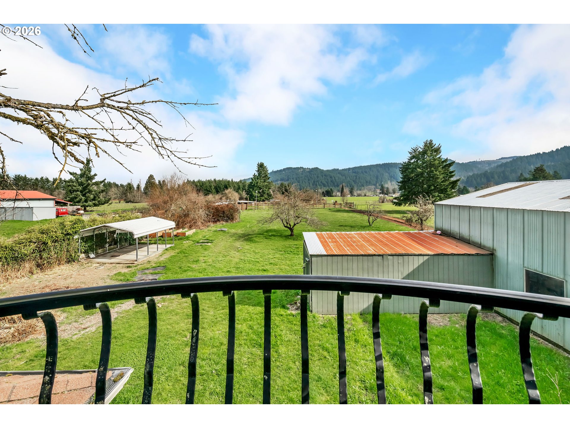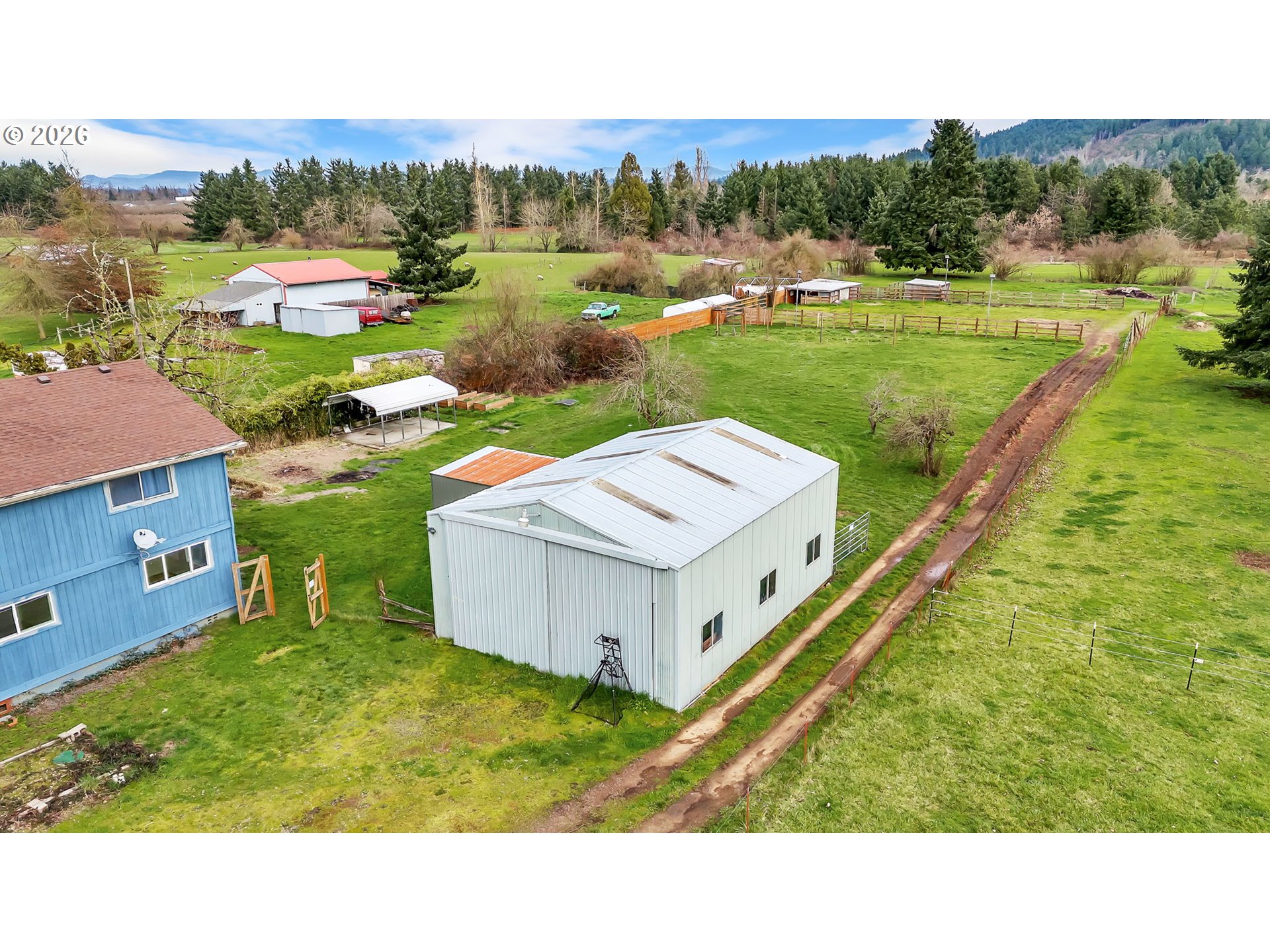 Nearly 3000 SQFT, 3-bedroom with office or 4th bedroom, 2.5-bath home offering versatile living spaces in a private setting with convenient access to town. The home features tall ceilings, abundant natural light, and a functional floor plan that includes both living and family rooms, a kitchen with a peninsula counter for casual seating, and a dedicated dining area. The upstairs primary suite overlooks the property and is accompanied by a second living space with a built-in bar, providing flexibility for entertaining, recreation, or additional lounge space. Exterior improvements include a detached studio suitable for guest quarters, home office, or creative use, a 24x30 shop, stalls, two fenced pastures, and an outdoor arena area with potential for restoration. Additional features include RV parking, ample storage, garden space, mountain views, and a peaceful setting well suited for those seeking space, usability, and lifestyle-oriented living.