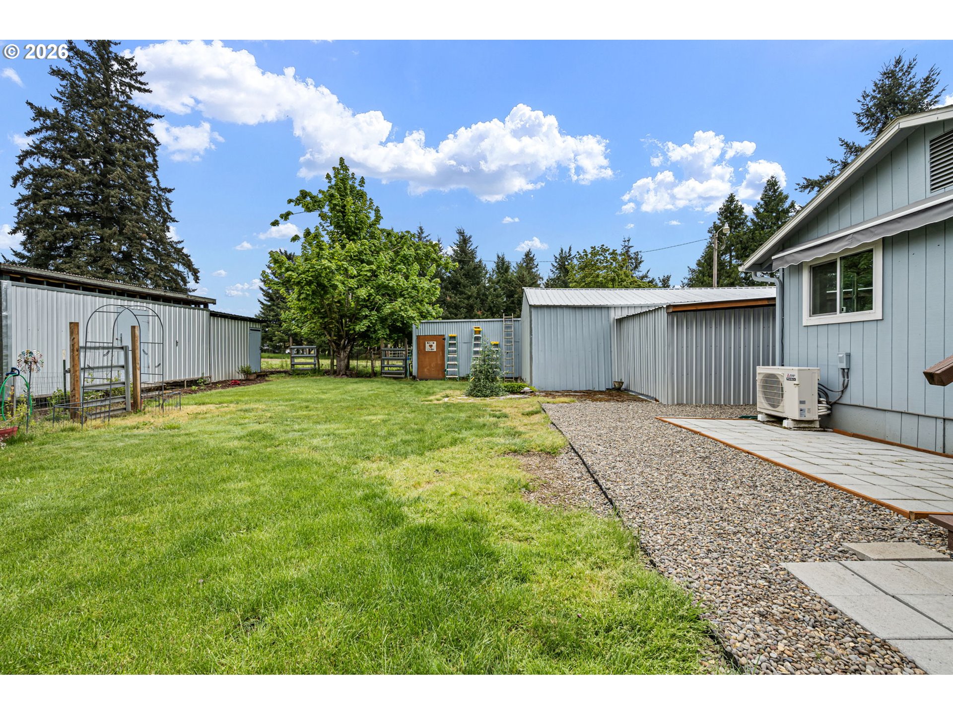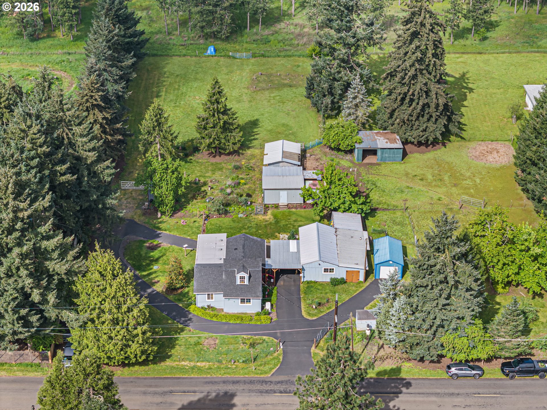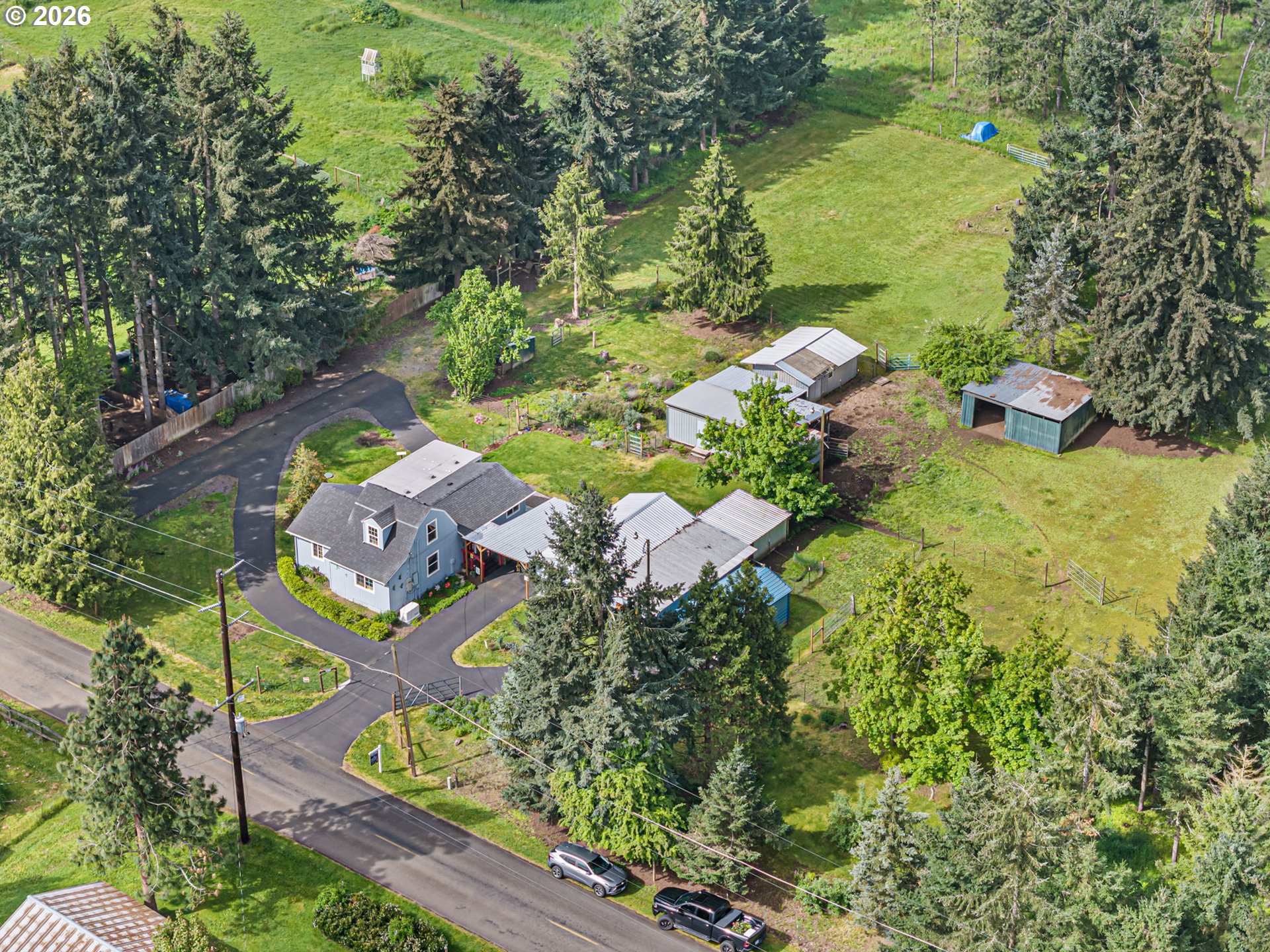 This 3 bed, 2 bath farmhouse sits on nearly 5 fully fenced acres, ideal for farm animals, gardening, or small-scale farming. Property features multiple gated pastures, farm stalls, a fenced garden area, and several outbuildings for storage and use.Recent major improvements within the last 5 years include a new roof, entirely new well w/ UV filtration, new septic and drain field, fresh interior and exterior paint,vinyl windows throughout and ductless mini-split systems provide efficient heating and cooling throughout the home. A Generac generator (2025), connected to natural gas, offers reliable backup power for the entire house.Additional features include an asphalt driveway, RV/boat parking, covered carport, and a 20x12 metal structure for parking or storage. The kitchen showcases beautiful hickory cabinets, adding warmth and character to the home. 2 tax lots both zoned residential, possibility to build additional dwelling, buyers to do their own due diligence. Great opportunity for buyers seeking usable land, functional infrastructure, and the peaceful feel of country living with convenient access to nearby amenities.
