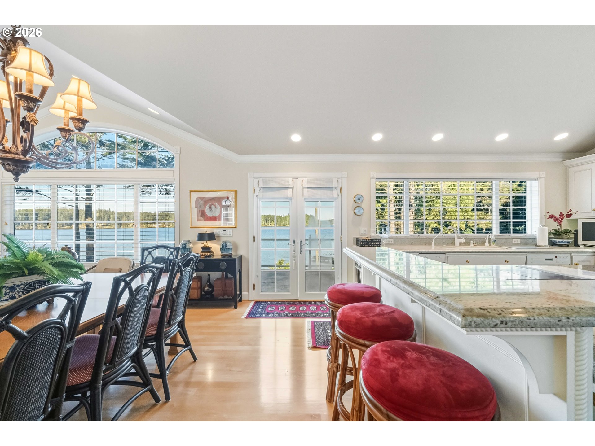 Offered for the first time in its entirety, this extraordinary Woahink Lake estate represents a level of privacy, scale, and versatility that is virtually impossible to replicate. Comprising multiple contiguous parcels and 3 residences with extensive lake frontage, this is a legacy compound set against one of Oregon’s most pristine freshwater lakes. The main residence rests on 1.64 acres of manicured, gated grounds with sweeping lawns and several hundred feet of direct Woahink Lake frontage. Encompassing over 4,600 square feet, the home is both expansive and welcoming, thoughtfully designed with primary suites on each level, 4 Bedrooms/3.5 Bathrooms. Maple floors, vaulted ceilings, and walls of windows capture uninterrupted lake views, with sightlines extending to the surrounding dunes—an ever-changing natural backdrop that defines the setting. Outdoor living is seamless and intentional. A private dock and small launch provide effortless access to the lake for kayaking, paddleboarding, or quiet mornings on the water. End-of-road privacy ensures tranquility, while full paving and gated entry reflect the estate’s exceptional level of infrastructure. Complementing the main home is a triple detached, heated/fully insulated garage with abundant storage, topped by a beautifully appointed 1 Bedroom/1 Bathroom guest residence. With its own private entrance, vaulted ceilings, expansive kitchen, laundry, jetted tub, patio, and lake views, it offers complete independence. Further elevating the offering are two adjoining parcels: a .55-acre lakefront piece with its own gate, dock, and a single-level 3 bed/2bath home + double garage; and a one-acre undeveloped parcel providing a private forest, trails, and additional prime lake frontage. With water rights to Woahink Lake, newer heat pumps, Generac generator, and meticulously maintained improvements throughout, this estate stands as one of the most comprehensive and compelling opportunities. Sqft: Main 4671/Guest 1144/3rd 1488.