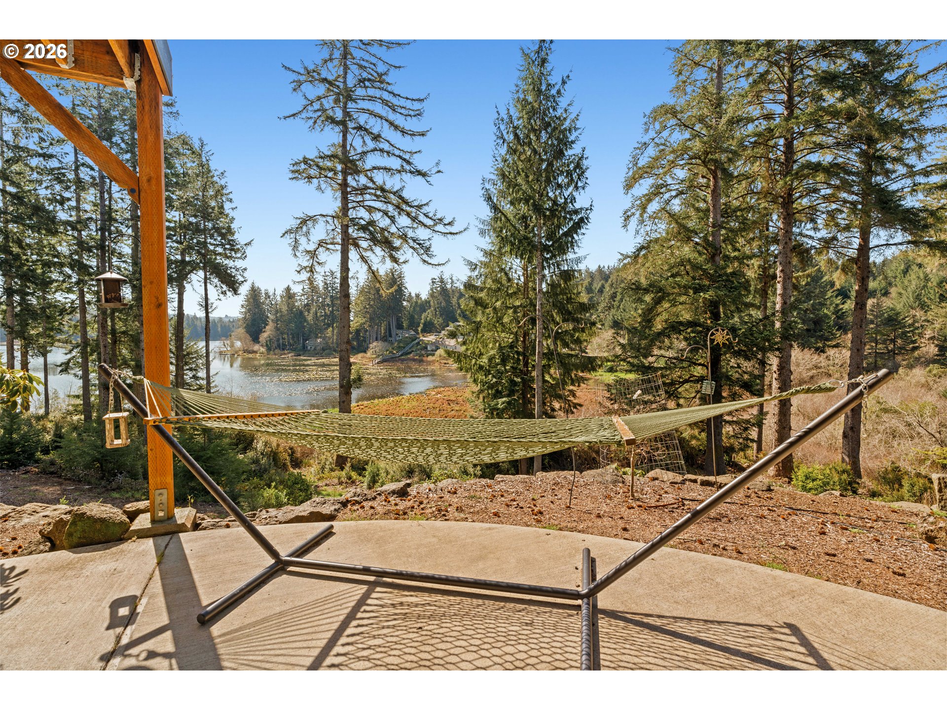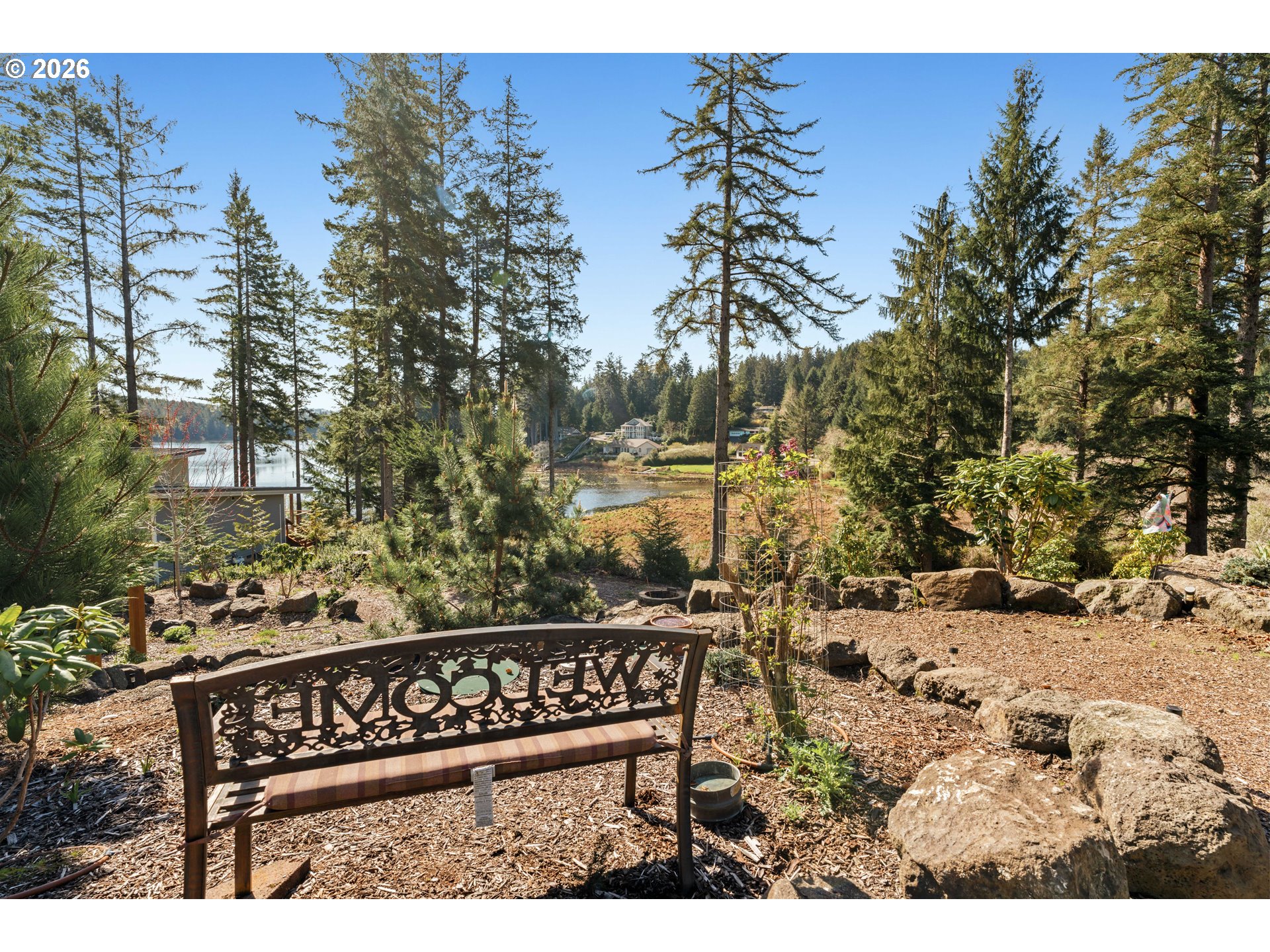 Set on 1.24 private waterfront acres, this exceptional custom-built 2020 home offers a beautiful blend of luxury, comfort, and thoughtful design. Inside, vaulted wood ceilings, hardwood floors, expansive windows, and a stone fireplace create a warm and inviting living space filled with natural light. The open living space opens to a generous deck and gorgeous view. The kitchen is beautifully appointed with premium appliances, double ovens, a dumbwaiter, a vintage farmhouse sink, quartz counters and a large island designed for gathering, making it a dream for home chefs and bakers alike. The main-level primary suite offers a peaceful retreat with private deck access, a spa-like bath, soaking tub, walk-in shower, and closet space which conveniently connects to the laundry room. Additionally the upstairs has an extra bedroom or office that connects to the 2nd bathroom on this level. Downstairs, the home opens to a flexible bonus space currently used as an artist studio, complete with a counter and sink area, perfect for a potter, quilter, gardener, painter, or artist of any kind. There is also an additional office with built-in bookshelves and a guest room on the lower level. The true showpiece is the incredible custom home theater, a rare feature that makes this property stand out in all the right ways. Covered outdoor living spaces and professionally landscaped grounds with native plants complement the peaceful lakefront setting, offering privacy, serenity, and a connection to nature. A custom greenhouse and fenced garden area create a space worthy of a home and garden magazine feature. The spacious, finished three-car garage, featuring insulated doors and additional covered outdoor parking provides plenty of room for all your storage needs. From the upper level, the views are simply stunning—truly the kind you never grow tired of. This is a one-of-a-kind dream property! Join us for open houses on April 4th from 2–5 PM and April 5th from 11–2 PM!