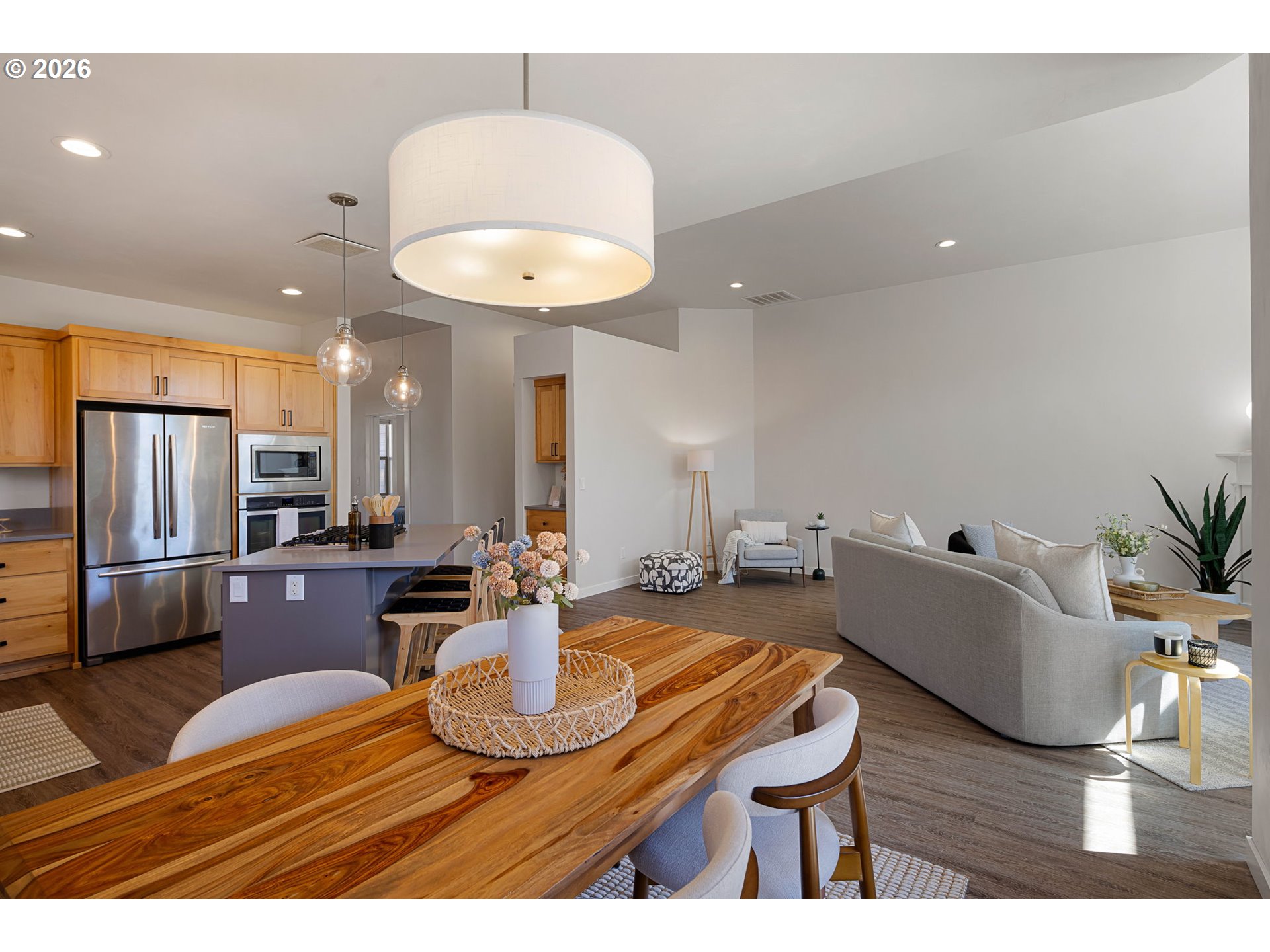 Beautifully crafted in 2017 by Anslow & DeGeneault, this stunning single-level home offers the perfect blend of modern comfort and thoughtful design. Featuring 3 bedrooms and 2 bathrooms, the open-concept layout creates a spacious and inviting living area ideal for both everyday living and entertaining. High ceilings, laminate floors, and abundant natural light enhance the home’s warm and airy feel, while the cozy gas fireplace anchors the main living space. The kitchen seamlessly connects to the living and dining areas, making it perfect for gatherings. The private primary suite features a generous en suite bathroom, providing a relaxing retreat. A well-designed laundry room adds convenience and functionality. Step outside to enjoy the fully fenced yard ideal for pets, gardening, or outdoor entertaining. Located less than 2 miles from Autzen Stadium and just half a mile from the river and scenic bike path, this home offers easy access to recreation, nature, and all that the area has to offer.