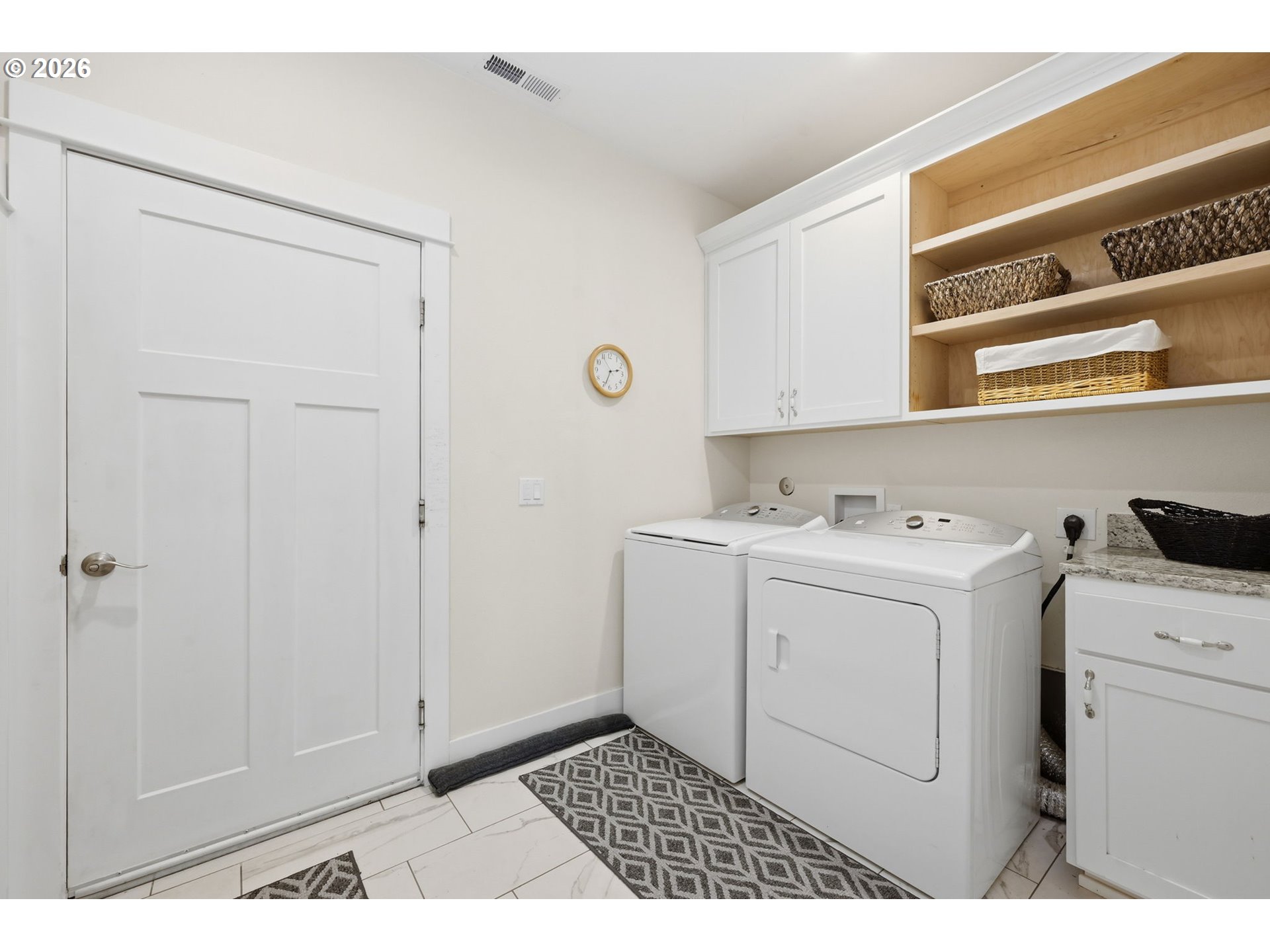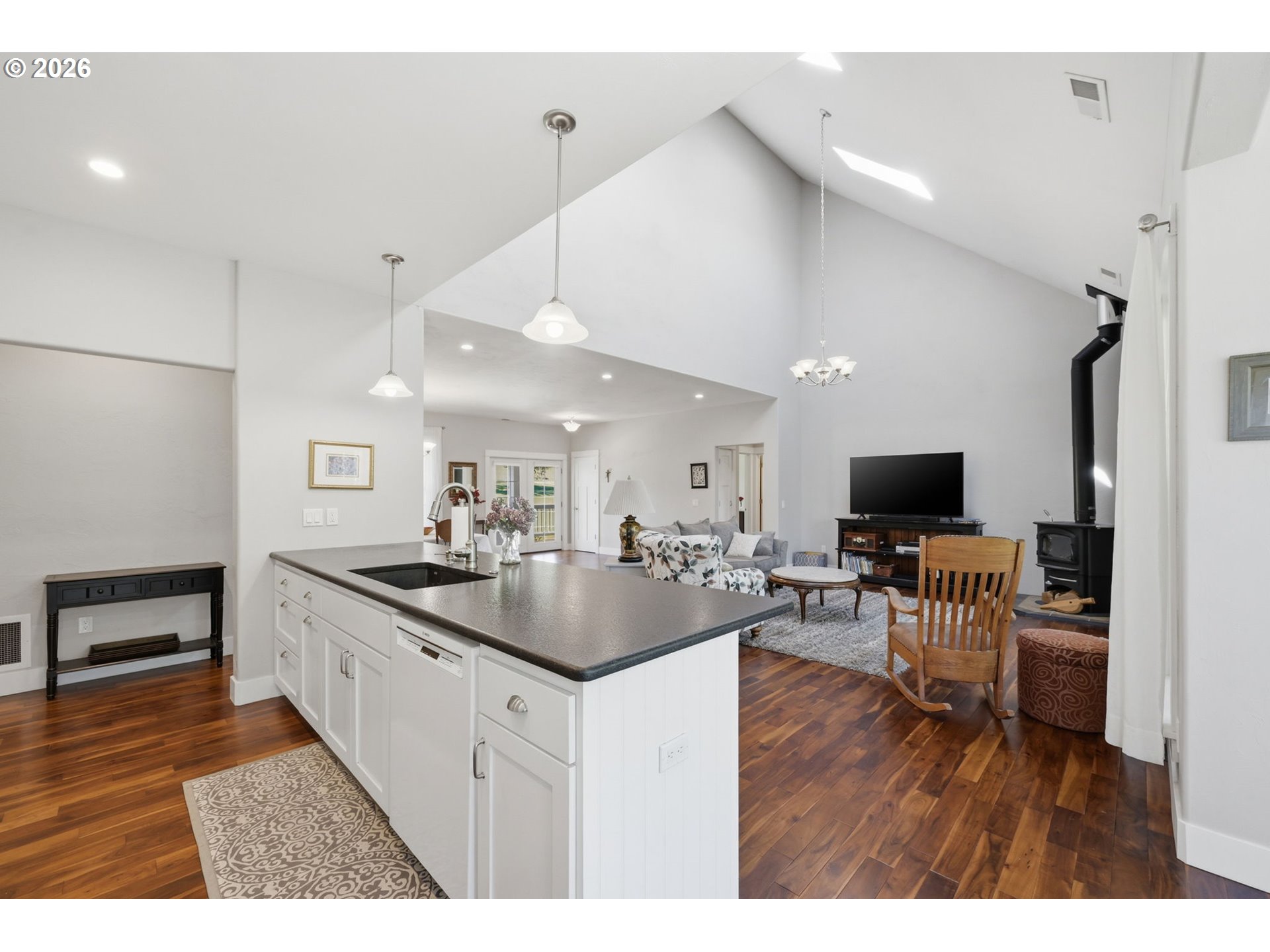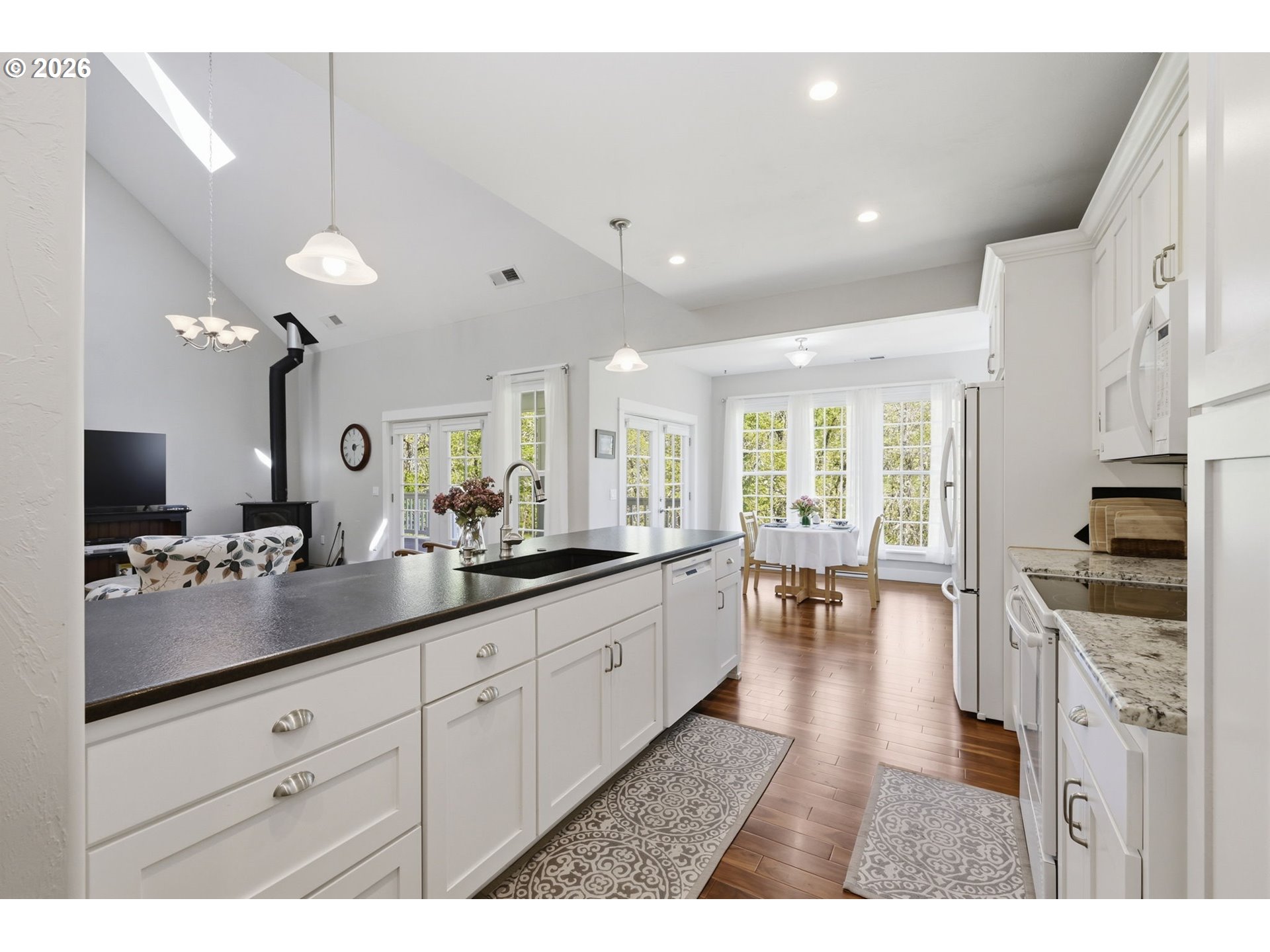 GarageDoorOpener, Granite, HardwoodFloors, HighCeilings, Laundry, Skylight, TileFloor, VaultedCeiling, Wains