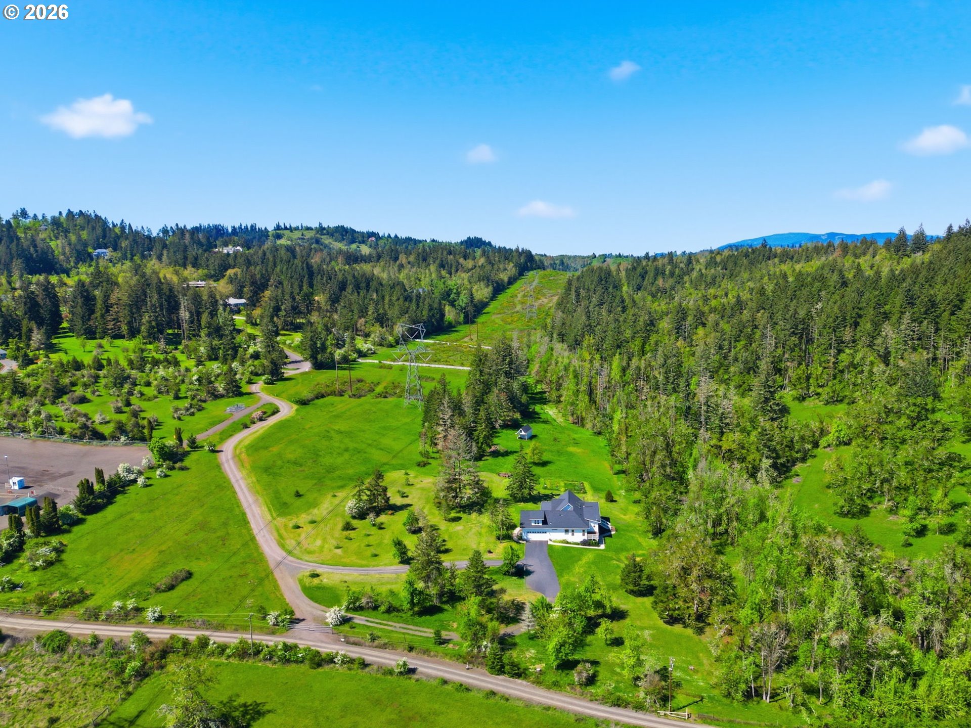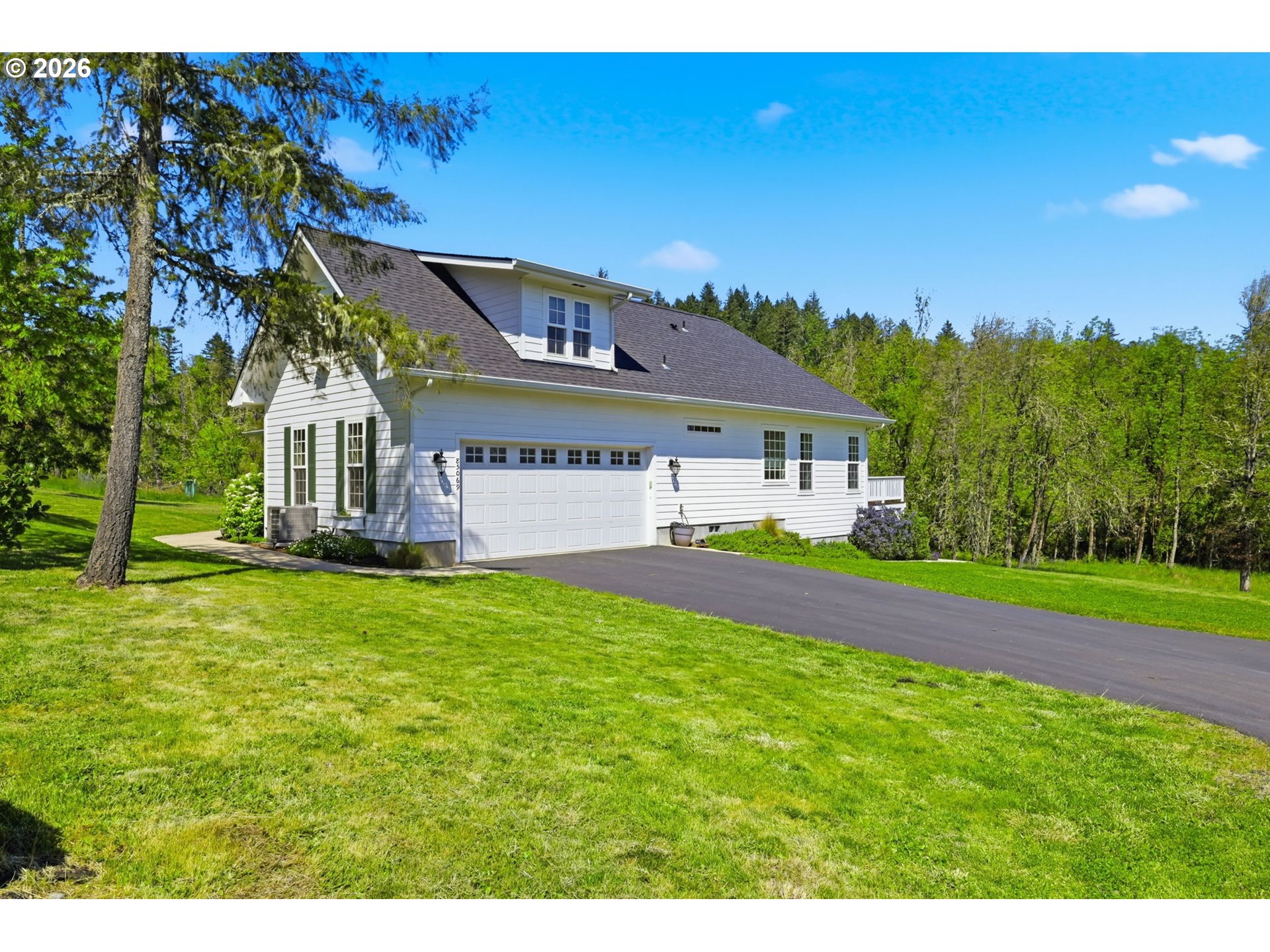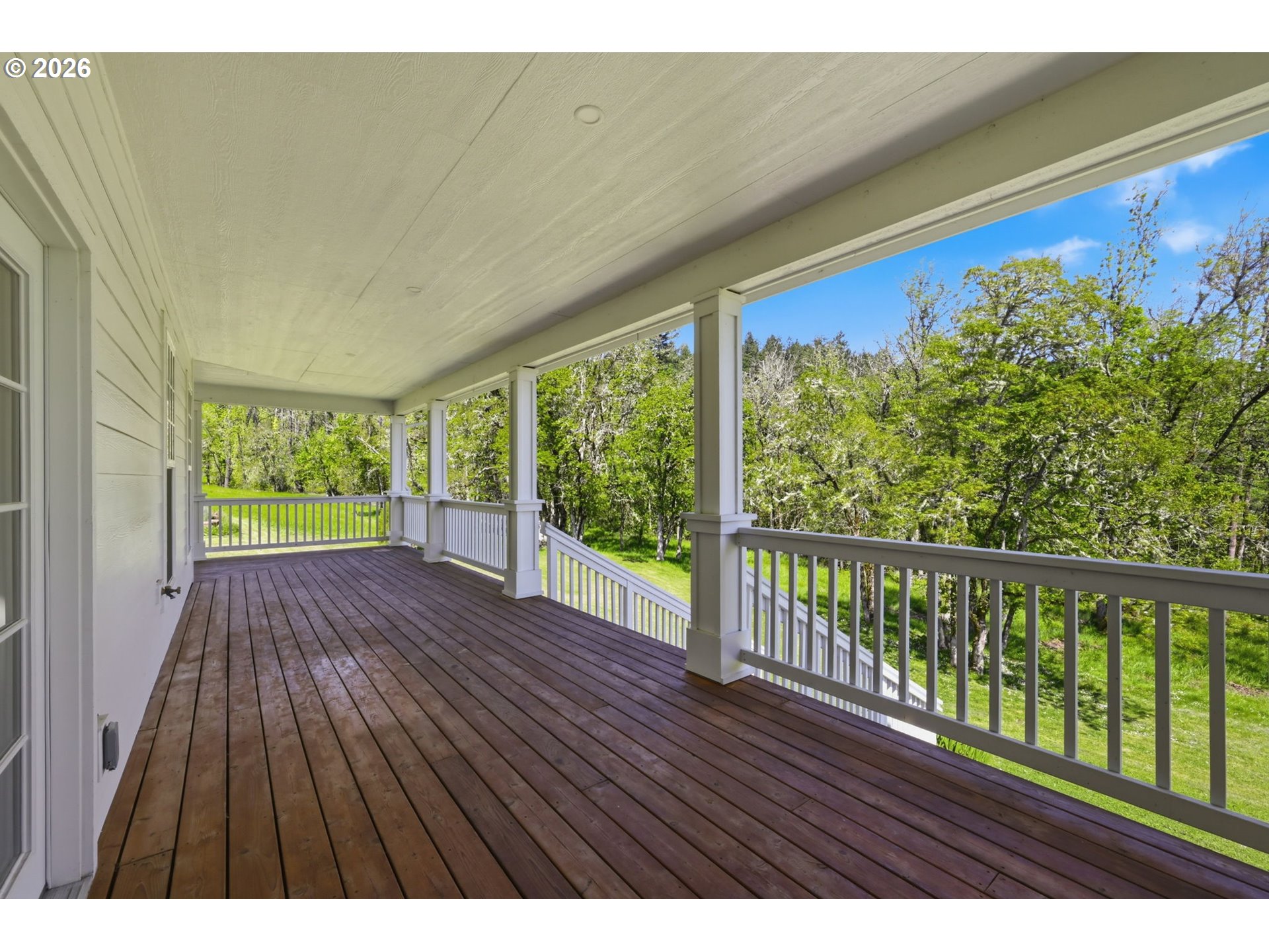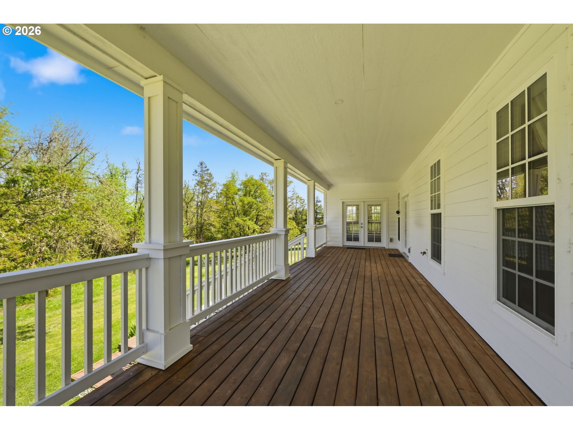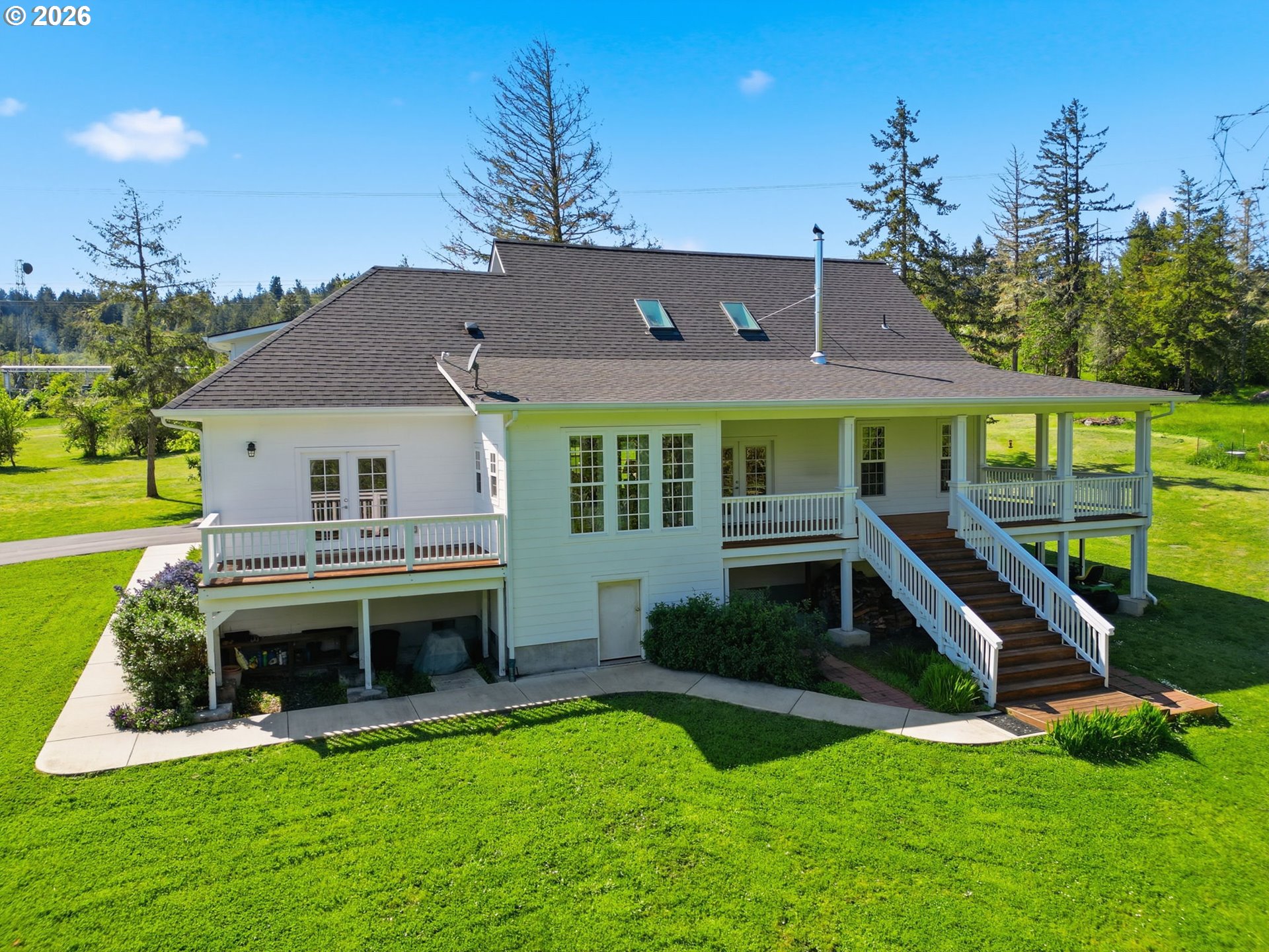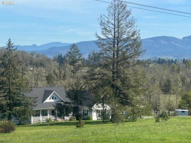 Stunning Modern Farmhouse features a classic wrap-around porch and light-filled interior. Mostly main-level living showcases exquisite acacia wood flooring, complemented by detailed molding on abundant windows and doors. The thoughtfully designed floor plan offers excellent separation between the guest rooms and the primary suite. The gourmet kitchen features a leathered granite peninsula, extra deep farm sink, timeless subway tile backsplash, and a convenient pantry with pull-out shelves. Adjacent to the kitchen, the bright breakfast room catches the morning sun and includes soft-close cabinetry, an extended granite counter, hill views, and French doors for easy outdoor access. The generous family room adds drama with a vaulted ceiling, skylights, tall windows, French doors, and woodstove. The Primary suite boasts a separate bathtub and shower, dual sinks, walk-in closet with built-ins, and French doors leading to its own deck with views of the nearby creek and hills. Each of the 2 1/2 bathrooms and the laundry room have porcelain tile flooring and granite counters. Up the wide staircase, enjoy the very private den/office which could easily function as a large 4th bedroom, if a closet was added. The 466 square foot unfinished stand-up attic offers wonderful storage and/or expansion possibilities. Architectural amenities include an Arched Window, Front Shutters, Attached Flower Boxes, Mature Landscaping, Fruit Trees, and a Fenced Garden. Walk-in storage space, approximately 40'x 11' under the home, has electricity, plywood "floor", small shop space, and insulation. There is even more storage space under the side and back of the wrap-around decks. Additional abutting 5.44-acre parcel, Ridgetop Lot 15, RMLS #24641325, is available, for a total of more than 11 acres. Don't miss this opportunity to experience life in a truly beautiful home in one of South Eugene's premier neighborhoods! Contact your broker today to view.