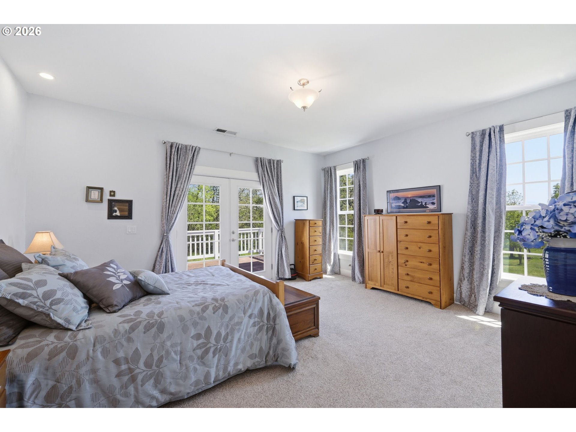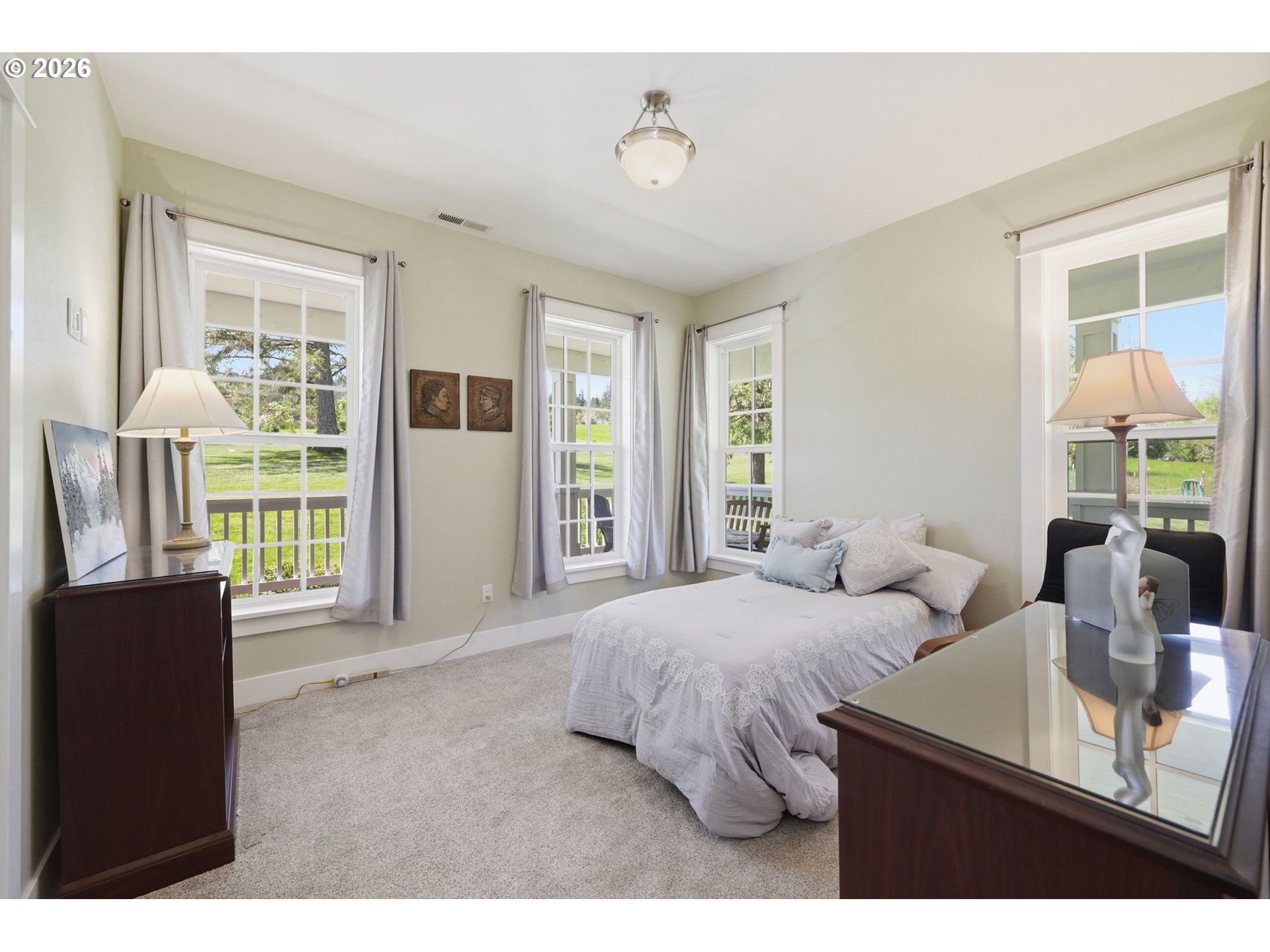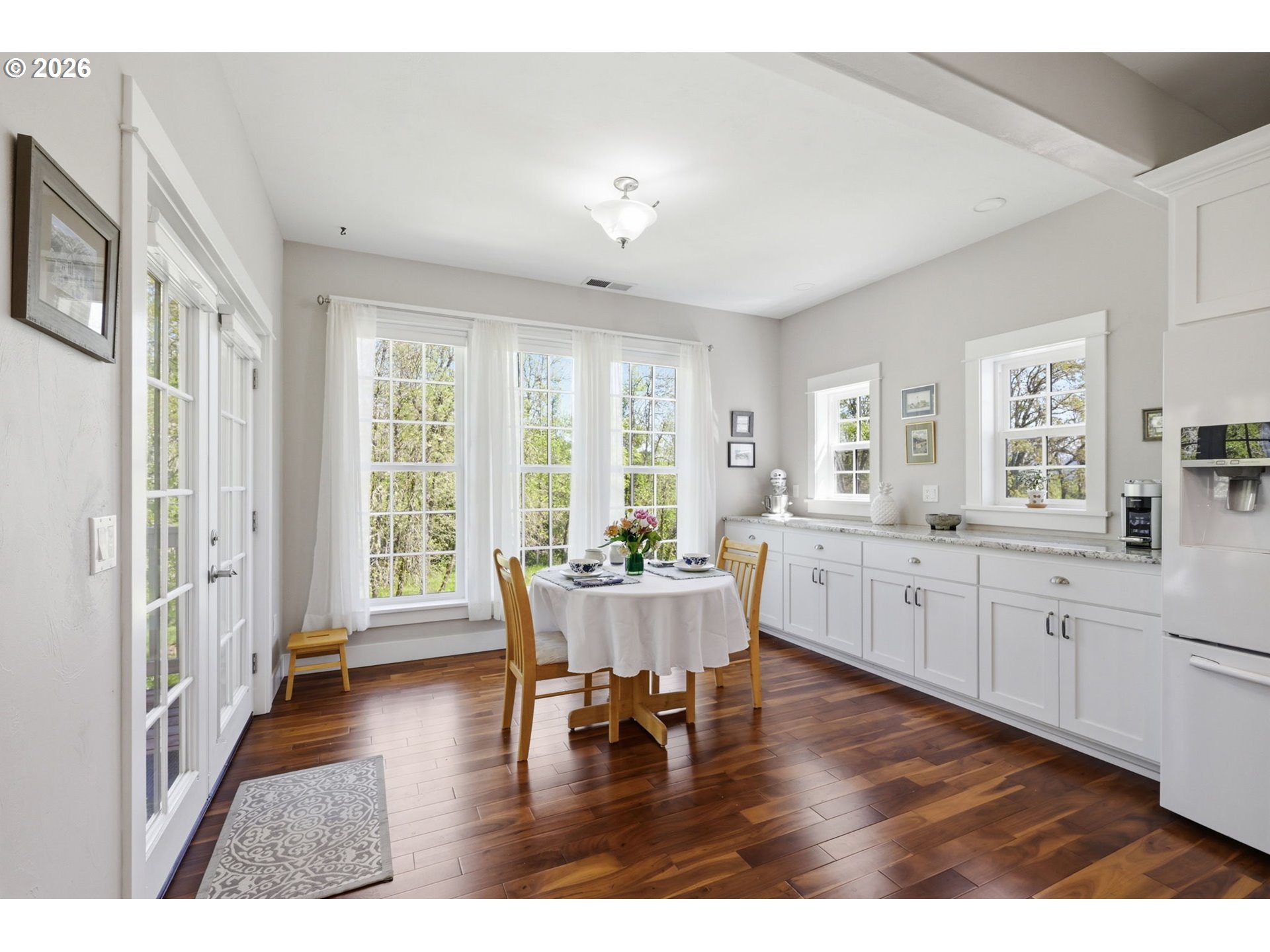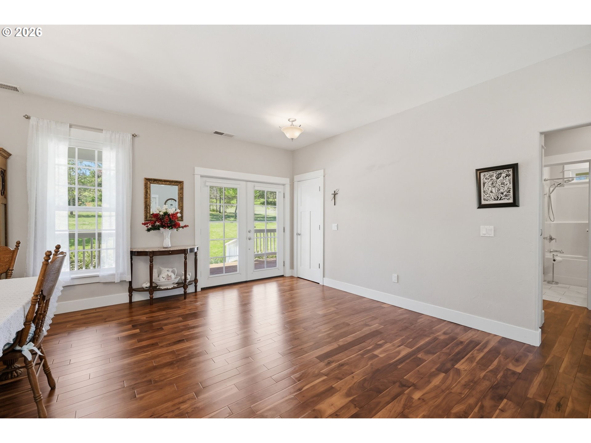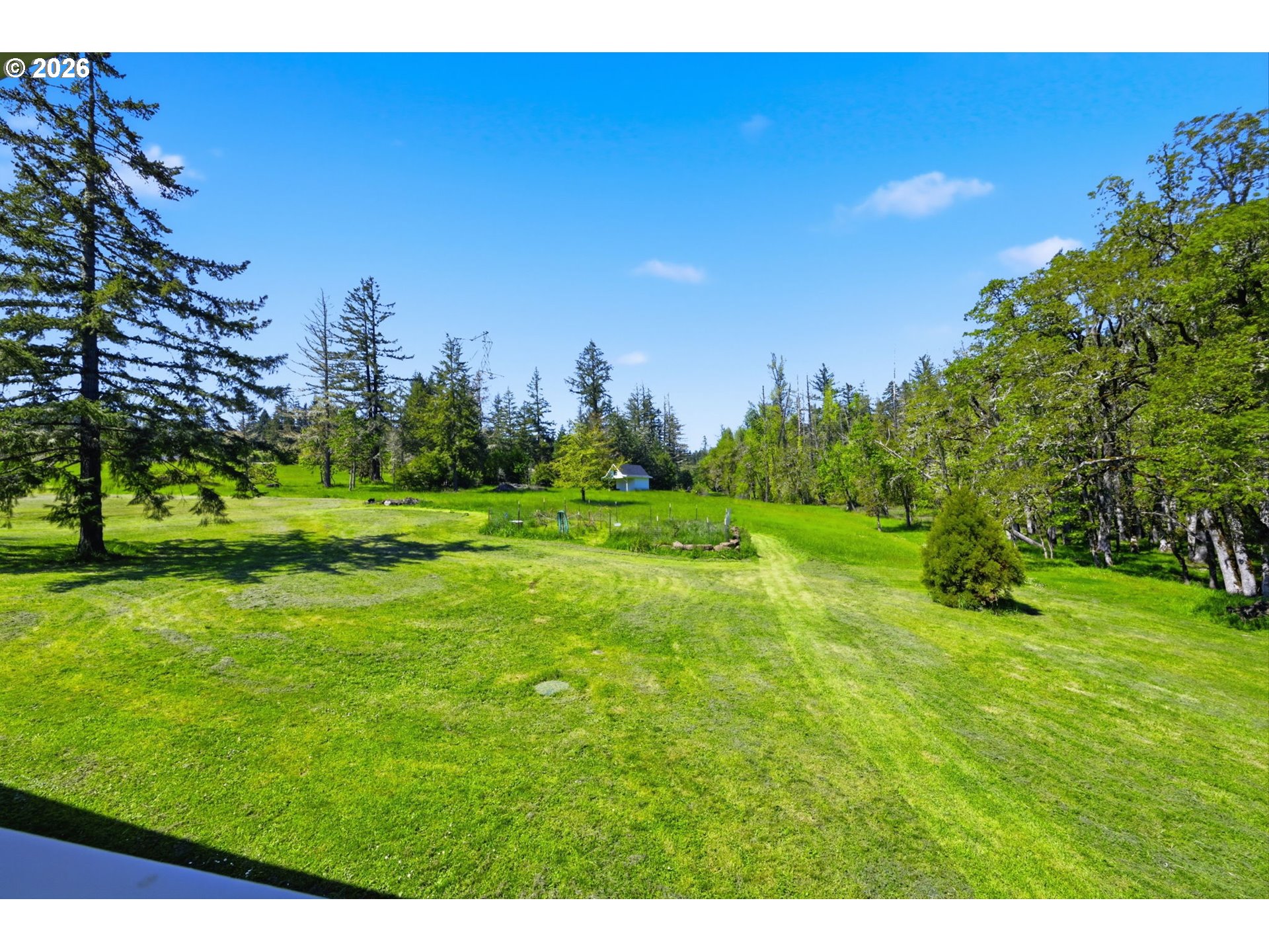Stunning Modern Farmhouse features a classic wrap-around porch and light-filled interior. Mostly main-level living showcases exquisite acacia wood flooring, complemented by detailed molding on abundant windows and doors. The thoughtfully designed floor plan offers excellent separation between the guest rooms and the primary suite. The gourmet kitchen features a leathered granite peninsula, extra deep farm sink, timeless subway tile backsplash, and a convenient pantry with pull-out shelves. Adjacent to the kitchen, the bright breakfast room catches the morning sun and includes soft-close cabinetry, an extended granite counter, hill views, and French doors for easy outdoor access. The generous family room adds drama with a vaulted ceiling, skylights, tall windows, French doors, and woodstove. The Primary suite boasts a separate bathtub and shower, dual sinks, walk-in closet with built-ins, and French doors leading to its own deck with views of the nearby creek and hills. Each of the 2 1/2 bathrooms and the laundry room have porcelain tile flooring and granite counters. Up the wide staircase, enjoy the very private den/office which could easily function as a large 4th bedroom, if a closet was added. The 466 square foot unfinished stand-up attic offers wonderful storage and/or expansion possibilities. Architectural amenities include an Arched Window, Front Shutters, Attached Flower Boxes, Mature Landscaping, Fruit Trees, and a Fenced Garden. Walk-in storage space, approximately 40'x 11' under the home, has electricity, plywood "floor", small shop space, and insulation. There is even more storage space under the side and back of the wrap-around decks. Additional abutting 5.44-acre parcel, Ridgetop Lot 15, RMLS #24641325, is available, for a total of more than 11 acres. Don't miss this opportunity to experience life in a truly beautiful home in one of South Eugene's premier neighborhoods! Contact your broker today to view.