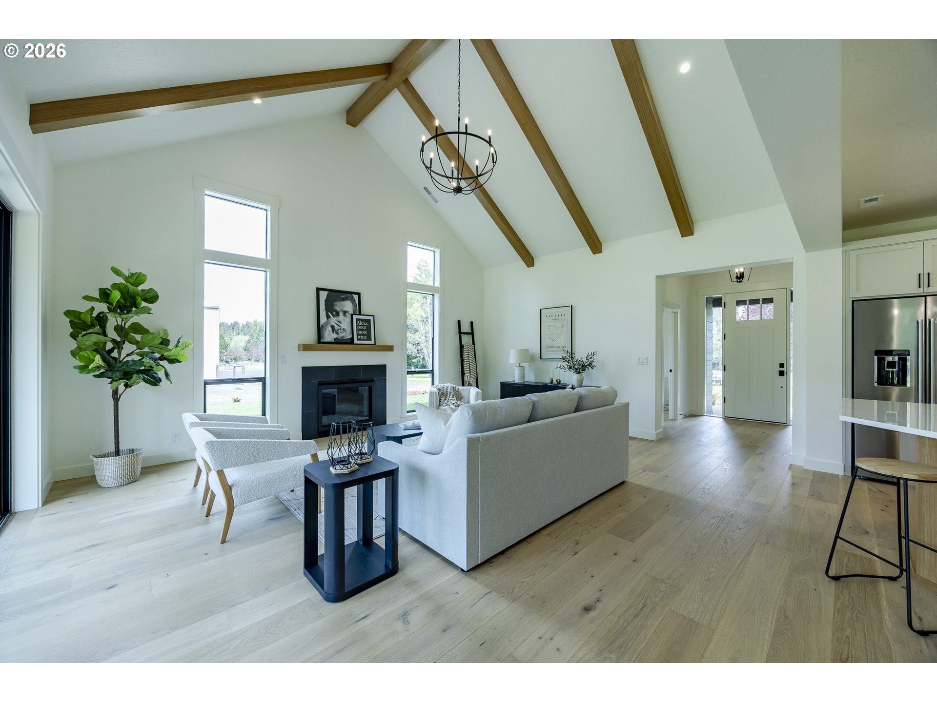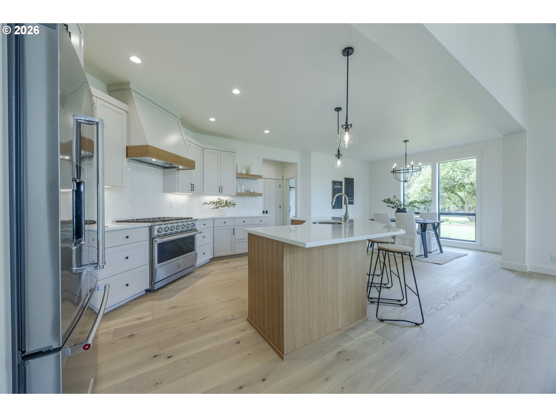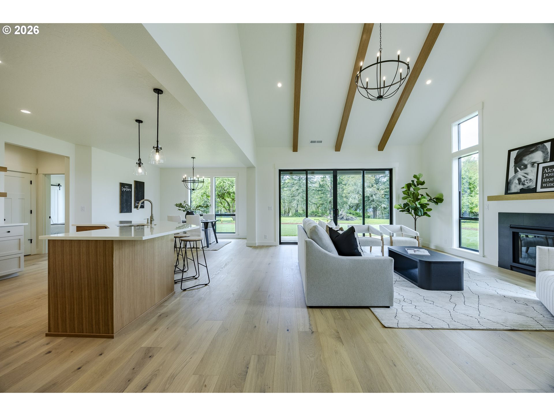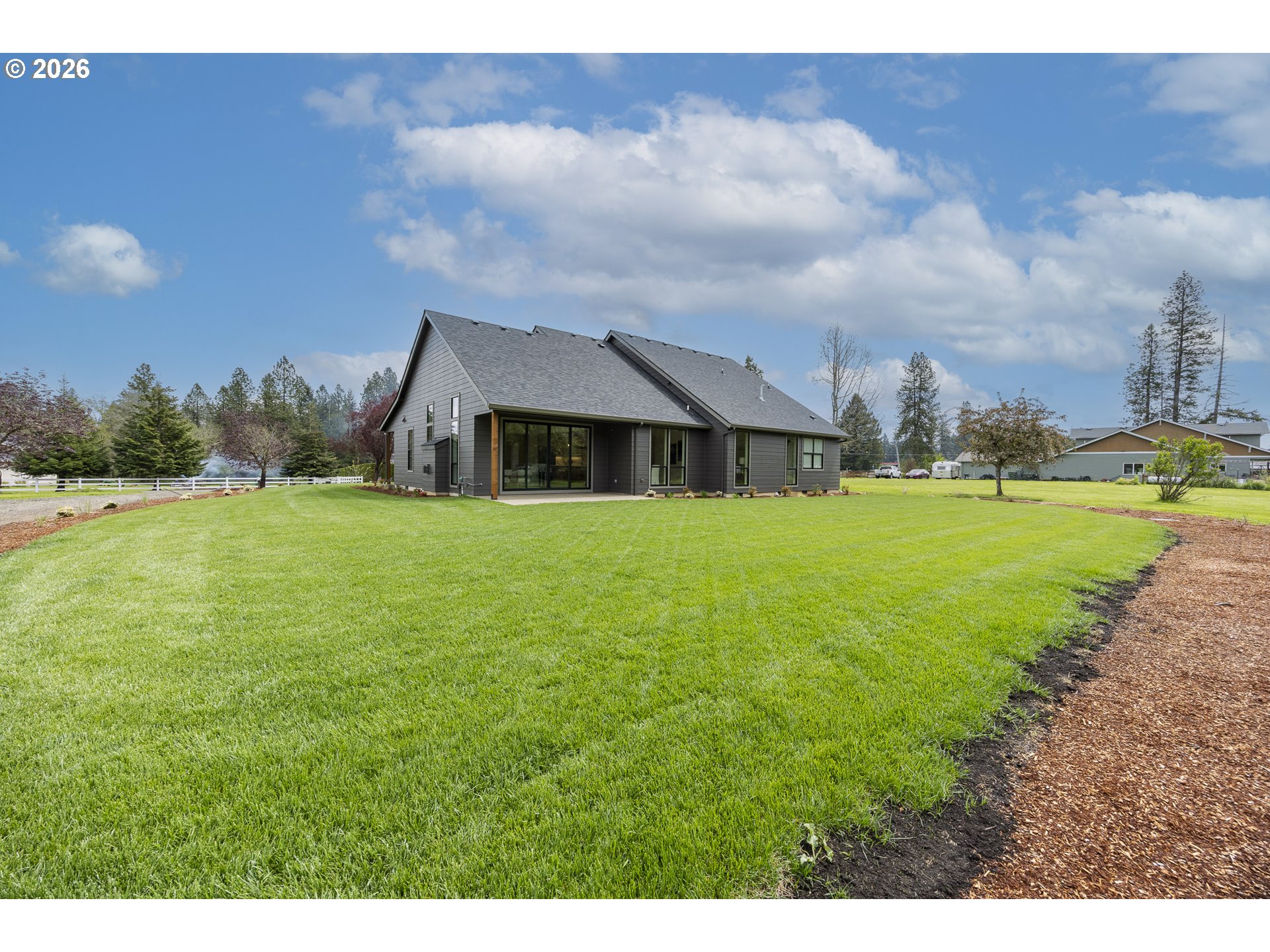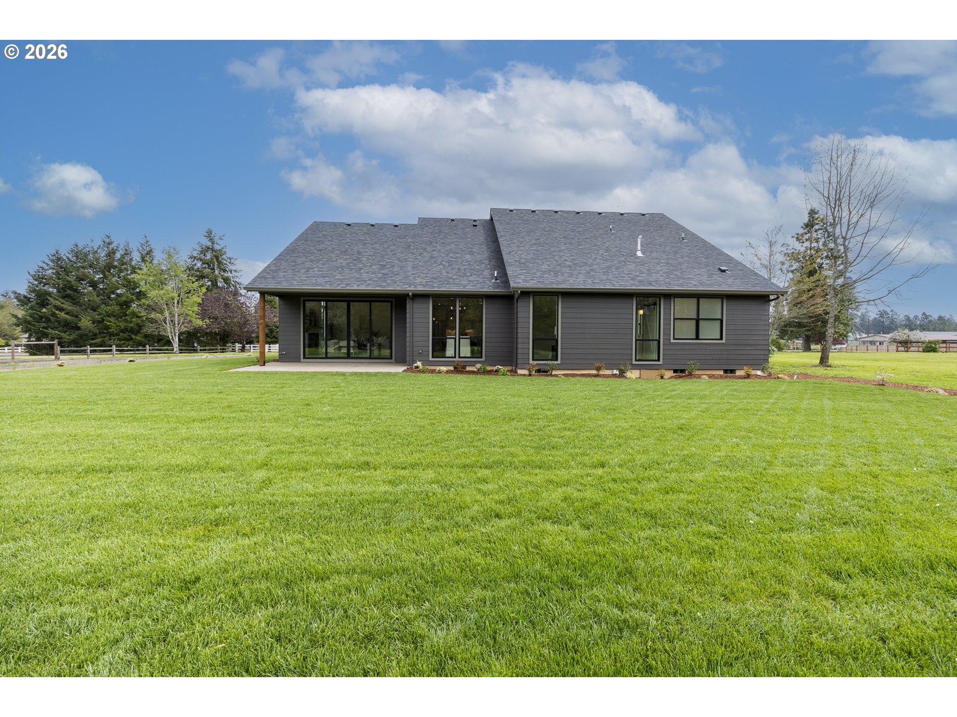 Tucked at the end of a quiet dead-end street in Veneta, this 2026 new construction by builder Bruce Weichert delivers the kind of quality you can feel the moment you walk through the door. Step inside to a striking entry. Just off the foyer, a thoughtfully placed office offers true separation—ideal for focused work or a little peace and quiet. Beyond that, the home opens up beautifully into a light-filled living and dining space that truly steals the show. Vaulted, beamed ceilings and floor-to-ceiling windows create a sense of volume and warmth, while the glass slider invites effortless indoor-outdoor living for summer evenings and weekend gatherings. The kitchen is designed to impress and perform. An oversized quartz island anchors the space, perfect for dining or entertaining, complemented by top-of-the-line KitchenAid appliances and a chef-worthy Hestan gas range. A dedicated dining area offers the perfect setting for more formal occasions. Privately positioned in its own wing at the back of the house, the primary suite is a true retreat with vaulted ceilings, a generous walk-in closet, a spa-like ensuite complete with soaking tub and walk in shower. Two additional main-level bedrooms, a full bathroom, a well-appointed laundry room with sink, storage, exterior access—and yes, a coveted Speed Queen set included—round out the main floor.Upstairs, a flexible bonus room, full bath, and additional bedroom create space for guests and hobbies.Every detail has been considered: tankless on-demand hot water, generator readiness, an extra-deep garage with storage, and a well pump house equipped with heat and power. Even future plans are accounted for, with septic and water lines already extended for a potential shop. This dreamy new build sits on a flat, usable 2-acre parcel—offering space, privacy, and possibility. This isn’t just a home; it’s your next chapter.