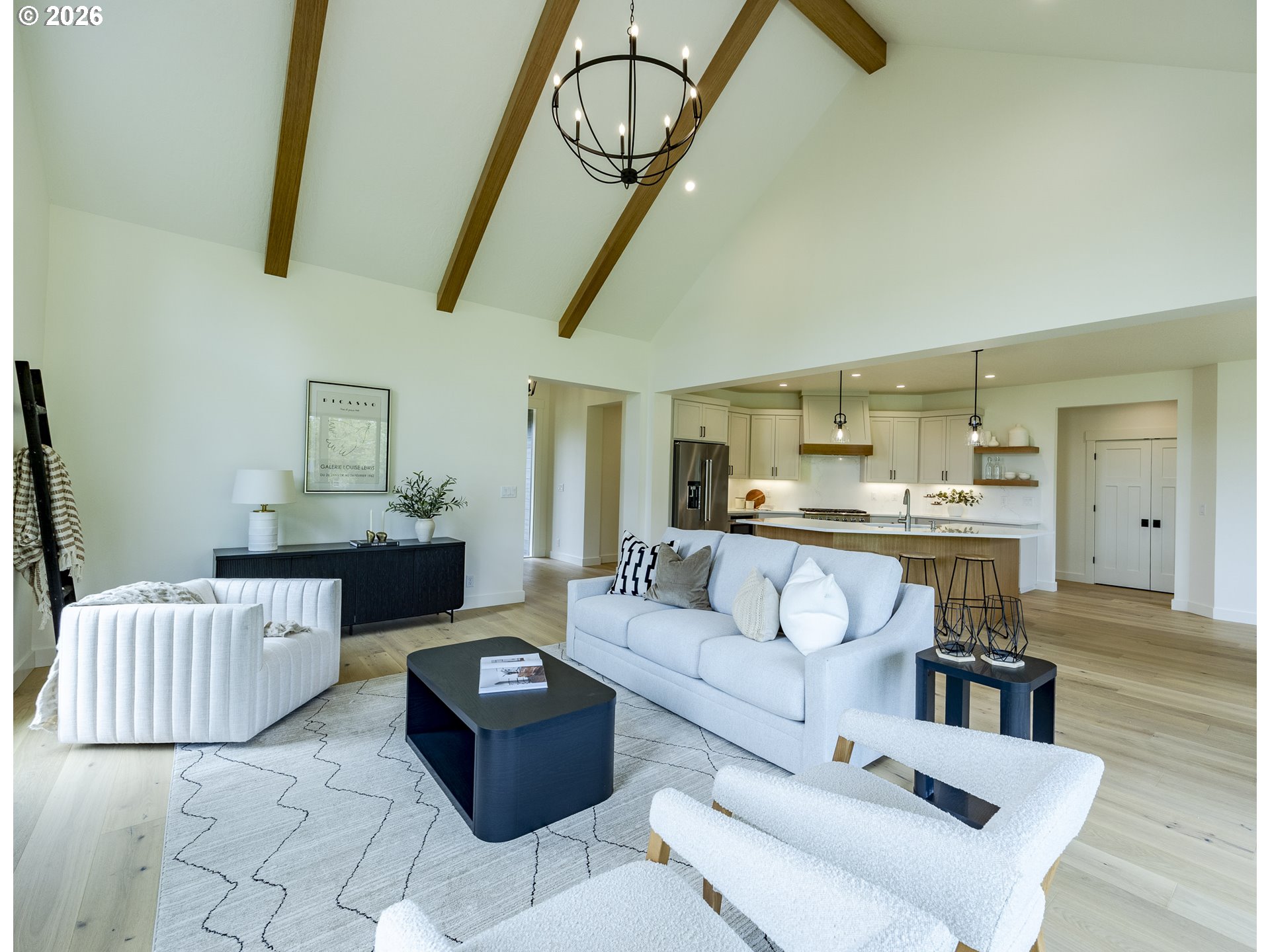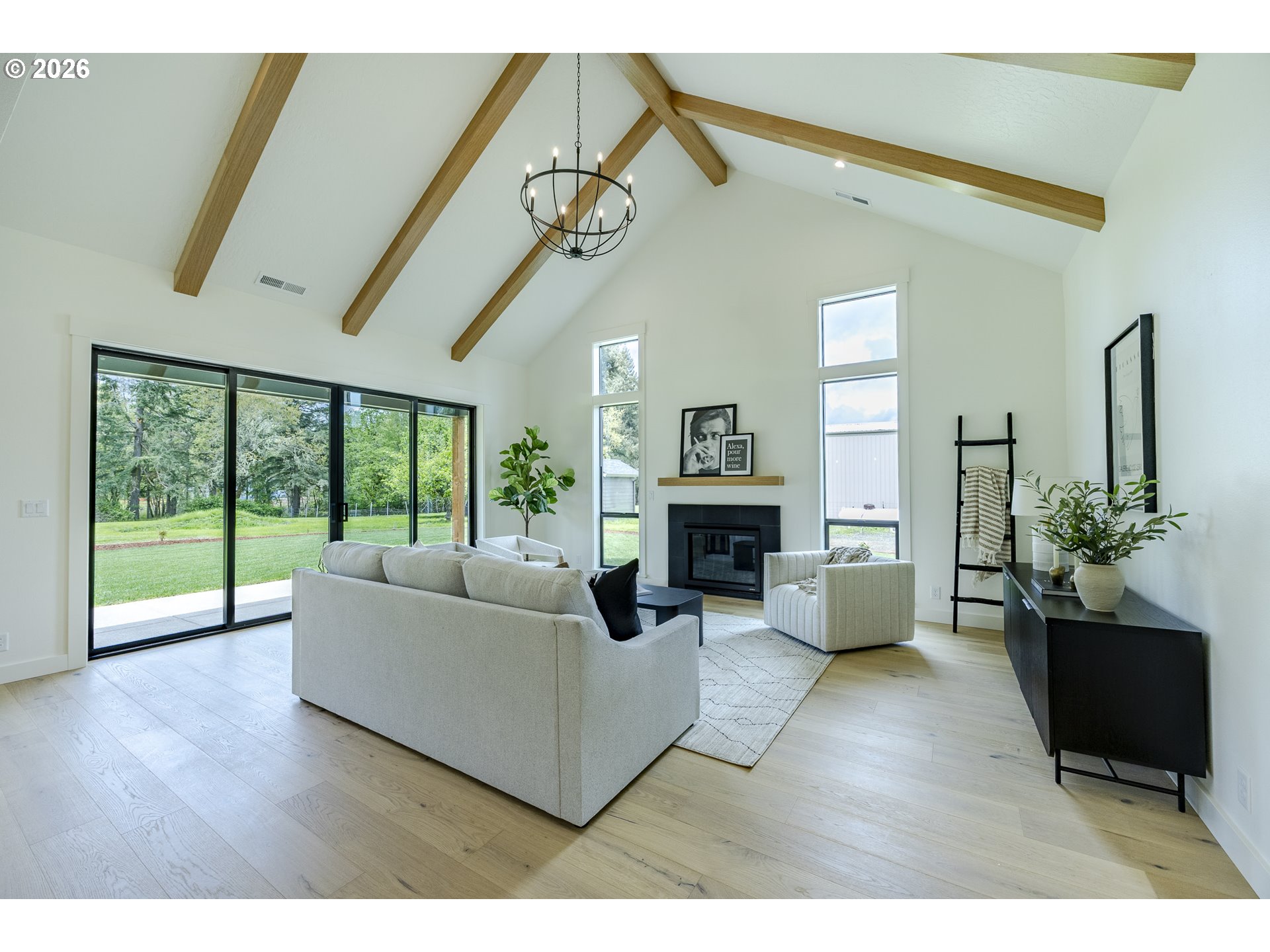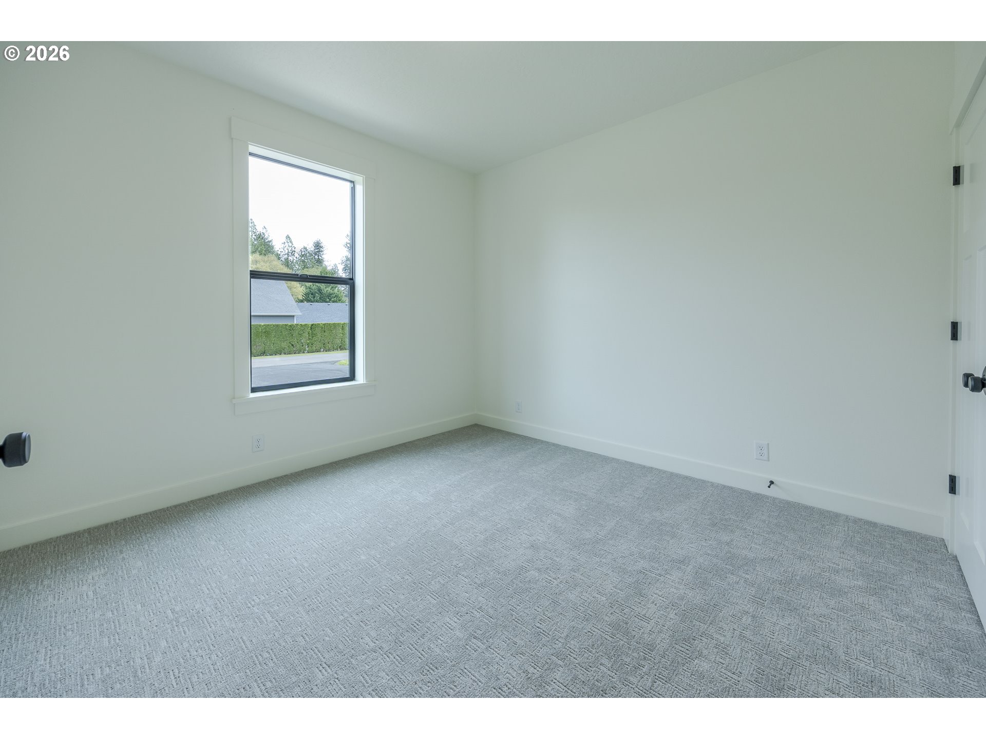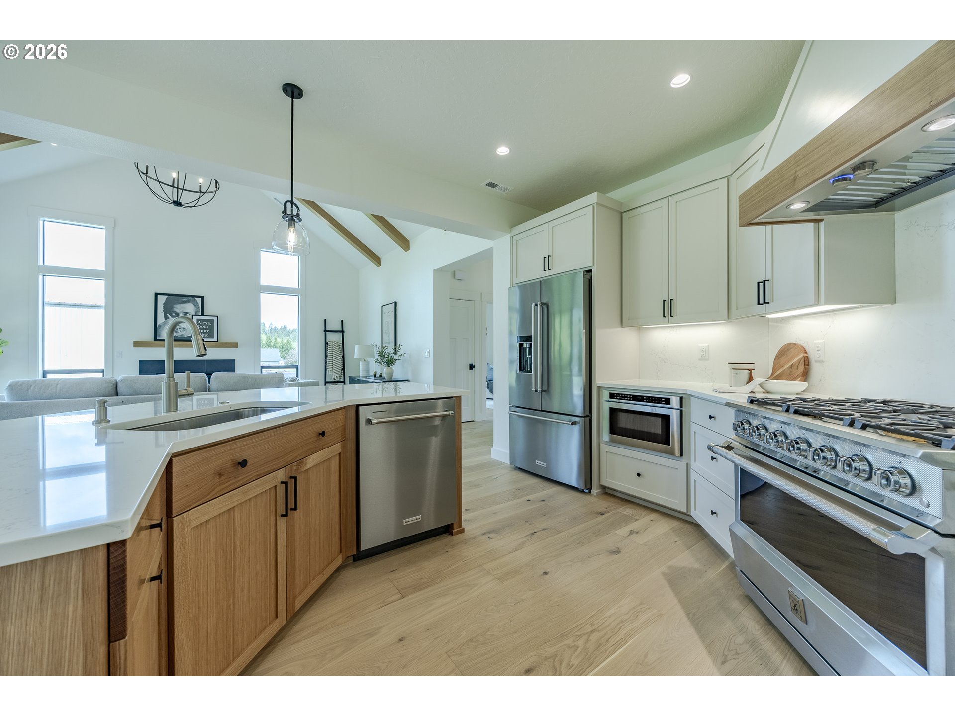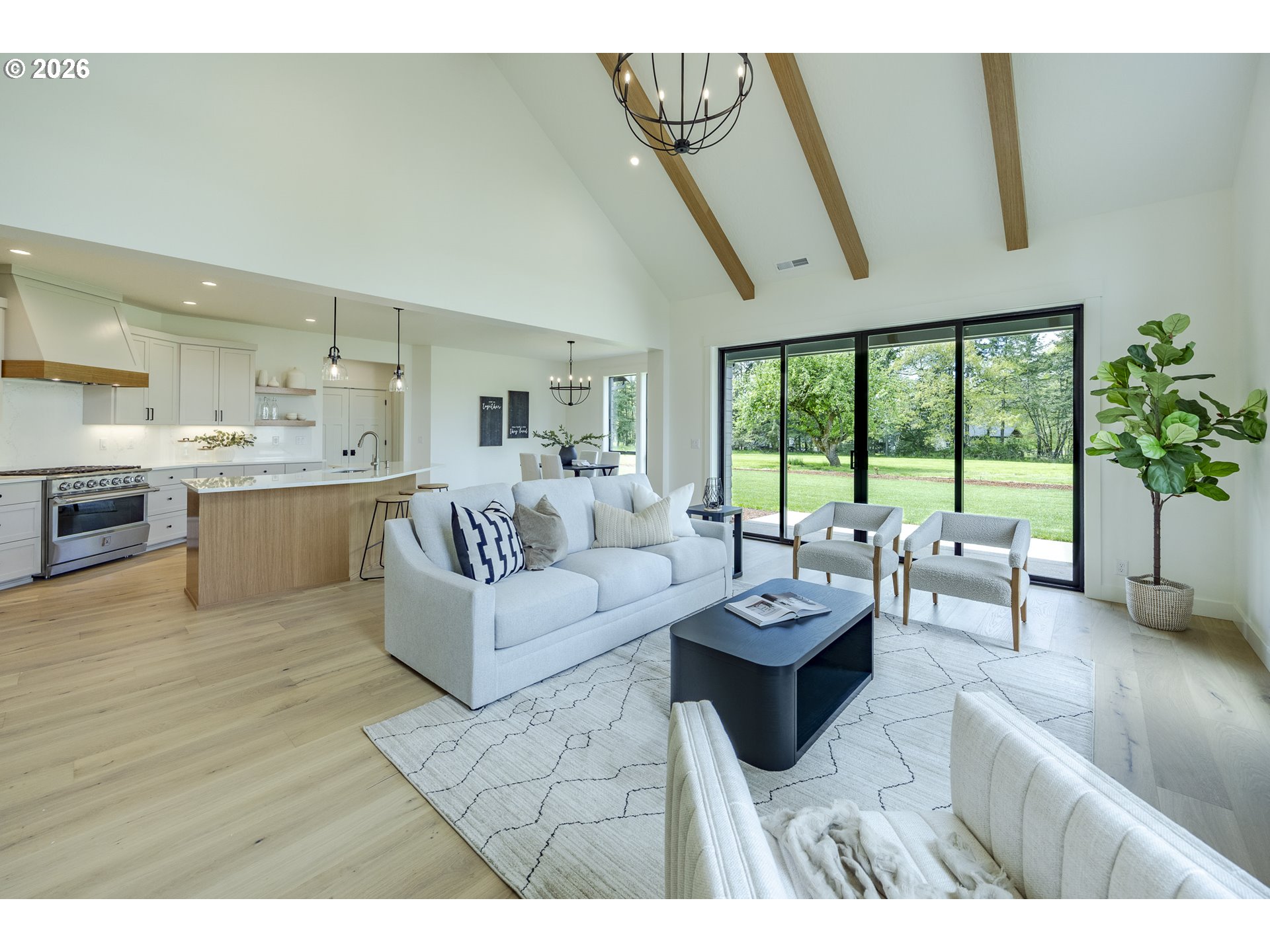 Tucked at the end of a quiet dead-end street in Veneta, this 2026 new construction by builder Bruce Weichert delivers the kind of quality you can feel the moment you walk through the door. Step inside to a striking entry. Just off the foyer, a thoughtfully placed office offers true separation—ideal for focused work or a little peace and quiet. Beyond that, the home opens up beautifully into a light-filled living and dining space that truly steals the show. Vaulted, beamed ceilings and floor-to-ceiling windows create a sense of volume and warmth, while the glass slider invites effortless indoor-outdoor living for summer evenings and weekend gatherings. The kitchen is designed to impress and perform. An oversized quartz island anchors the space, perfect for dining or entertaining, complemented by top-of-the-line KitchenAid appliances and a chef-worthy Hestan gas range. A dedicated dining area offers the perfect setting for more formal occasions. Privately positioned in its own wing at the back of the house, the primary suite is a true retreat with vaulted ceilings, a generous walk-in closet, a spa-like ensuite complete with soaking tub and walk in shower. Two additional main-level bedrooms, a full bathroom, a well-appointed laundry room with sink, storage, exterior access—and yes, a coveted Speed Queen set included—round out the main floor.Upstairs, a flexible bonus room, full bath, and additional bedroom create space for guests and hobbies.Every detail has been considered: tankless on-demand hot water, generator readiness, an extra-deep garage with storage, and a well pump house equipped with heat and power. Even future plans are accounted for, with septic and water lines already extended for a potential shop. This dreamy new build sits on a flat, usable 2-acre parcel—offering space, privacy, and possibility. This isn’t just a home; it’s your next chapter.