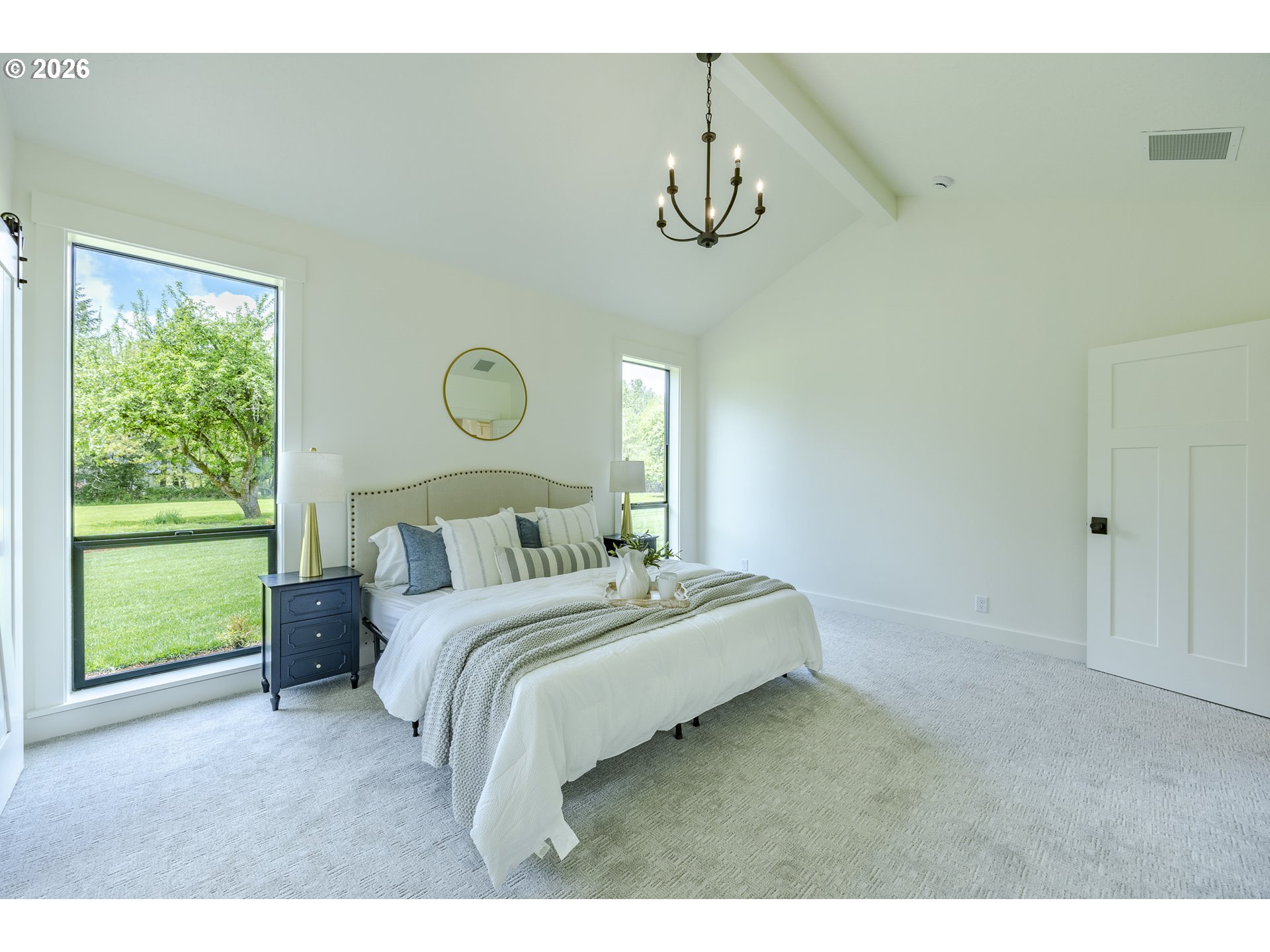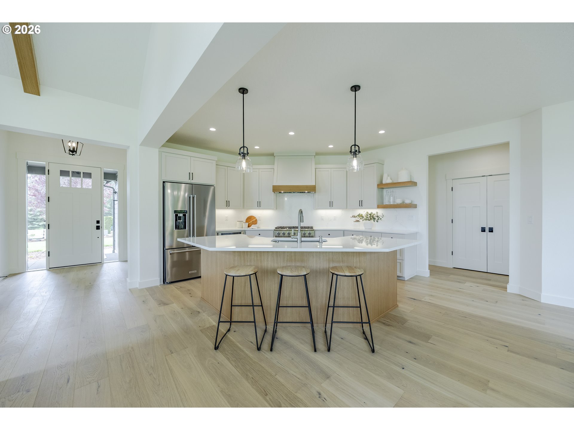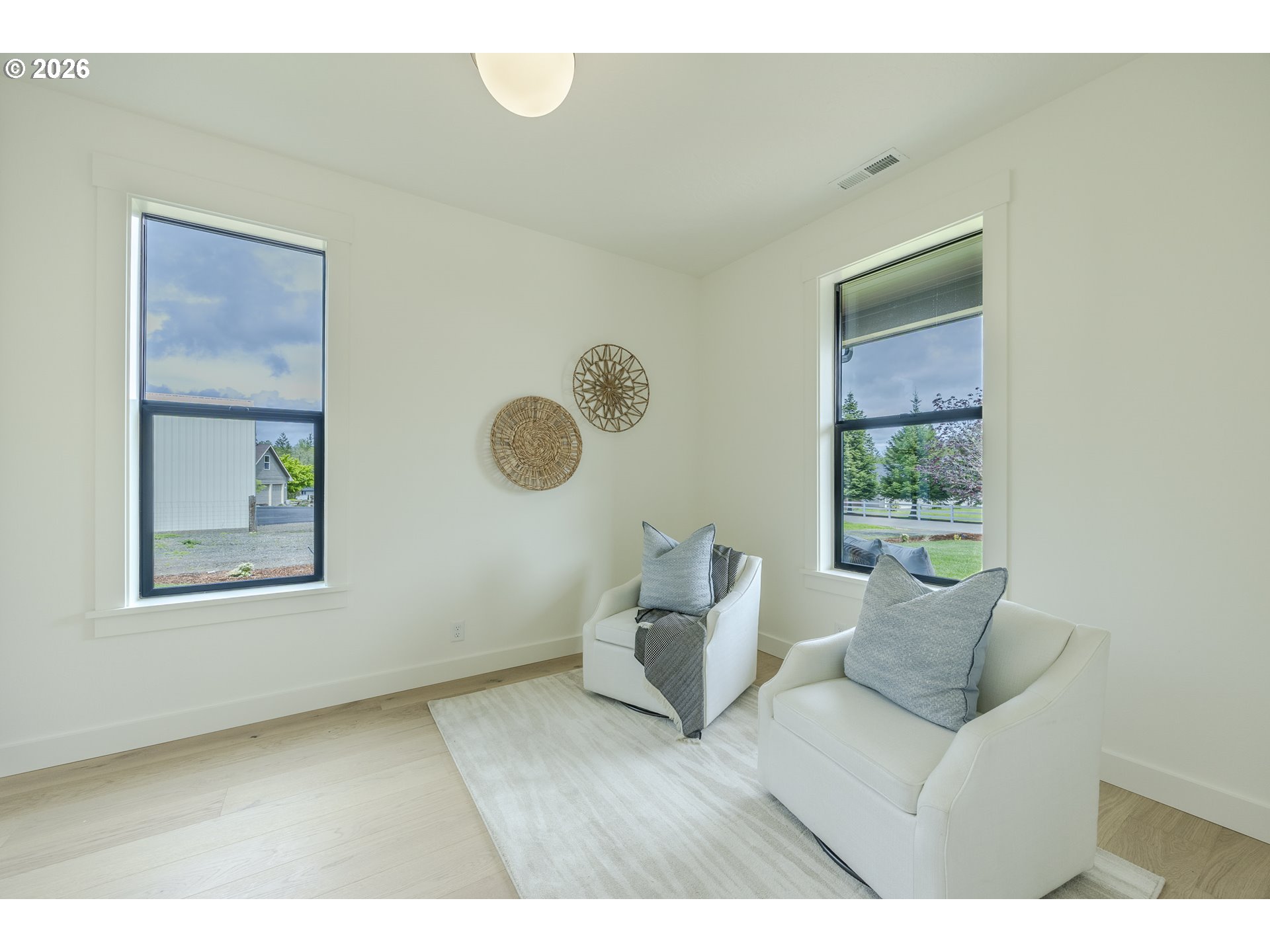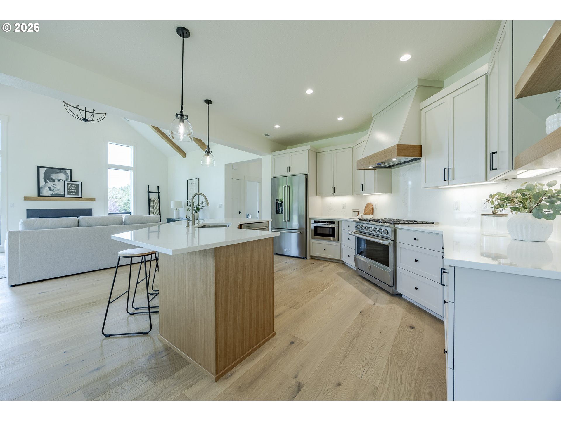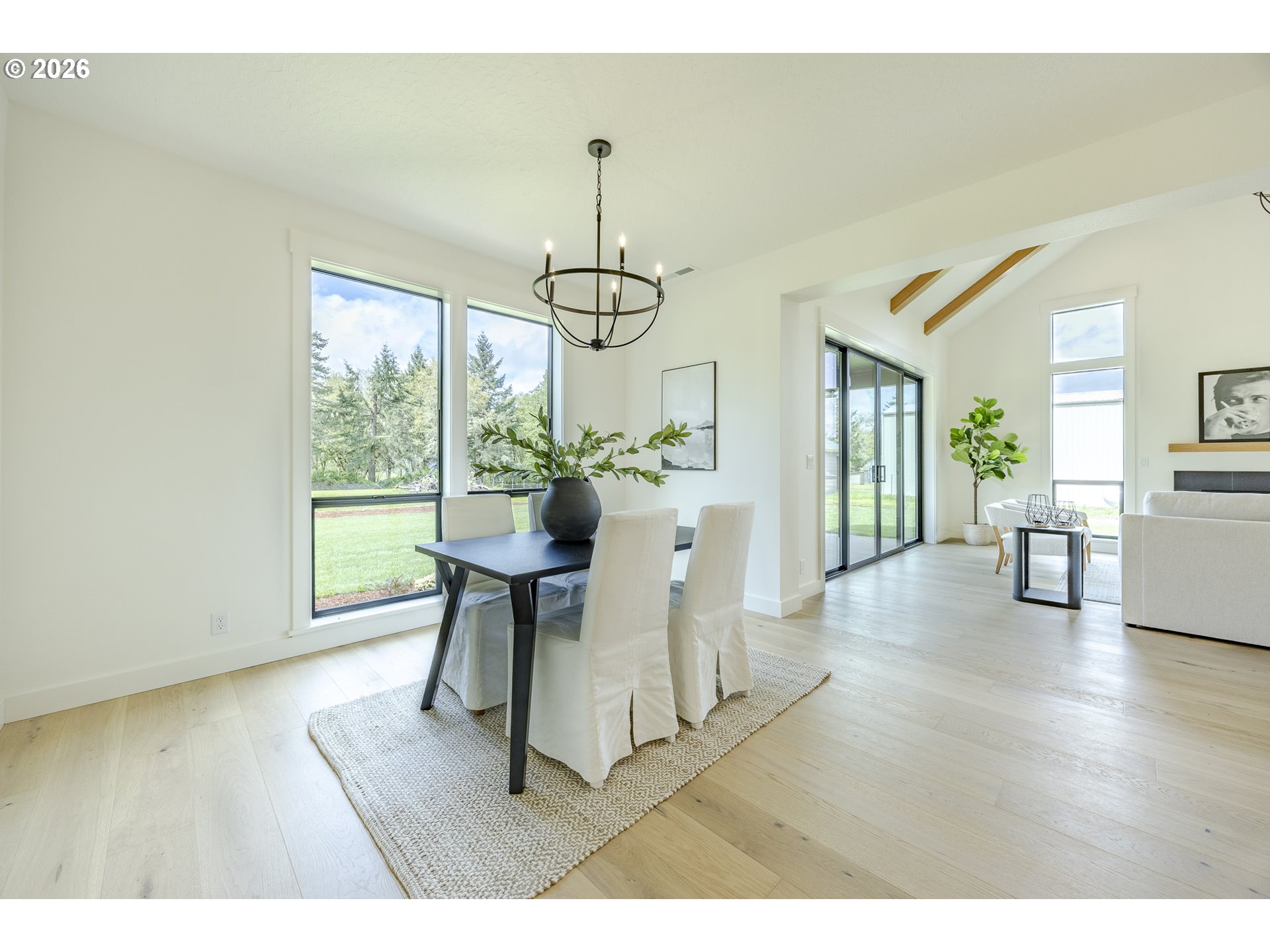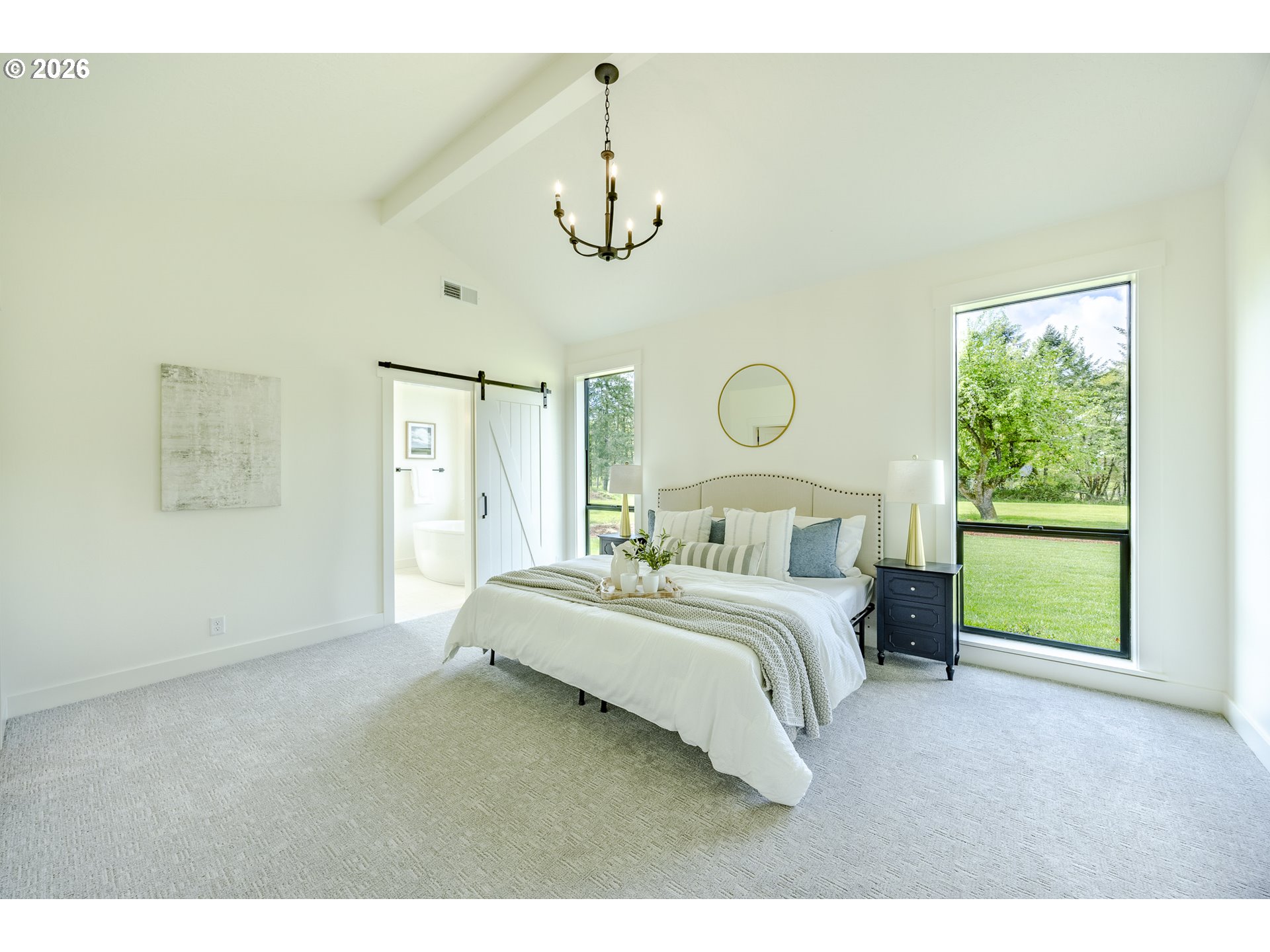 Tucked at the end of a quiet dead-end street in Veneta, this 2026 new construction by builder Bruce Weichert delivers the kind of quality you can feel the moment you walk through the door. Step inside to a striking entry. Just off the foyer, a thoughtfully placed office offers true separation—ideal for focused work or a little peace and quiet. Beyond that, the home opens up beautifully into a light-filled living and dining space that truly steals the show. Vaulted, beamed ceilings and floor-to-ceiling windows create a sense of volume and warmth, while the glass slider invites effortless indoor-outdoor living for summer evenings and weekend gatherings. The kitchen is designed to impress and perform. An oversized quartz island anchors the space, perfect for dining or entertaining, complemented by top-of-the-line KitchenAid appliances and a chef-worthy Hestan gas range. A dedicated dining area offers the perfect setting for more formal occasions. Privately positioned in its own wing at the back of the house, the primary suite is a true retreat with vaulted ceilings, a generous walk-in closet, a spa-like ensuite complete with soaking tub and walk in shower. Two additional main-level bedrooms, a full bathroom, a well-appointed laundry room with sink, storage, exterior access—and yes, a coveted Speed Queen set included—round out the main floor.Upstairs, a flexible bonus room, full bath, and additional bedroom create space for guests and hobbies.Every detail has been considered: tankless on-demand hot water, generator readiness, an extra-deep garage with storage, and a well pump house equipped with heat and power. Even future plans are accounted for, with septic and water lines already extended for a potential shop. This dreamy new build sits on a flat, usable 2-acre parcel—offering space, privacy, and possibility. This isn’t just a home; it’s your next chapter.