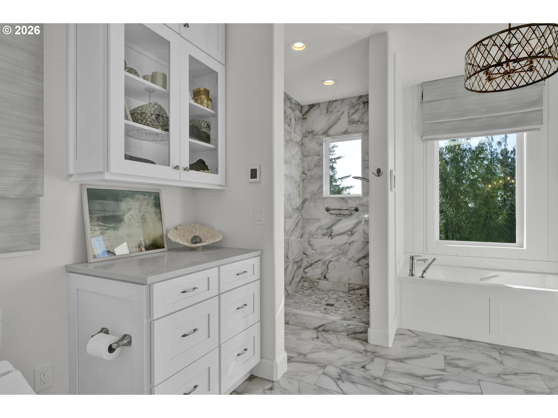 Built in 2020, this custom Ocean View residence captures panoramic, majestic views of forest, dunes, and the Pacific Ocean from expansive picture windows in the living room, dining area, kitchen, primary suite, and even the primary bath. Designed with exquisite attention to detail, the home features 9-foot ceilings and luxury plank vinyl flooring throughout, creating a seamless and sophisticated aesthetic.An oversized covered front porch welcomes you inside to a light-filled, open-concept living space. The living room offers custom built-ins and a striking modern wall-mounted fireplace, while a door leads to the view deck overlooking meticulously landscaped grounds bursting with seasonal color. The kitchen is truly exceptional, appointed with stone countertops and dramatic floor-to-ceiling custom cabinetry in a beautiful two-tone light and dark finish—both functional and stunning.The primary suite is a private retreat with a walk-in closet complete with organizers and a spa-inspired bath featuring a walk-in tile shower, separate soaking tub, heated floors and dual sinks—all positioned to take in those incredible views. A second bedroom provides comfortable guest accommodations, and the third has built-ins and is currently used as an office. A second full bath with soaking tub for guests also provides heated floors.The lower level expands the living possibilities with a covered patio and French doors leading to a finished space currently used as a wine room, plus an additional unfinished basement area ideal for storage. The Homeowners Association includes access to a community dock and common area on Mercer Lake, adding to the lifestyle appeal.Being sold furnished with quality pieces and household items, this is a truly turnkey opportunity—an exceptional coastal home where craftsmanship, comfort, and unforgettable views come together beautifully.