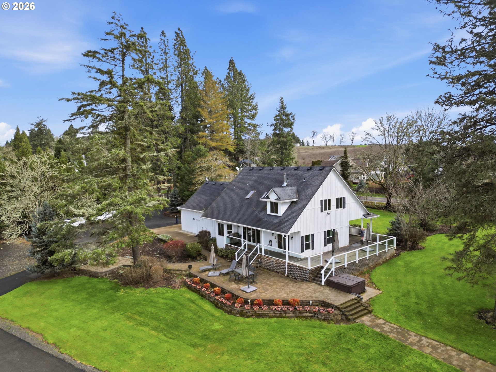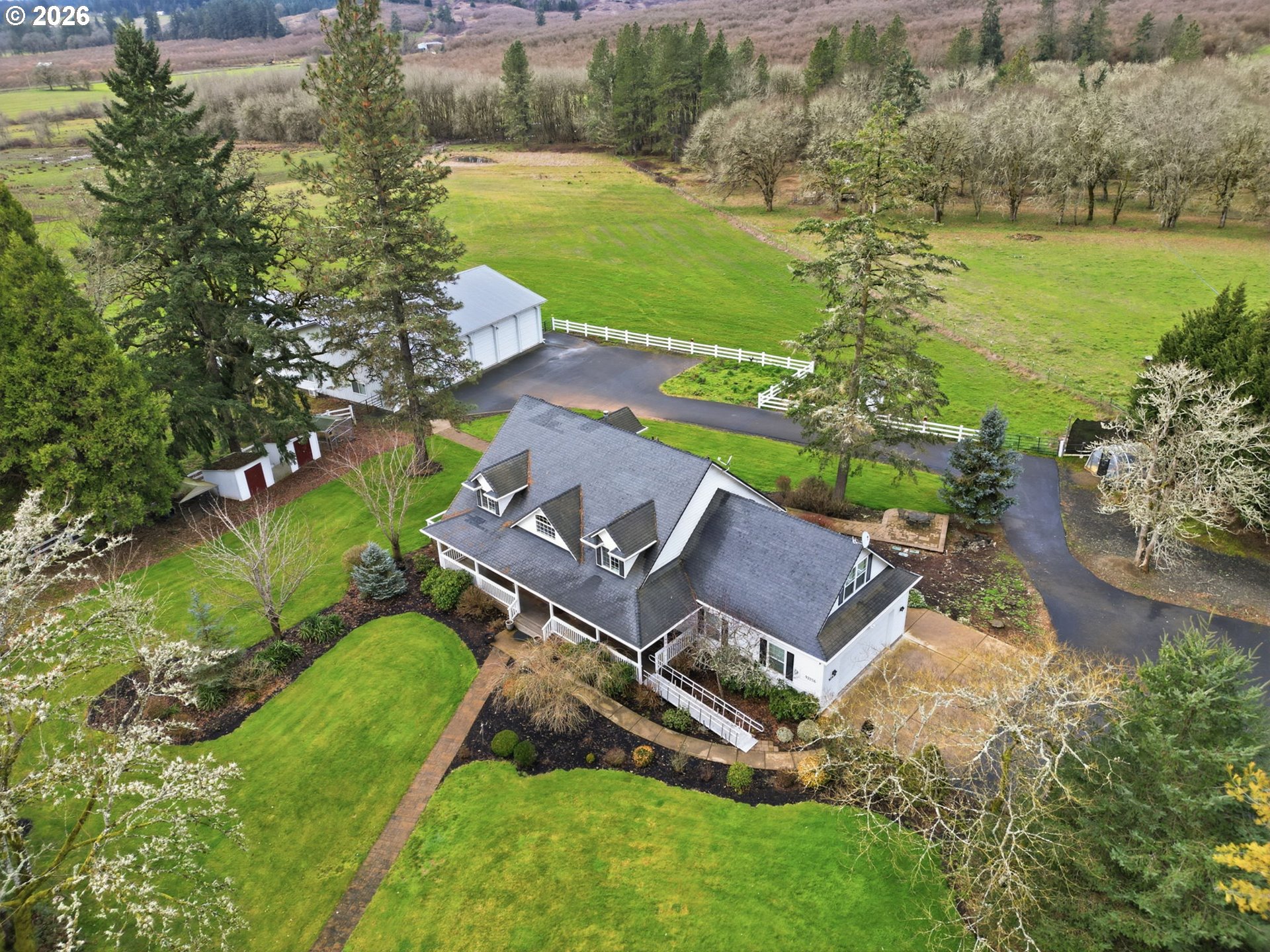 Custom built home on over 8 acres in a highly desirable location along the scenic Territorial Wine Corridor, offering privacy, usable land, and convenient access to town and Eugene. Set in a private park-like setting with gated driveway, classic dormer windows, and a welcoming covered wraparound front deck, this property combines timeless design with functional rural living. Inside, vaulted ceilings, skylights, and expansive windows create abundant natural light and beautiful views throughout. Features include hardwood flooring, extensive custom built-ins, propane fireplace, remote-controlled blinds, central vacuum system, formal dining, and a breakfast nook. The kitchen is thoughtfully designed with granite countertops, island with eat bar, stainless appliances, propane double-oven range, built-in microwave, beverage refrigerator, barn-door walk-in pantry, and generous storage.The main-level primary suite offers high ceilings, large windows, walk-in closet with built-ins, and spacious bath with dual vanity and walk-in shower. Upstairs includes three additional bedrooms—all with walk-in closets—including an ensuite, plus a large bonus room ideal for office, media, or flex space. Improvements include refinished custom flooring, upgraded exterior doors, improved well system, water softener, new water heater with expansion tank, and LeafGuard gutter system. Outdoor amenities include over an acre of fenced yard with hot tub, expansive deck, paver patio, sprinkler system, greenhouse, raised garden beds, grapes, dog kennel area, and mature landscaping. Over seven acres of fenced pasture are ready for livestock with hay barn and covered cattle/horse area. The impressive 72x50 shop features concrete floors, ductless heat pump, high ceilings, four roll-up doors, and a fifth bay for equipment, plus ample RV and boat parking.A rare opportunity to enjoy acreage, infrastructure, and lifestyle in wine country.