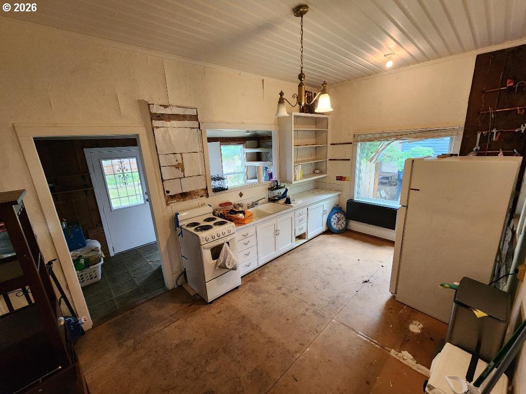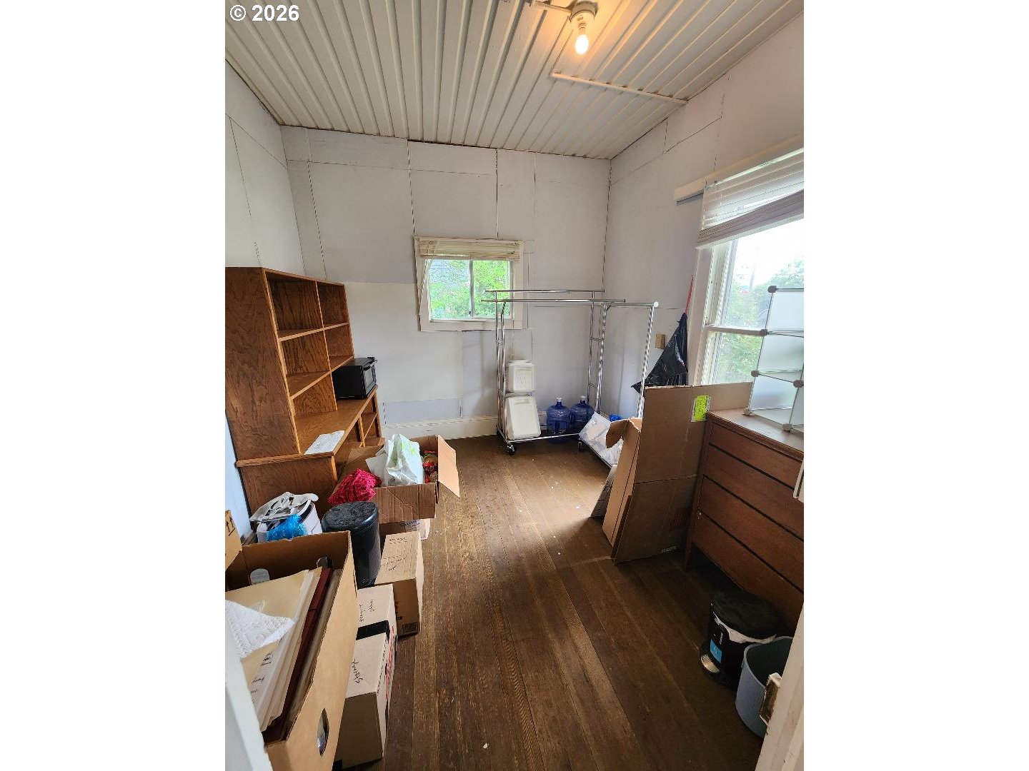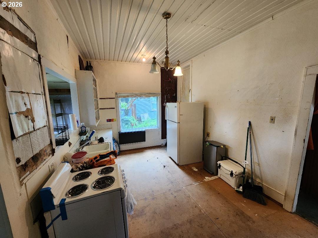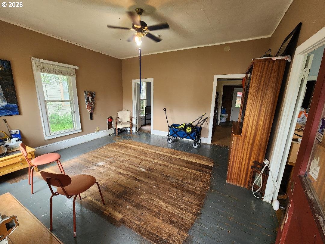 Fixer-upper Danish-style farmhouse in Junction City! The home is on a nice block foundation with plenty of life in the roof. It's ready for your updates and vision. Features include 9 1/2 ft ceilings, a 10x30 storage shed, fenced backyard with alley access, and walkable proximity to shops and restaurants. 3rd room space is an upstairs large unfinished area without closet or window. Zoned General Commercial (GC), providing potential for residential or business use (buyer to verify). Needs TLC, a heat source, and electrical panel update. Great opportunity for investors or buyers looking to customize!