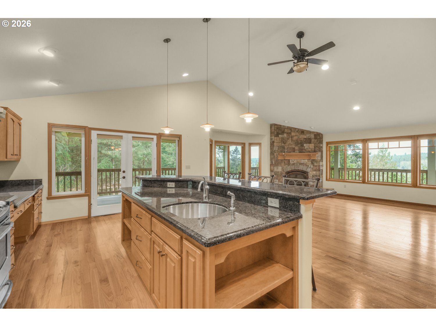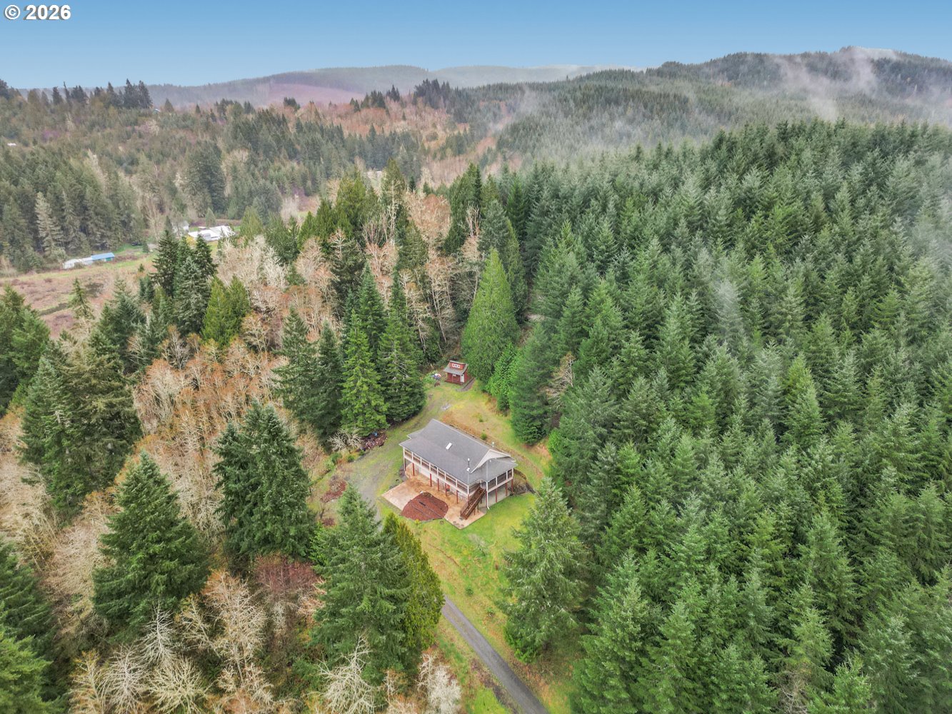 Perched atop 3.62 private acres, this exceptional property offers sweeping views over the treetops and a peaceful setting surrounded by nature. The home sits well off the road, creating a sense of seclusion while still being just minutes from town. Mature forest blends beautifully into open grassy meadows, with established rhododendrons and a variety of fruit trees including pear and apple. Adjacent to Port Blakely Tree Farm, the neighboring land provides added privacy with minimal nearby development. Designed for both comfort and style, the custom-built home features high-end finishes throughout. The open-concept main level showcases real hardwood flooring, soaring vaulted ceilings, and a stunning living room with built-in cabinetry, a sunny bay window and a gas fireplace with natural rock surround. The chef’s kitchen is equipped with granite countertops, stainless steel appliances, custom cabinetry, an island with an eat bar and french doors to the covered deck, making it perfect for entertaining. The primary suite offers a true retreat with a large jetted tub, oversized walk-in closet, and French doors leading to the covered wrap-around deck where you can enjoy the serene surroundings. The lower level includes two additional spacious bedrooms, one featuring a cozy wood stove and French doors, along with a full guest bath and an expansive laundry room with lots of storage. Additional highlights include a private well with its own water system, sprinkler system for landscaping, a new storage shed at the top of the property, and a recently installed tankless water heater. Wrought iron fencing and gates are currently being added for enhanced privacy and security. Enjoy the best of country living with the convenience of being just 10 minutes from dining, shopping, parks, and Providence Centralia Hospital.