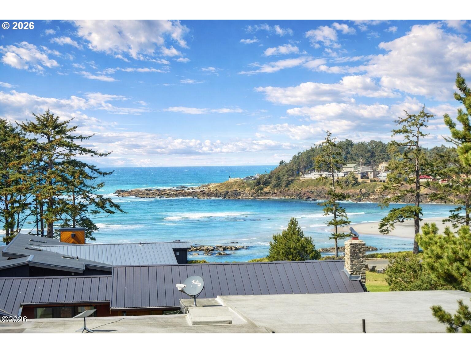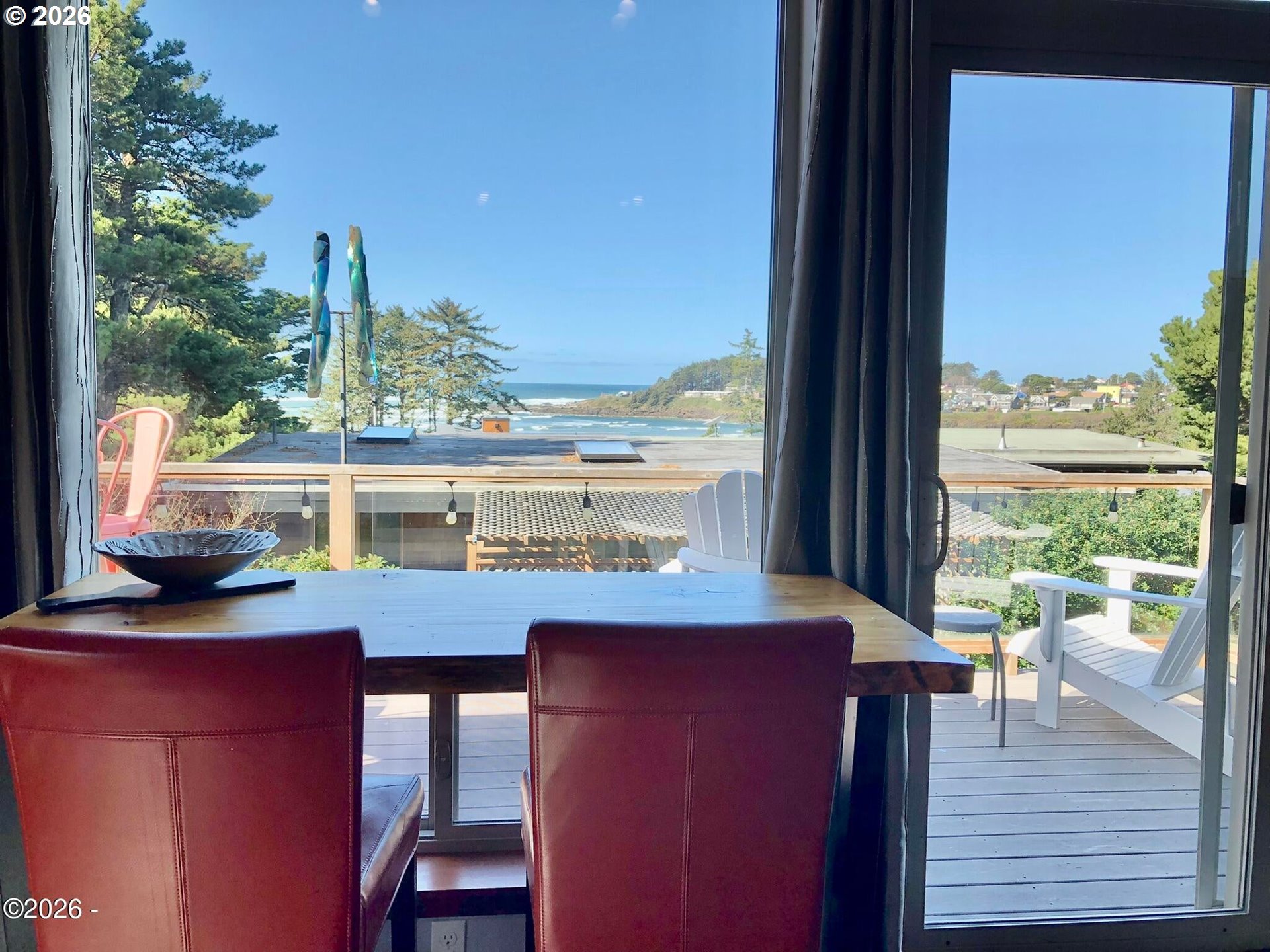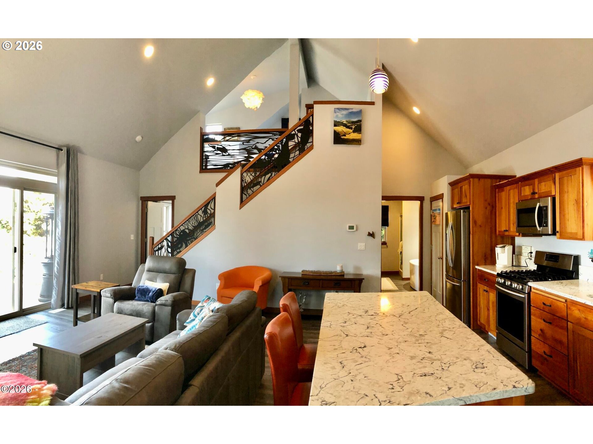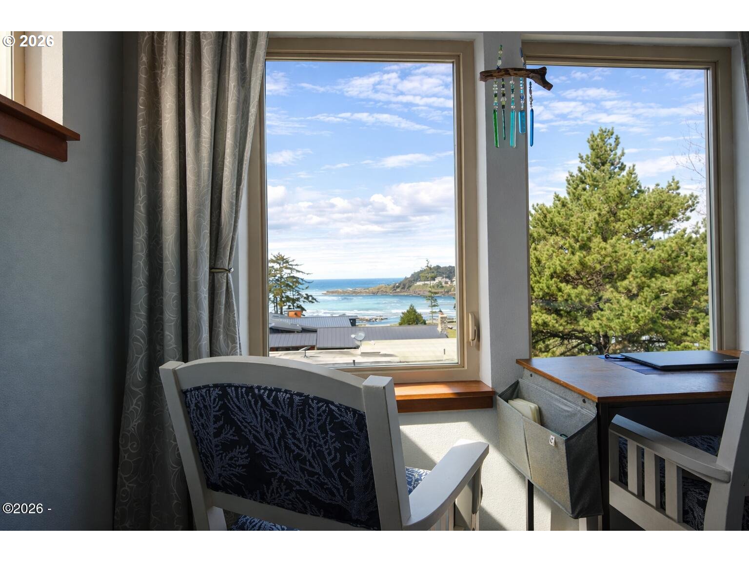 Ocean, bay, and rocky shoreline views define this exceptional coastal retreat. From the main living area and deck, enjoy ever-changing scenery—whales migrating, surfers riding the swell, and stunning sunsets that transition into evenings filled with distant boat lights and the soothing sound of the ocean. Built in 2016 and located just west of Hwy 101, this private 3-level home sits approximately one block from the shoreline and includes a deeded walking easement to Ocean Road with access to a sandy beach. A protected view corridor helps preserve the sweeping vistas. The main level features vaulted ceilings, expansive west-facing windows, and a floor-to-ceiling stone gas fireplace that anchors the space. The kitchen offers quartz countertops, cherry cabinetry, a large island, and a gas range—ideal for cooking and gathering. A custom staircase railing with an ocean-inspired design adds a unique architectural touch. The primary suite showcases both ocean and bay views and includes a soaking tub with water views, double shower, quartz vanity, and cherry cabinetry. The entry level provides a spacious guest bedroom, full bath with double shower, and access to the attached two-car garage with laundry and additional shop space. RV/boat parking is also available. The loft above provides flexible sleeping space, a half bath, and a vantage point to enjoy fireworks and the setting moon over Yachats Bay. Additional features include central heat and A/C, on-demand hot water, excellent insulation, and chair lift wiring. An outdoor hot/cold faucet is perfect after beach outings. The loft offers flexible sleeping space, a half bath, and elevated views.The landscaped yard includes hydrangeas, crocosmia, raised beds, and mature cedar trees. A detached studio (built 2023) with electricity and Wi-Fi is ideal for creative use. Located on a quiet dead-end street, this home offers privacy, natural beauty, and coastal living at its finest. Offered furnished if desired.