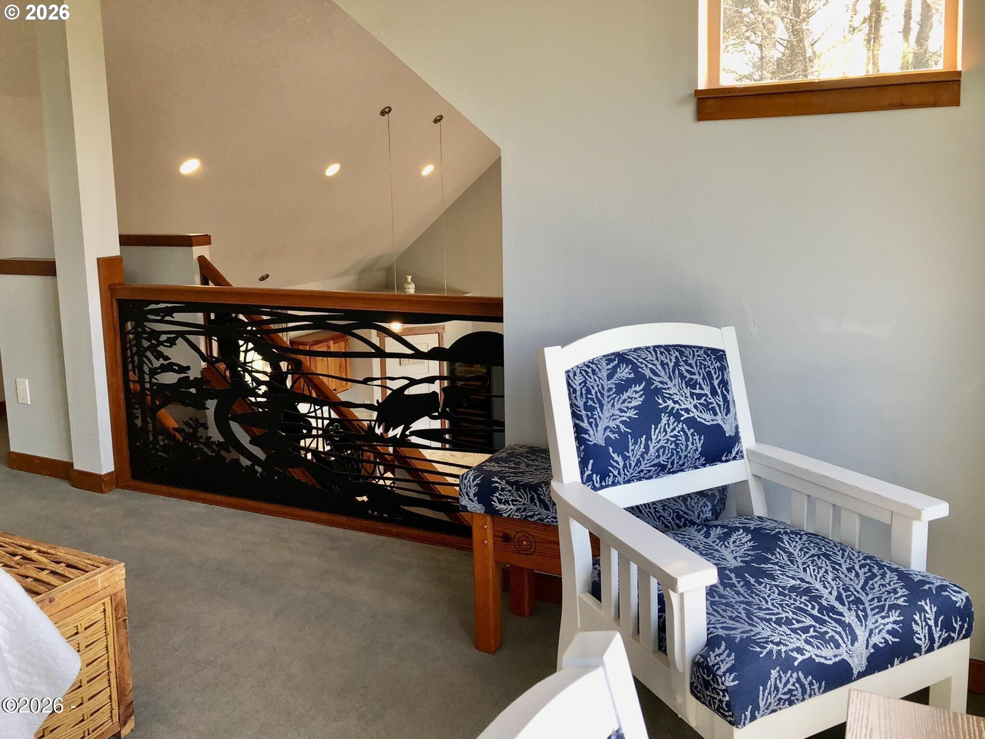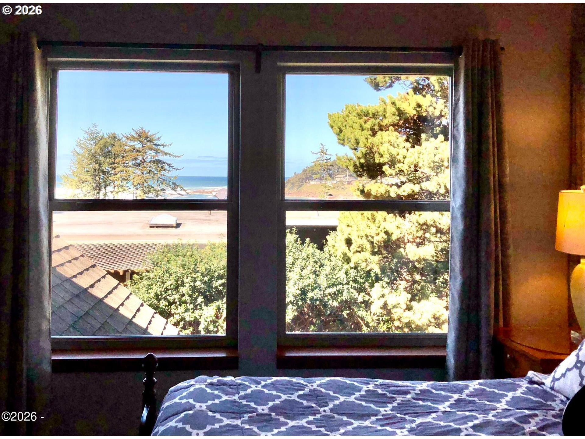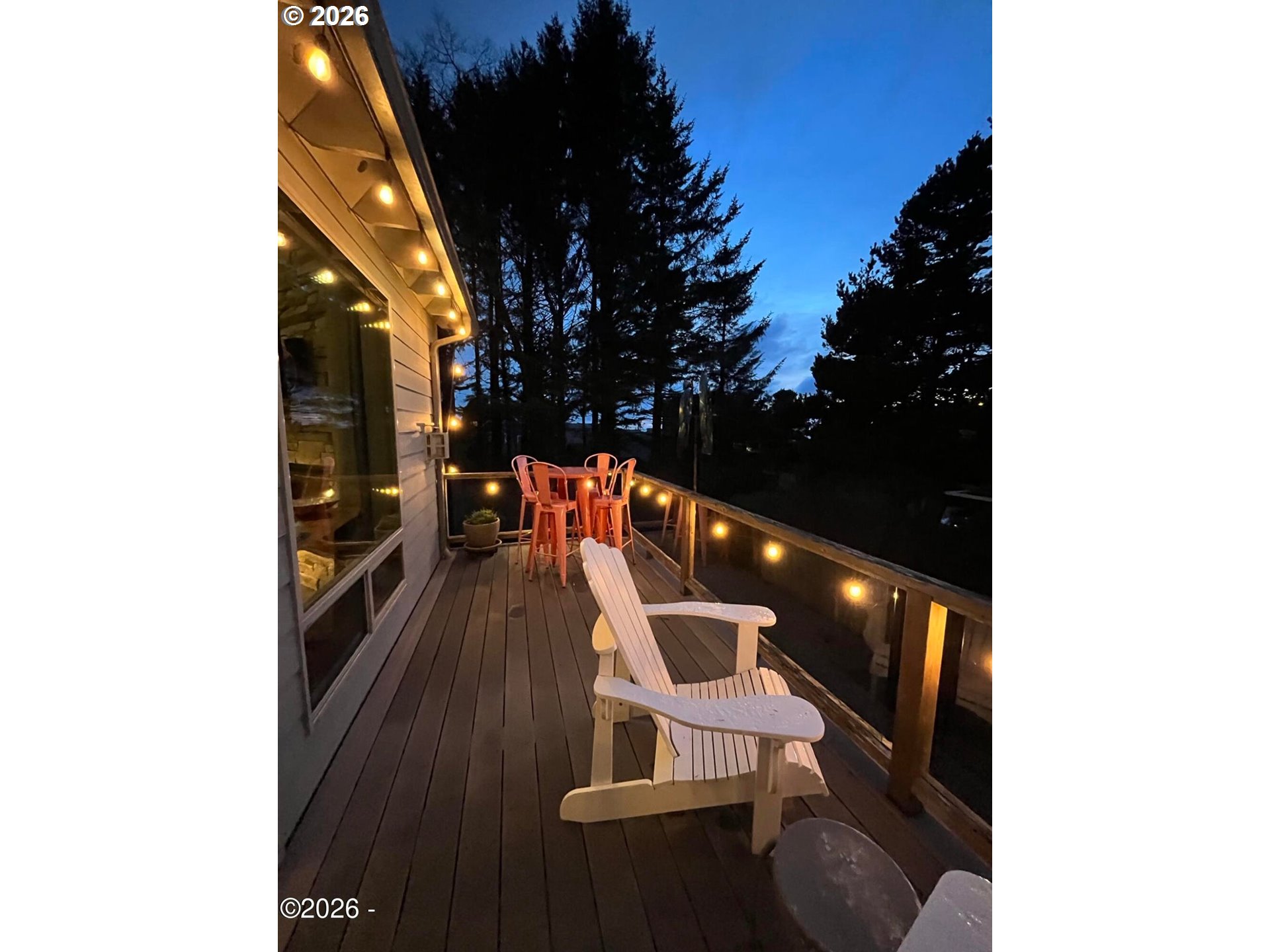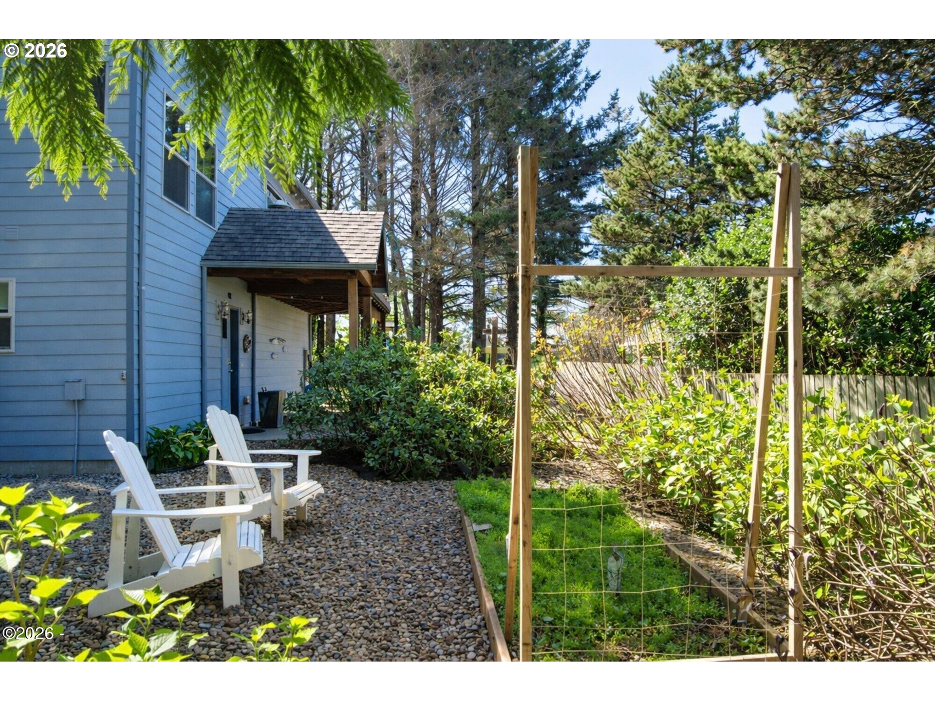 Ocean, bay, and rocky shoreline views define this exceptional coastal retreat. From the main living area and deck, enjoy ever-changing scenery—whales migrating, surfers riding the swell, and stunning sunsets that transition into evenings filled with distant boat lights and the soothing sound of the ocean. Built in 2016 and located just west of Hwy 101, this private 3-level home sits approximately one block from the shoreline and includes a deeded walking easement to Ocean Road with access to a sandy beach. A protected view corridor helps preserve the sweeping vistas. The main level features vaulted ceilings, expansive west-facing windows, and a floor-to-ceiling stone gas fireplace that anchors the space. The kitchen offers quartz countertops, cherry cabinetry, a large island, and a gas range—ideal for cooking and gathering. A custom staircase railing with an ocean-inspired design adds a unique architectural touch. The primary suite showcases both ocean and bay views and includes a soaking tub with water views, double shower, quartz vanity, and cherry cabinetry. The entry level provides a spacious guest bedroom, full bath with double shower, and access to the attached two-car garage with laundry and additional shop space. RV/boat parking is also available. The loft above provides flexible sleeping space, a half bath, and a vantage point to enjoy fireworks and the setting moon over Yachats Bay. Additional features include central heat and A/C, on-demand hot water, excellent insulation, and chair lift wiring. An outdoor hot/cold faucet is perfect after beach outings. The loft offers flexible sleeping space, a half bath, and elevated views.The landscaped yard includes hydrangeas, crocosmia, raised beds, and mature cedar trees. A detached studio (built 2023) with electricity and Wi-Fi is ideal for creative use. Located on a quiet dead-end street, this home offers privacy, natural beauty, and coastal living at its finest. Offered furnished if desired.