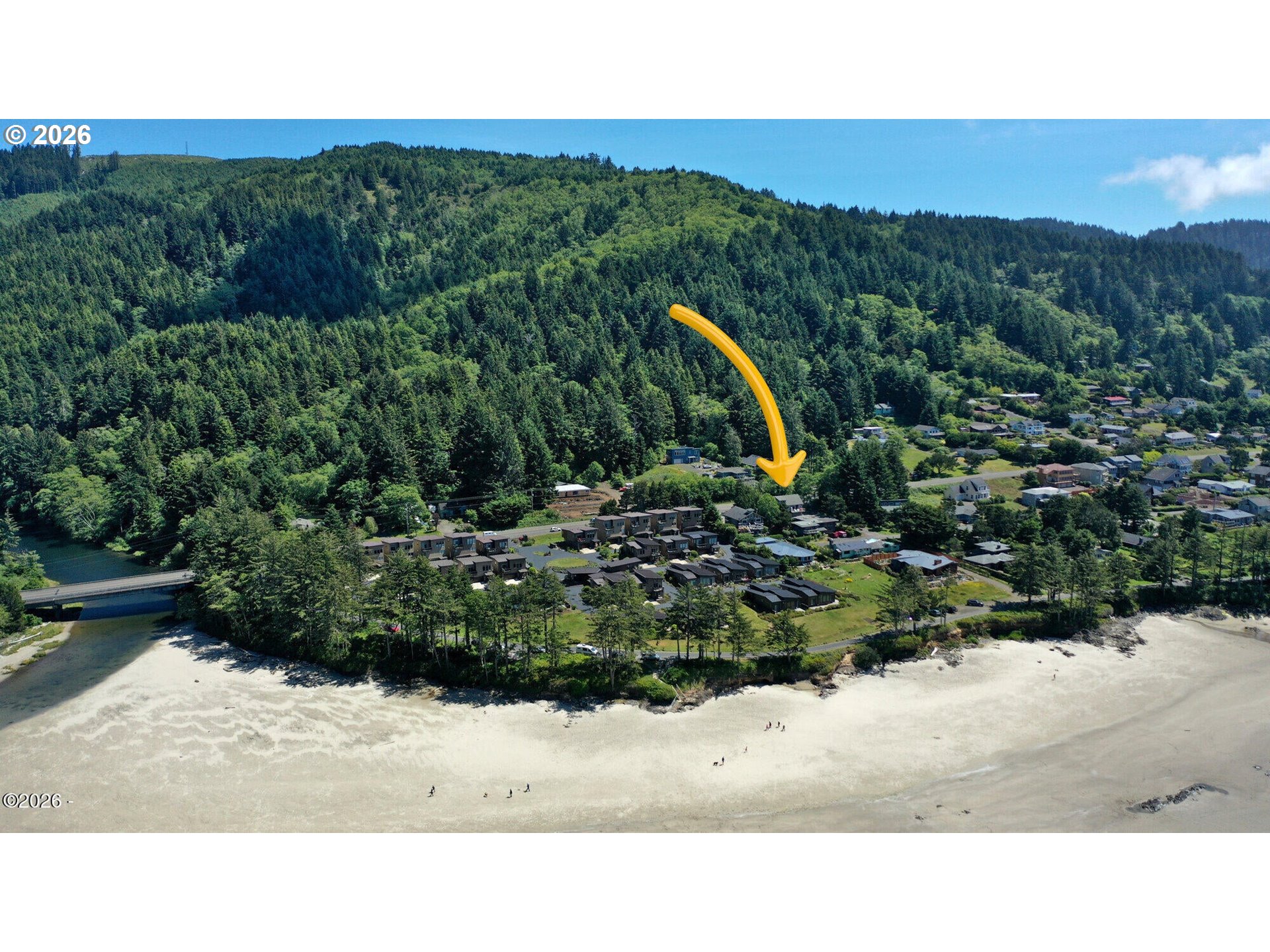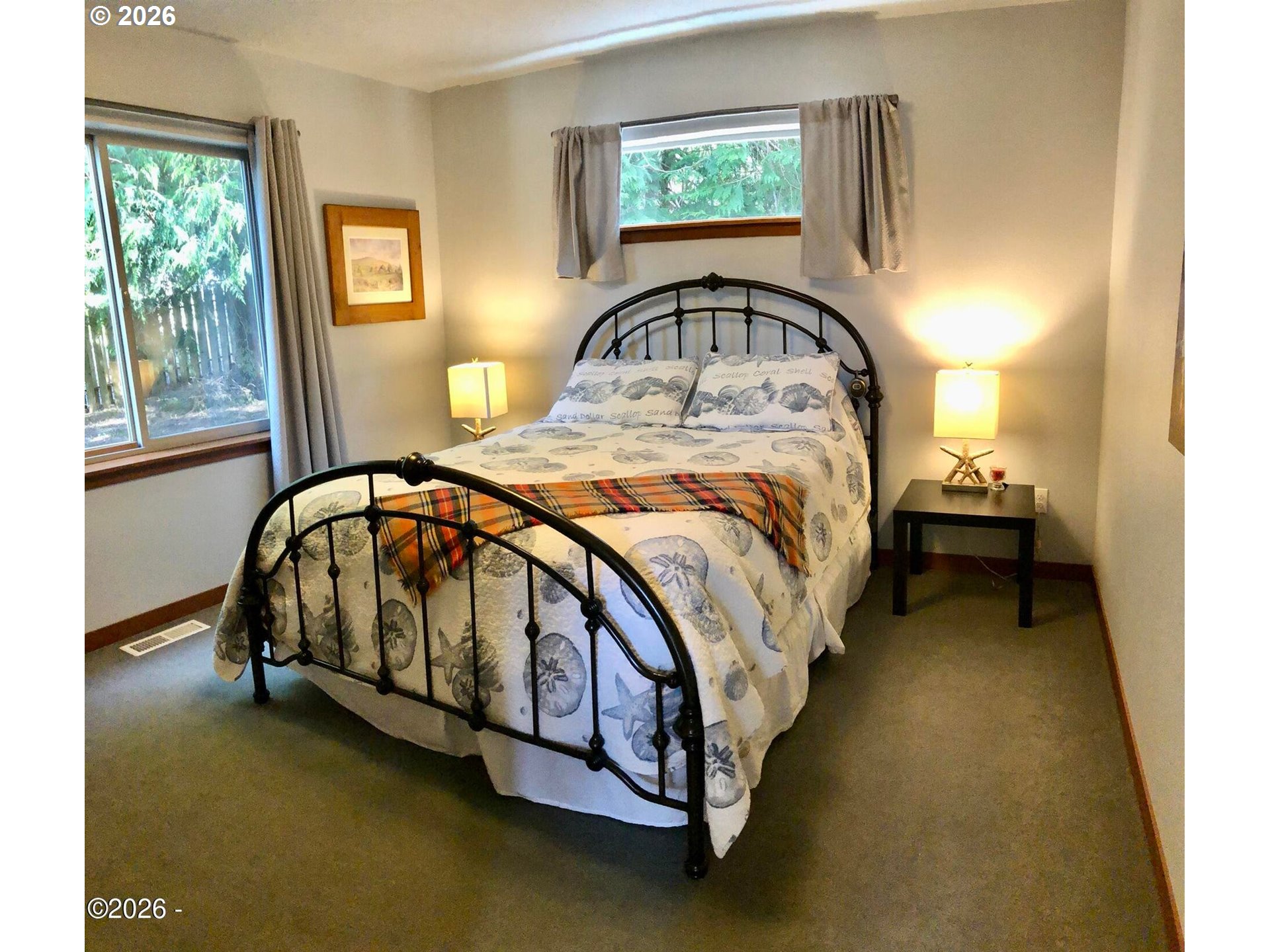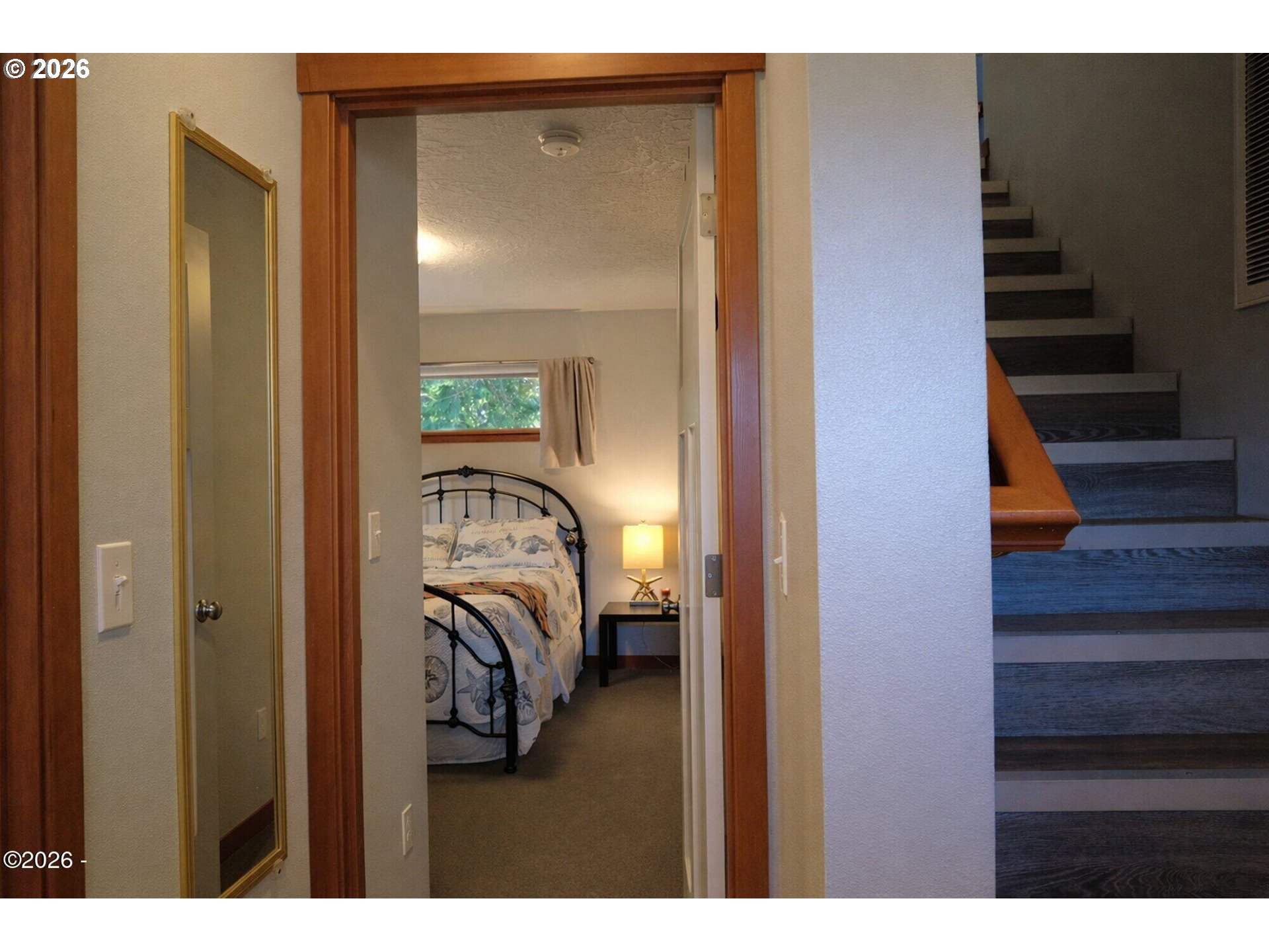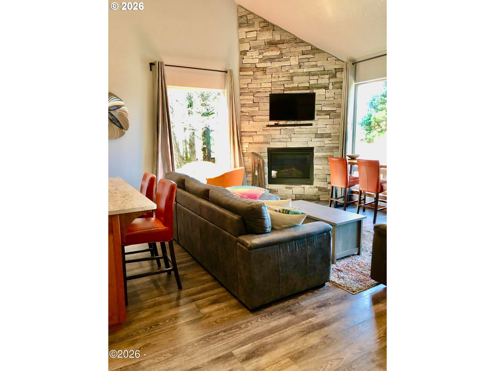 Ocean, bay, and rocky shoreline views define this exceptional coastal retreat. From the main living area and deck, enjoy ever-changing scenery—whales migrating, surfers riding the swell, and stunning sunsets that transition into evenings filled with distant boat lights and the soothing sound of the ocean. Built in 2016 and located just west of Hwy 101, this private 3-level home sits approximately one block from the shoreline and includes a deeded walking easement to Ocean Road with access to a sandy beach. A protected view corridor helps preserve the sweeping vistas. The main level features vaulted ceilings, expansive west-facing windows, and a floor-to-ceiling stone gas fireplace that anchors the space. The kitchen offers quartz countertops, cherry cabinetry, a large island, and a gas range—ideal for cooking and gathering. A custom staircase railing with an ocean-inspired design adds a unique architectural touch. The primary suite showcases both ocean and bay views and includes a soaking tub with water views, double shower, quartz vanity, and cherry cabinetry. The entry level provides a spacious guest bedroom, full bath with double shower, and access to the attached two-car garage with laundry and additional shop space. RV/boat parking is also available. The loft above provides flexible sleeping space, a half bath, and a vantage point to enjoy fireworks and the setting moon over Yachats Bay. Additional features include central heat and A/C, on-demand hot water, excellent insulation, and chair lift wiring. An outdoor hot/cold faucet is perfect after beach outings. The loft offers flexible sleeping space, a half bath, and elevated views.The landscaped yard includes hydrangeas, crocosmia, raised beds, and mature cedar trees. A detached studio (built 2023) with electricity and Wi-Fi is ideal for creative use. Located on a quiet dead-end street, this home offers privacy, natural beauty, and coastal living at its finest. Offered furnished if desired.