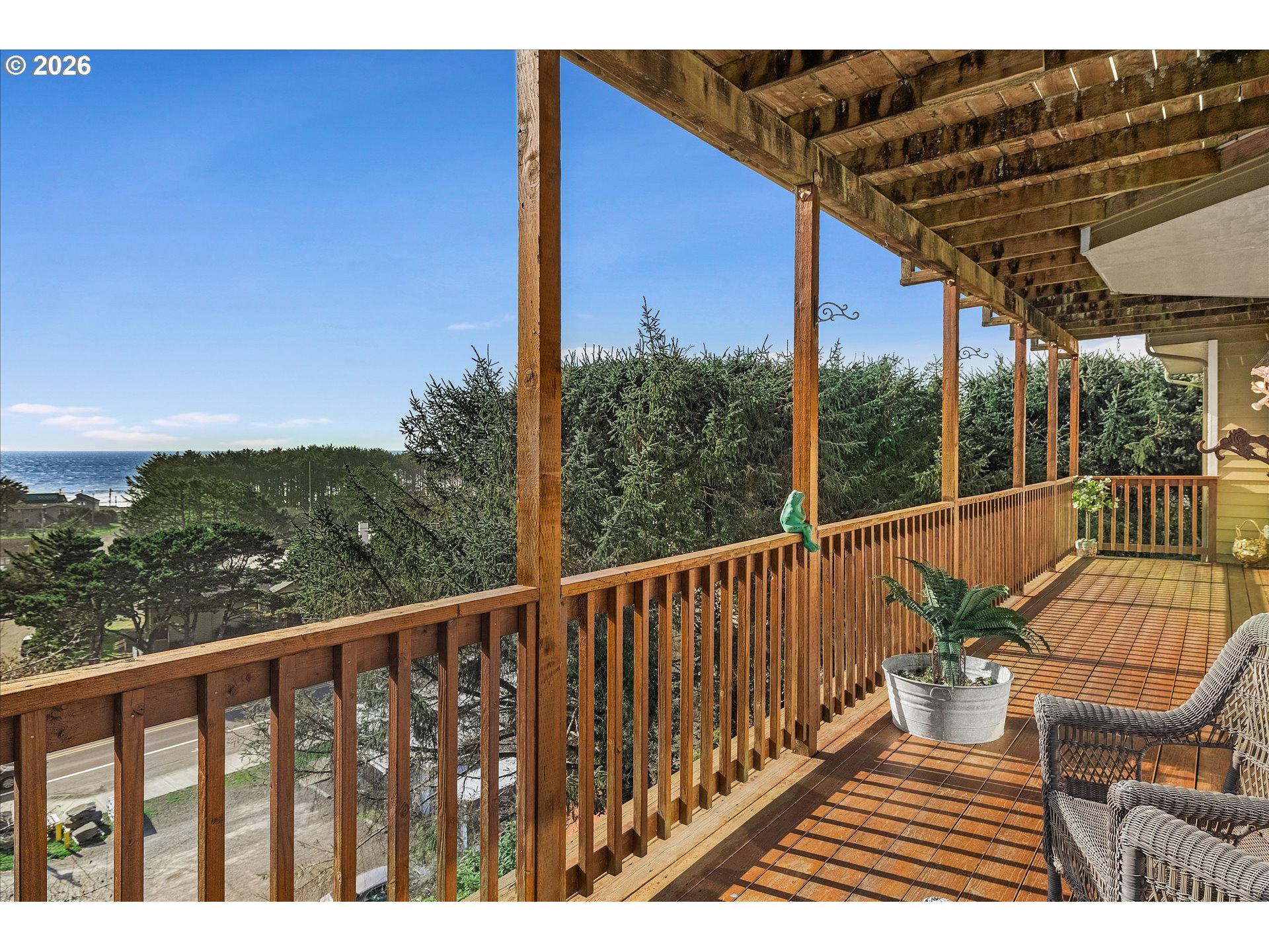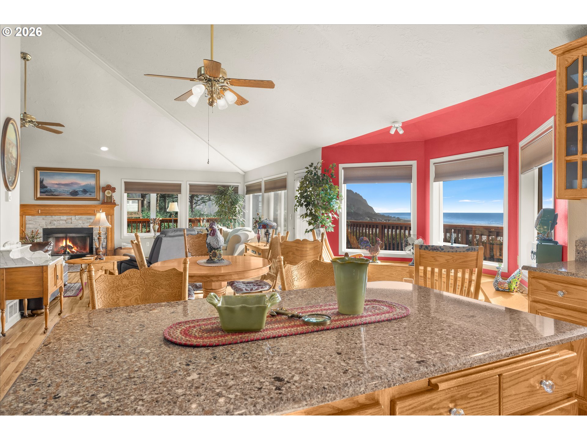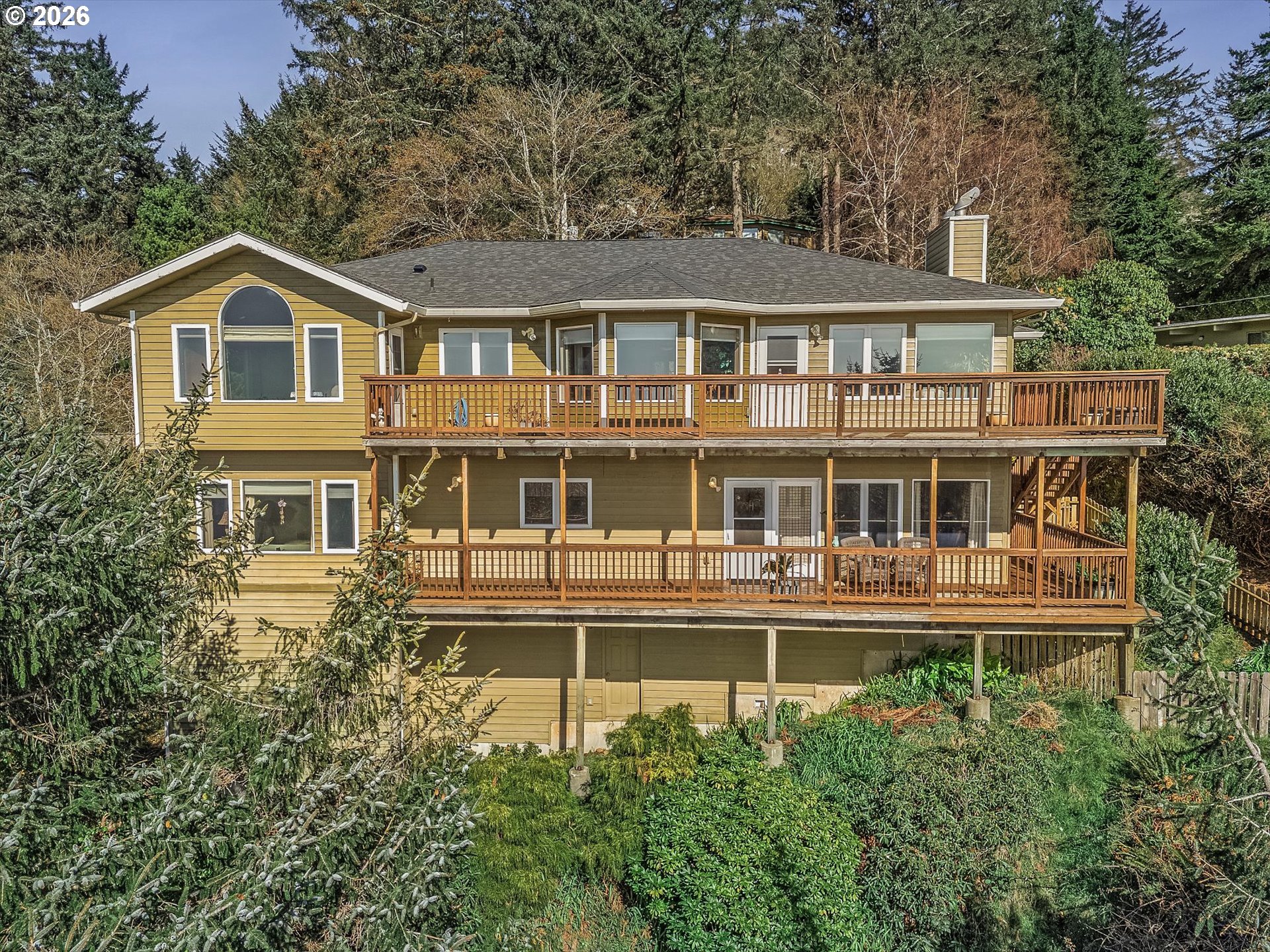 Perched in the heart of Yachats, this custom 3,820 sq ft home captures sweeping ocean views and offers effortless access to the village's shops, dining, and scenic coastline. Thoughtfully designed for both comfort and entertaining, this 3-bedroom, 3.5-bath residence blends coastal charm with spacious living. The main level, conveniently accessible from the street, features an open-concept layout with vaulted ceilings, expansive windows, and abundant natural light. The living area is anchored by a cozy fireplace, while the gourmet kitchen showcases quartz countertops, custom cabinetry, and generous workspace—ideal for gatherings and everyday living. Step outside to the expansive wraparound deck, perfect for taking in stunning ocean vistas and fresh coastal air. The lower level provides additional living space, including a large family room and well-appointed guest accommodations, along with access to a second wraparound deck that extends the home's outdoor living. A substantial 728 sq ft finished storage area adds even more versatility. Situated on two lots, this property offers a rare combination of privacy and a central location in one of Yachats' most desirable areas. A new roof in 2023 adds peace of mind, complementing the home's thoughtful design and exceptional coastal location.