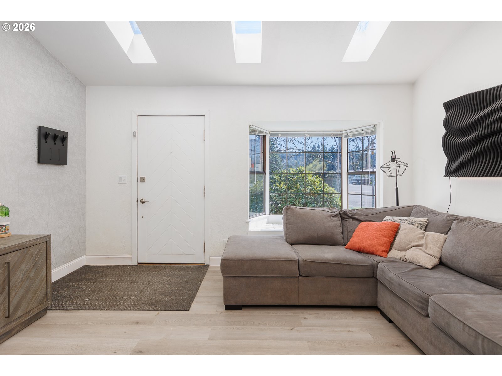 Charming and meticulously maintained 2 bed, 1.5 bath home with stylish modern updates throughout. The light-filled living room shines with a bay window, 3 skylights, and vaulted ceilings, anchored by a sleek bio-ethanol fireplace. The upstairs primary suite offers a walk-in closet and peaceful river views. Enjoy true main-level living with a bedroom and full bath downstairs featuring a beautifully tiled walk-in shower. Step out to a covered deck overlooking a private fenced yard. A huge plus - separate laundry area with storage, washer/dryer included. Recent upgrades include new LVP flooring, brand new water heater, and ceiling fans.