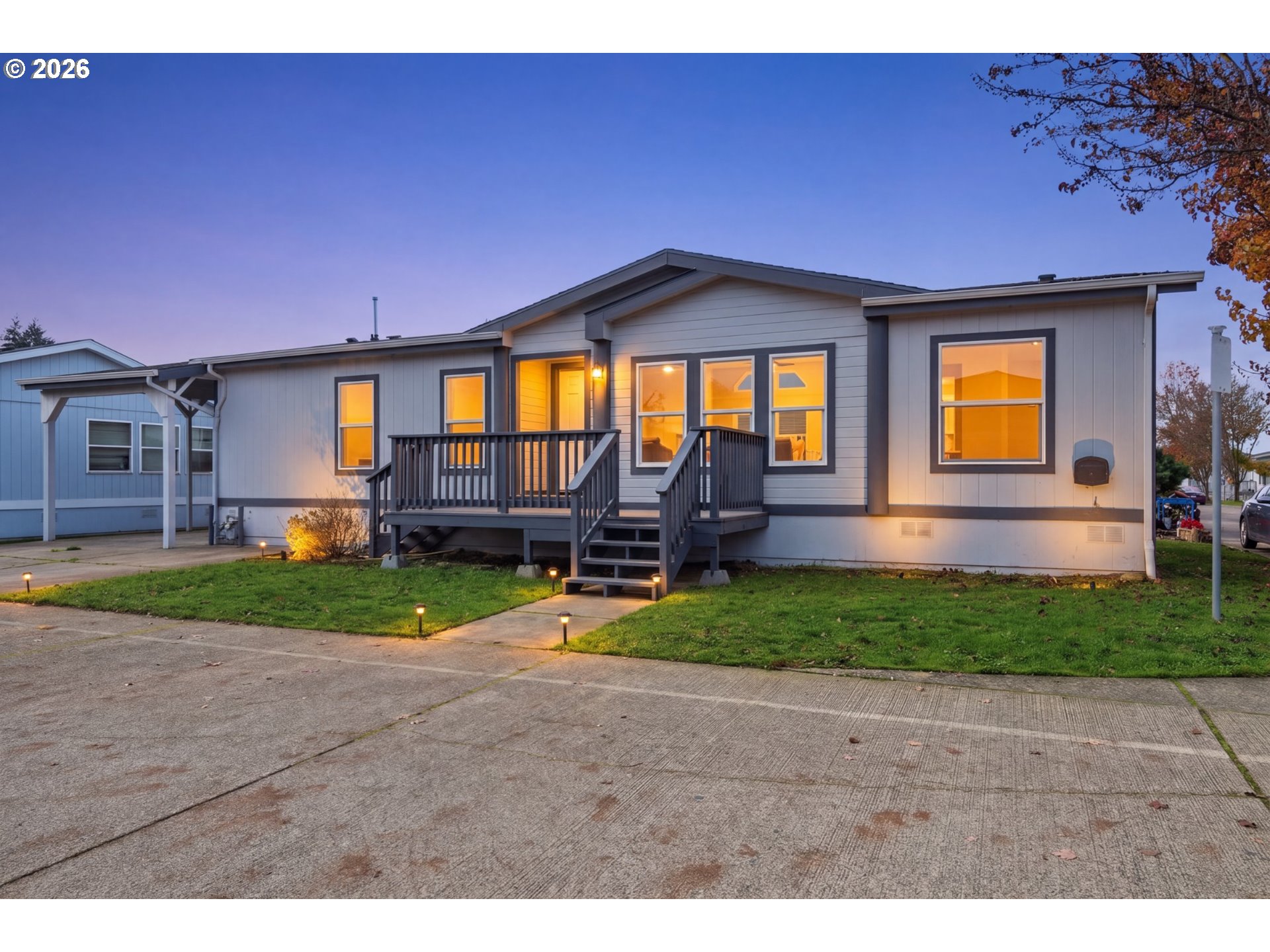 Discover unparalleled luxury in this better-than-new, professionally remodeled 3-bedroom, 2-bath Palm Harbor double-wide located on a desirable corner lot in the all-ages North Santiam Village community. This 1,323 sq. ft. masterpiece features a sophisticated split layout, with the primary suite privately situated on one end of the home and the additional two bedrooms and full bath on the opposite end—ideal for comfort and separation of space. Step inside to a bright, open-concept interior showcasing sleek new LVP flooring throughout the main areas and plush new carpeting in the bedrooms. The stunning kitchen offers black quartz countertops, a large single-basin stainless steel sink, brand-new high-end stainless-steel appliances, and elegant matte black hardware. Natural light pours into the dining area, creating a warm and inviting atmosphere. The serene primary suite includes a walk-in closet and a spa-inspired bathroom with a large soaking tub featuring custom tile work, a separate walk-in shower, and double sinks. Both bathrooms are beautifully updated with new tile flooring, quartz counters, and modern matte black fixtures. This meticulously renovated home also includes a new heating and cooling system, new interior and exterior paint, new windows, new deck, new hardware and fixtures, and a newly fenced backyard with cedar fencing. A covered carport and attached storage shed add convenience and functionality. Enjoy access to community amenities including basketball and tennis courts, a recreation center with communal kitchen, and a shared library. Park rent is $849/month; All buyers must receive approval from North Santiam Village.