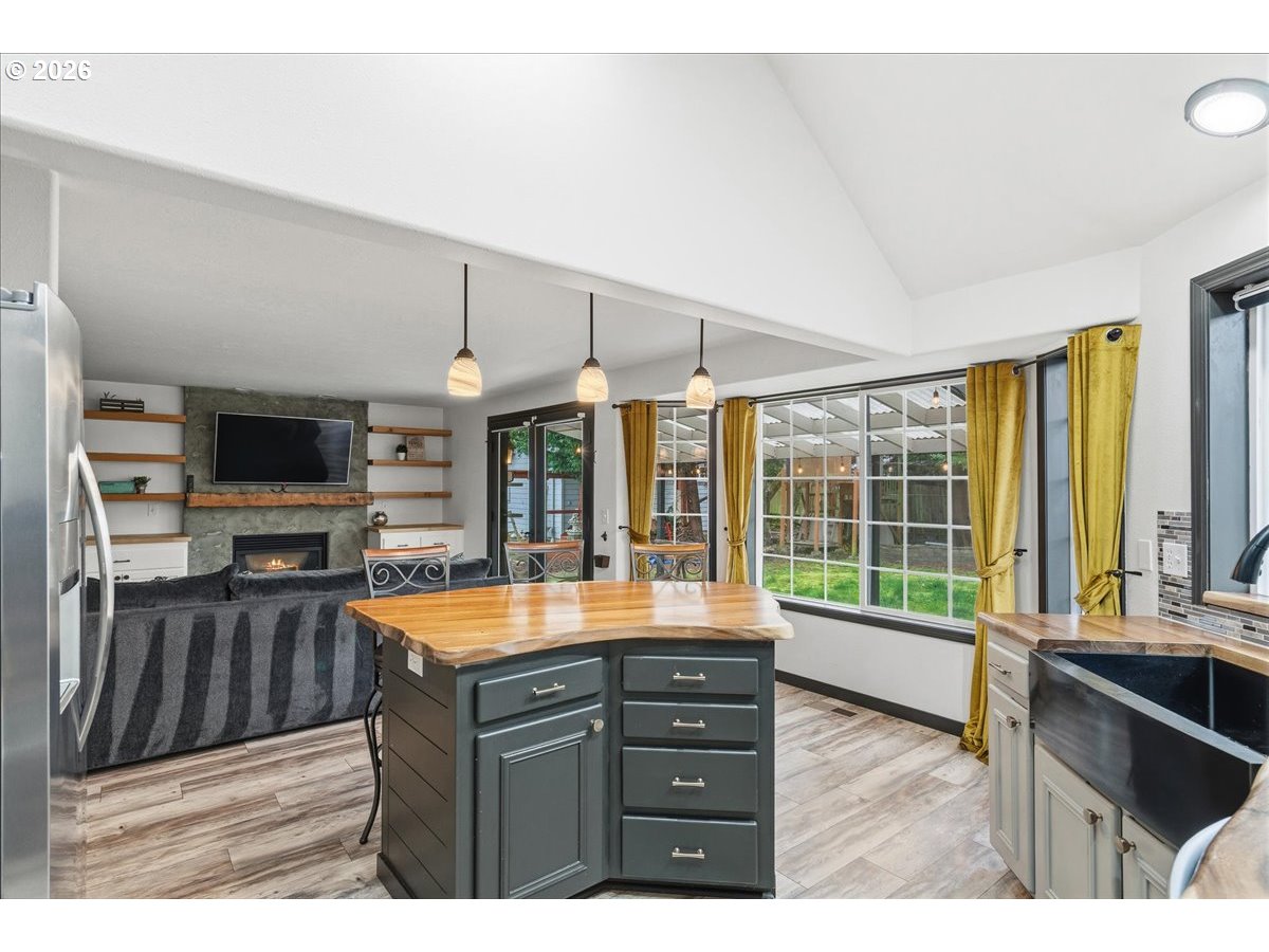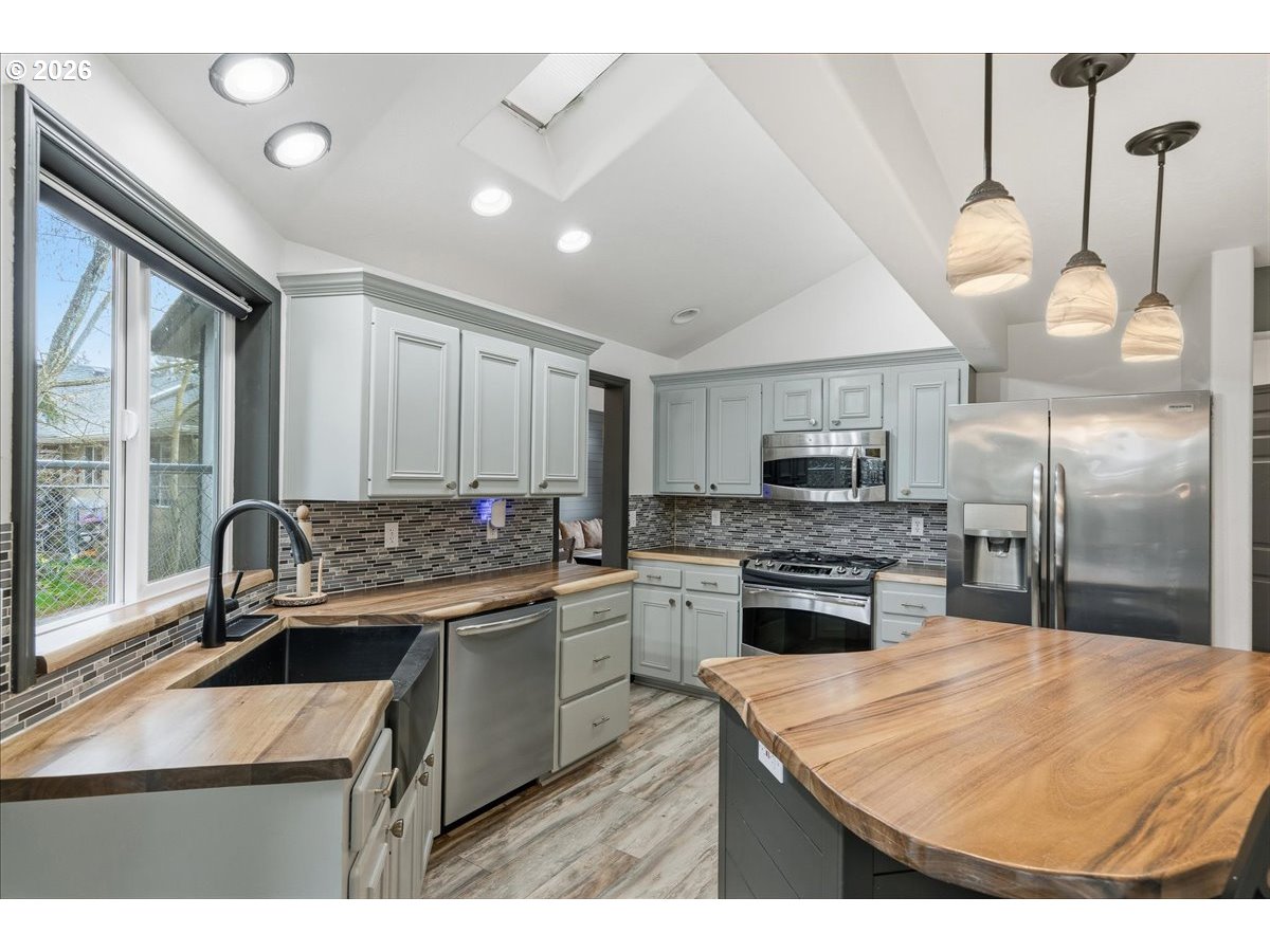 She's a cutie looking for her next lucky love! She's dynamically different with butcher block counters, vaulted ceilings, dual living areas, fireplace, hard to find 3 car garage and a generous private back yard with mature trees and new fencing! This home is welcoming and beautifully nestled in an established neighborhood showing off pride of ownership! Updates include recently refreshed interior & NEW furnace/AC in 2024. She's more than just another good looking 3 bed, 2.5 bath building, she's 'Home'!