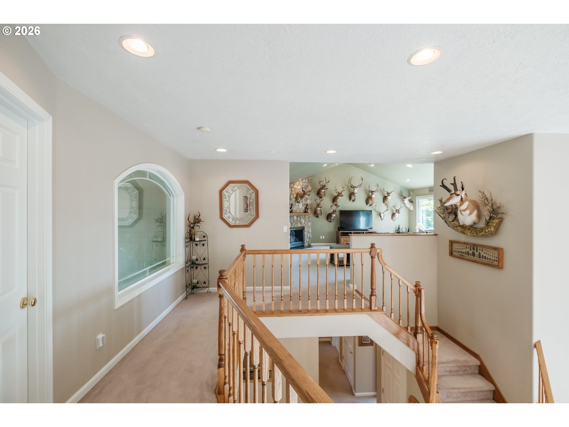 PRIVATE NW RETREAT! Enjoy filtered sunlight through towering timber, coffee in hand as you step onto your expansive Trex deck overlooking 5 private acres of lush landscaping, gardens, trails & peaceful forest. Custom 4 bd, 4 bath home in upscale neighborhood offers wood floors, granite counters, dramatic windows, 2 gas fireplaces. Retreat upstairs to family room & full wet-bar; and spacious, tranquil primary suite. 44x48 3-bay shop w/RV door, finished upstairs for lvg/rec/ofc. Waterfall, pond & irrigation.