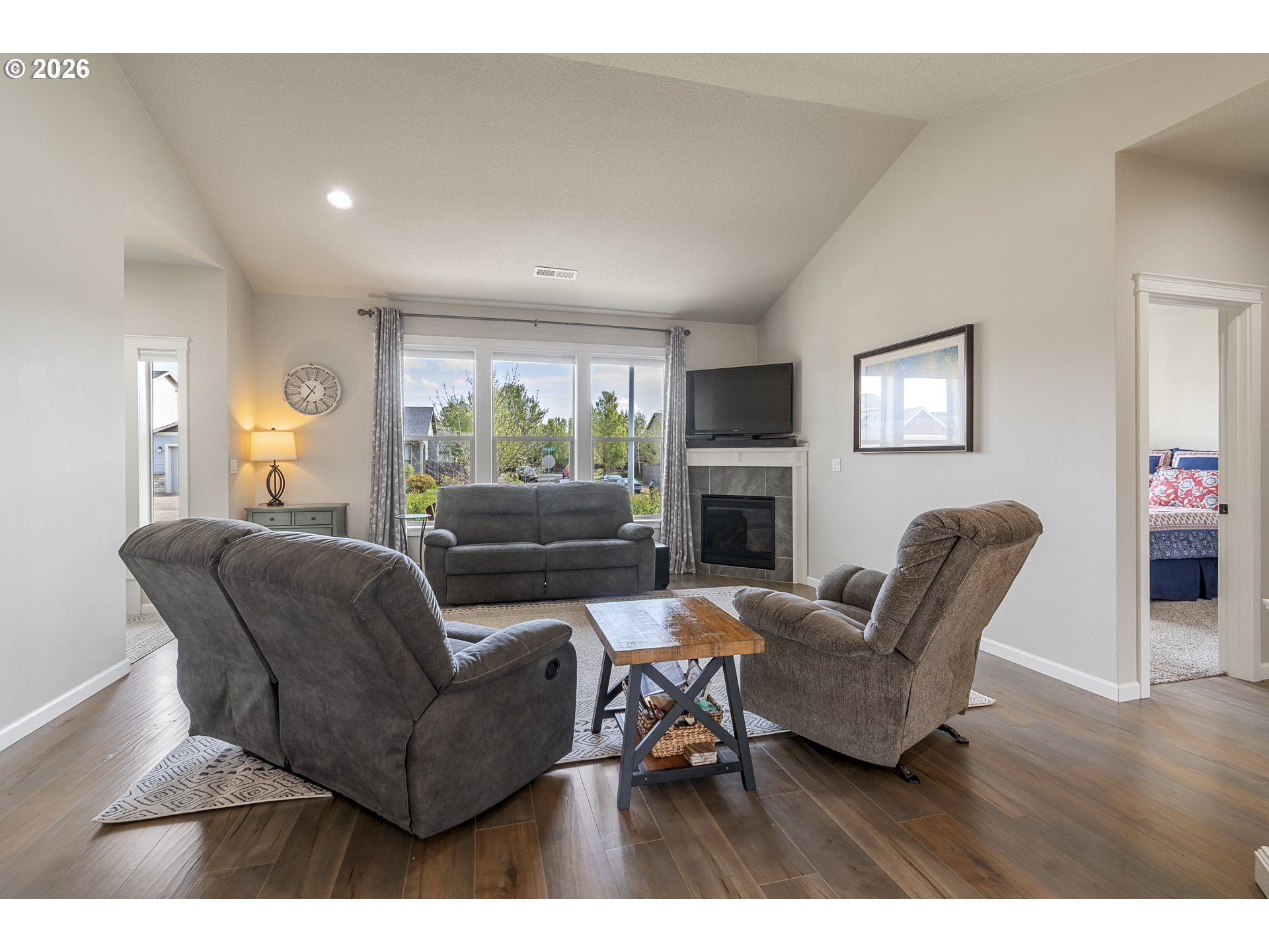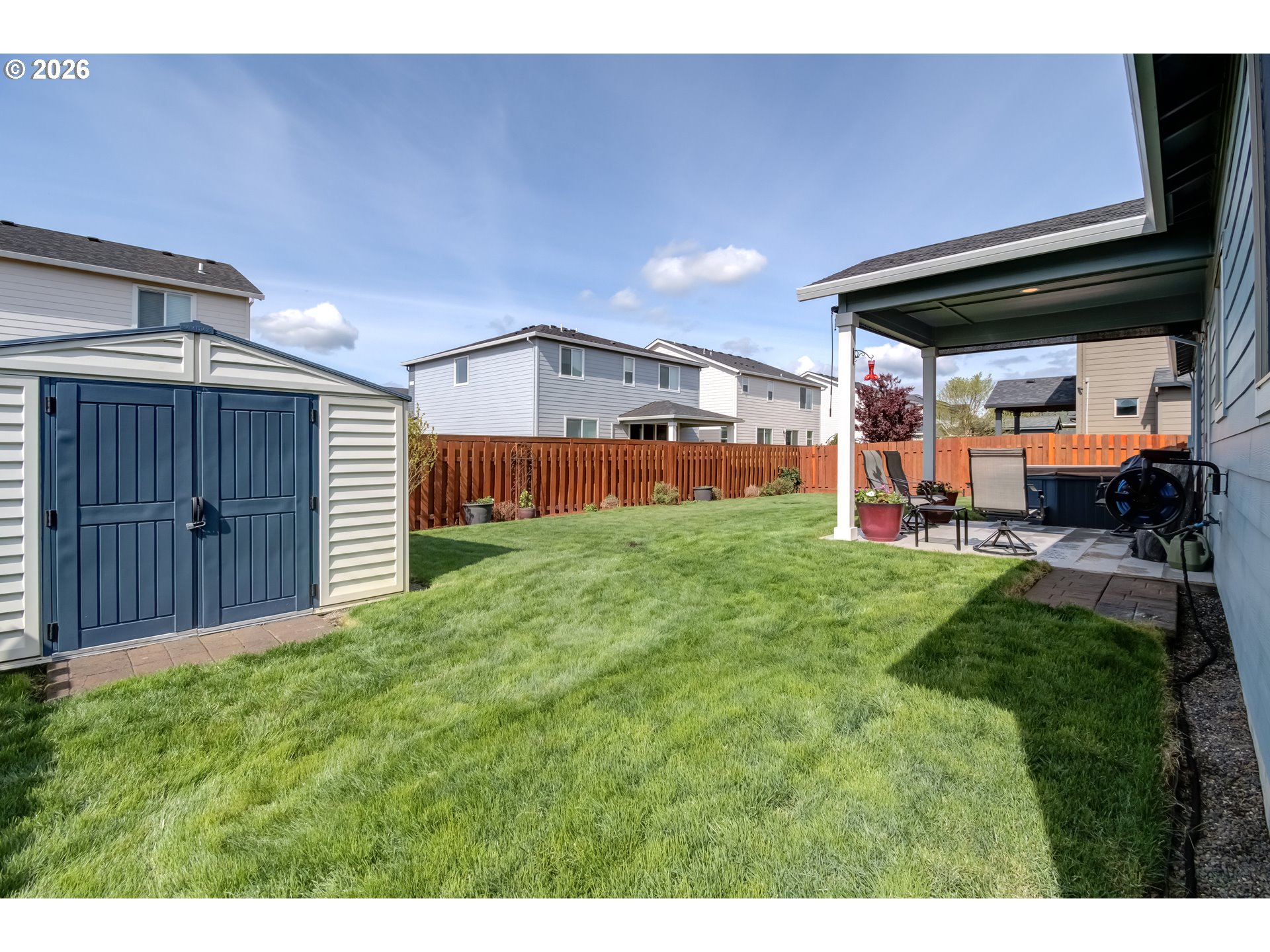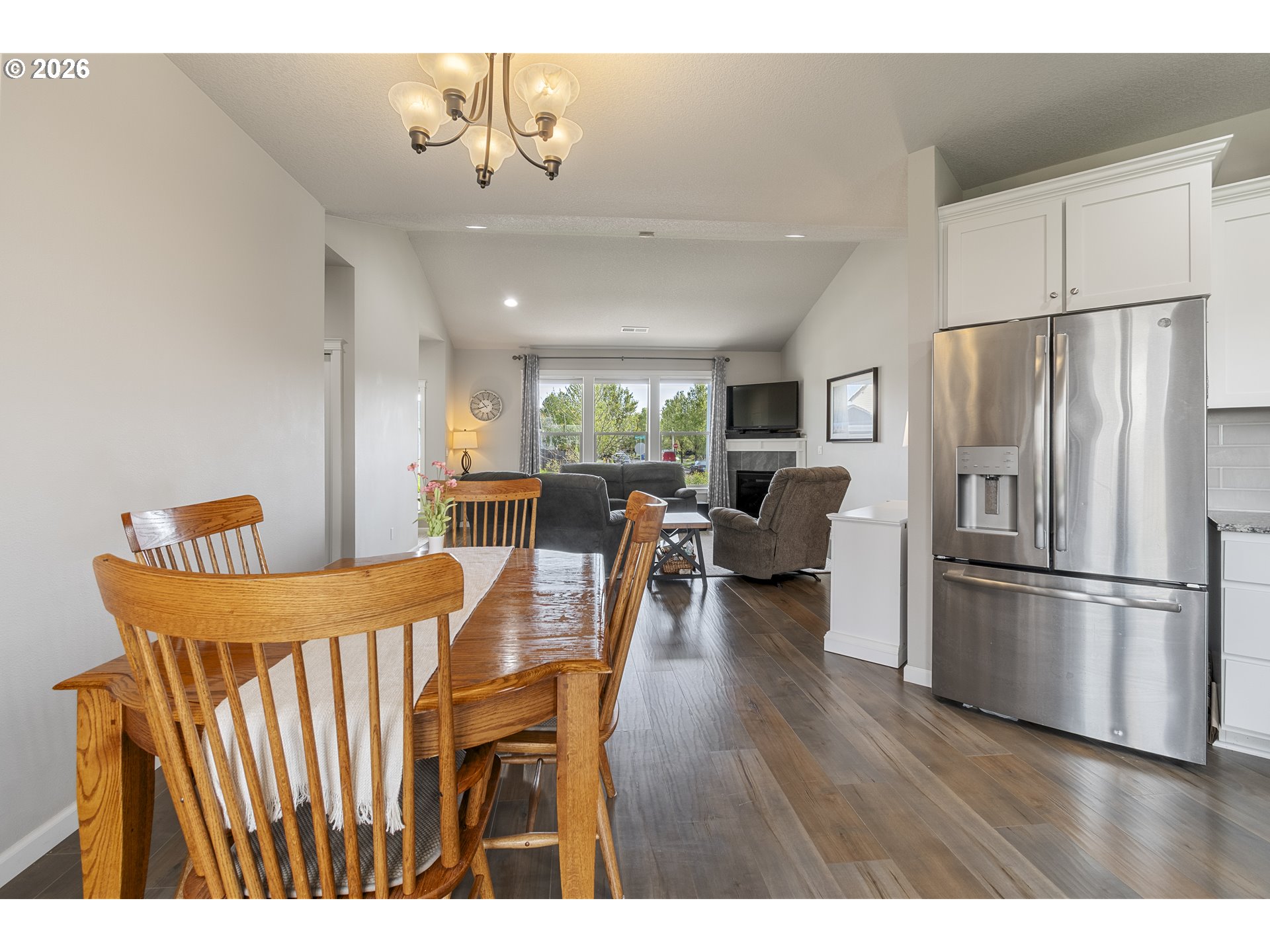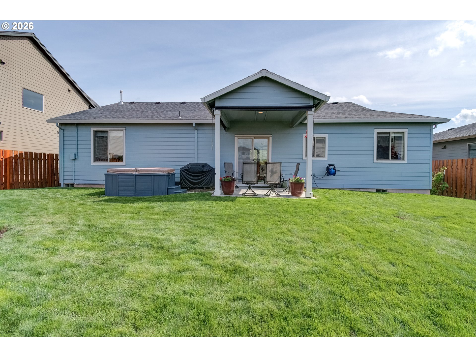This well-maintained 3-bedroom home was built in 2019 and offers 1,365 sq ft with a functional open-concept layout. The main living area includes vaulted ceilings and gas fireplace which flows into the dining space and kitchen, creating a connected setup for everyday living. The kitchen features beautiful cabinetry, and generous countertop space, along with matching stainless steel appliances. The primary suite includes an attached bathroom, and the additional bedrooms provide flexible space for guests, office use, or hobbies. The home also includes an attached 2-car garage and a fully fenced backyard perfect for entertaining with covered and screened patio, hot-tub, play space, and gardening. Convenient Woodburn location close to shopping, dining, parks, schools, and easy access to I-5 for commuting north toward Wilsonville/Portland or south toward Salem.