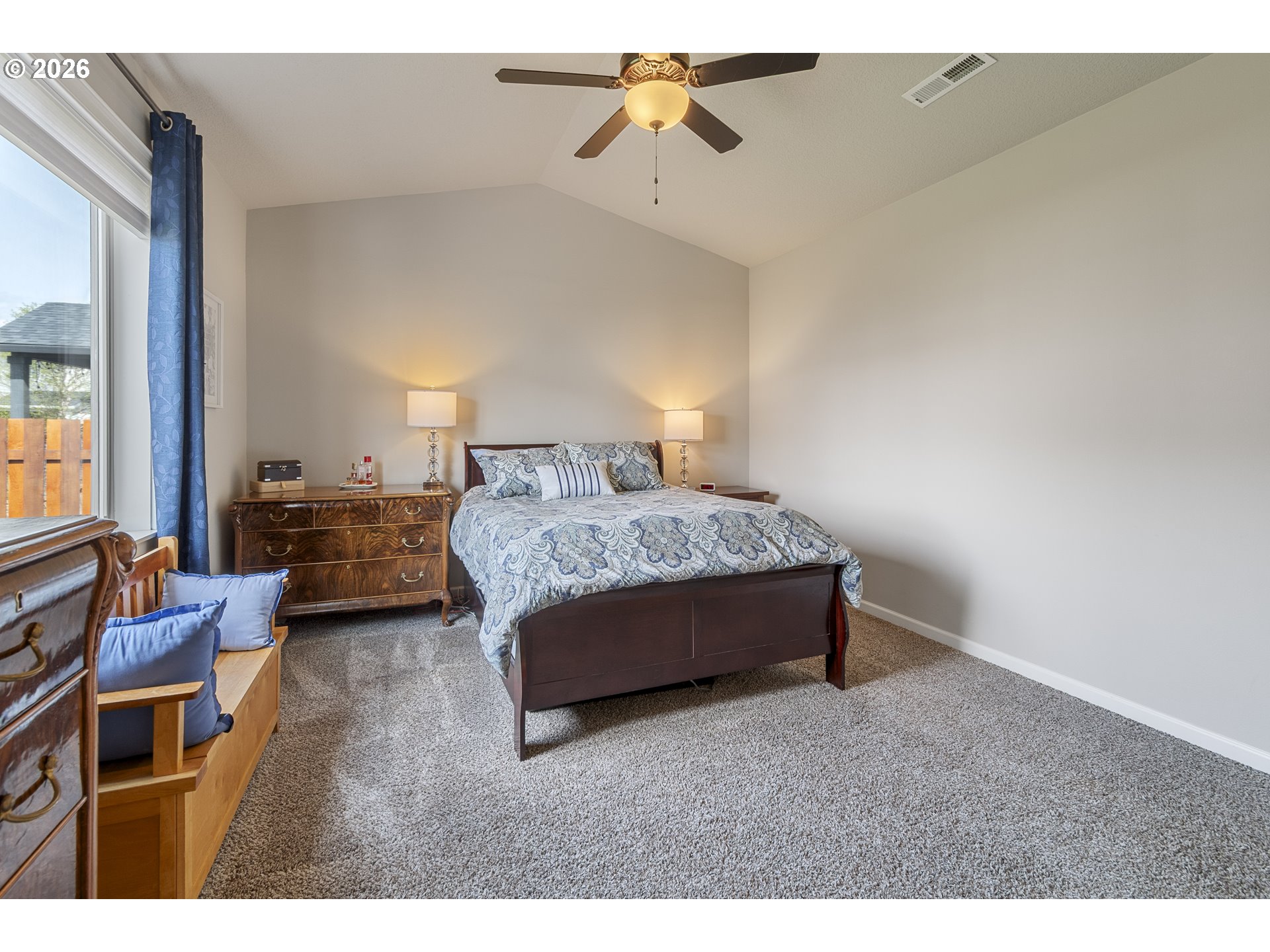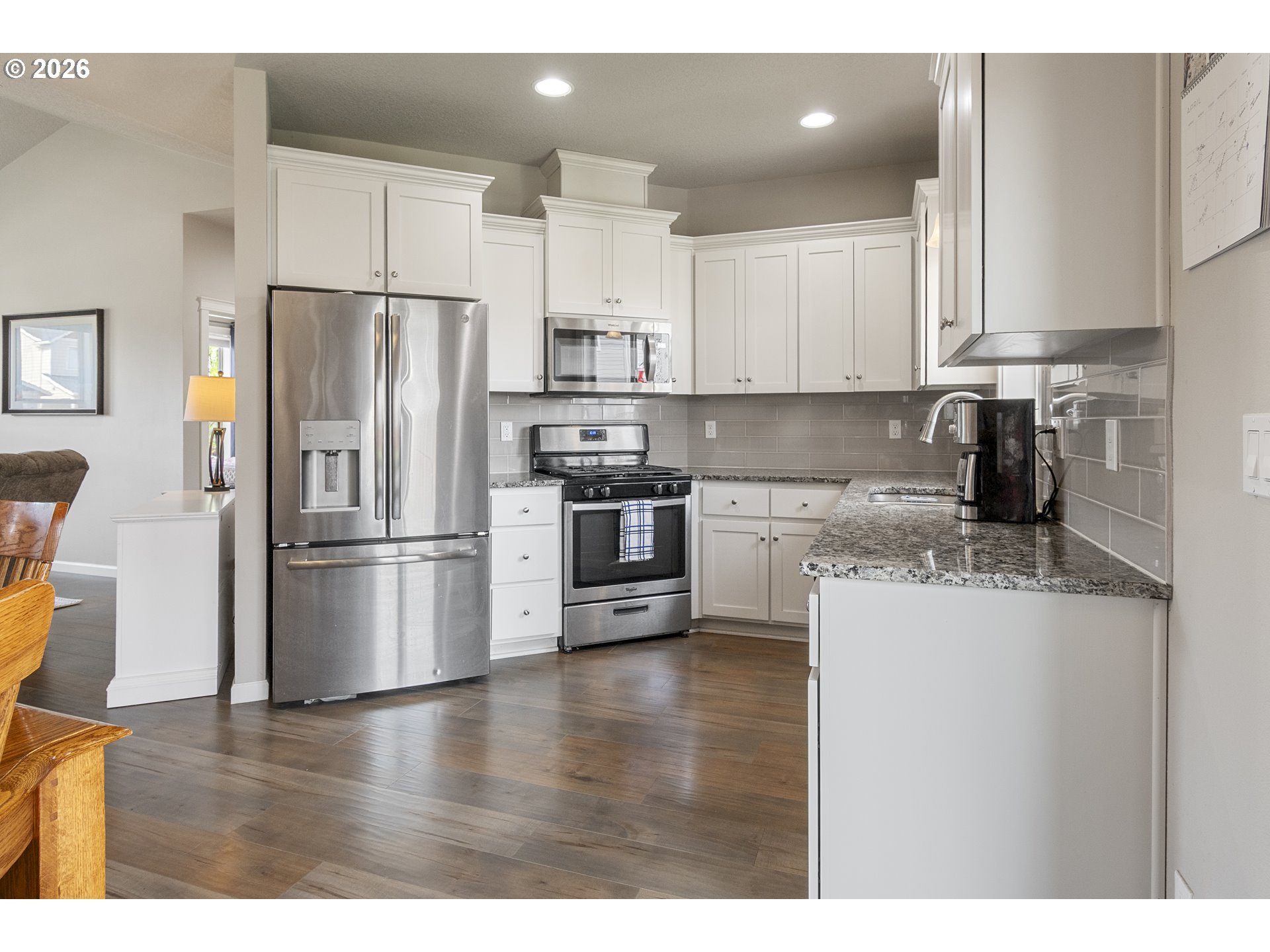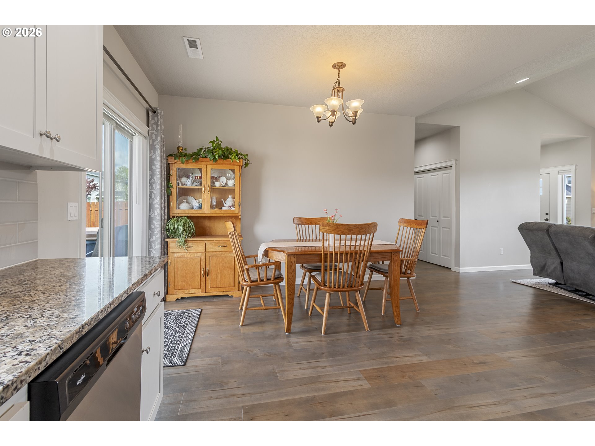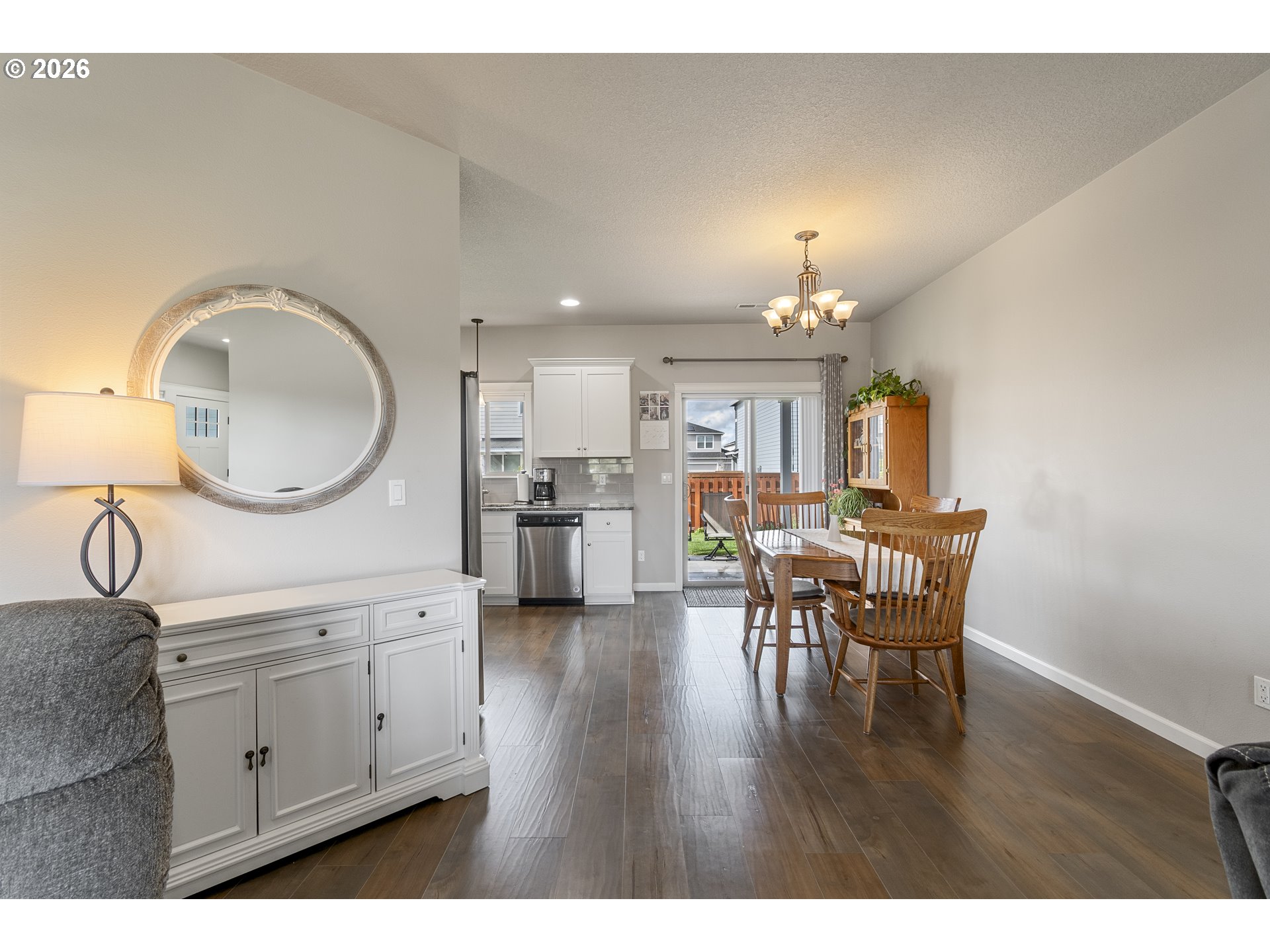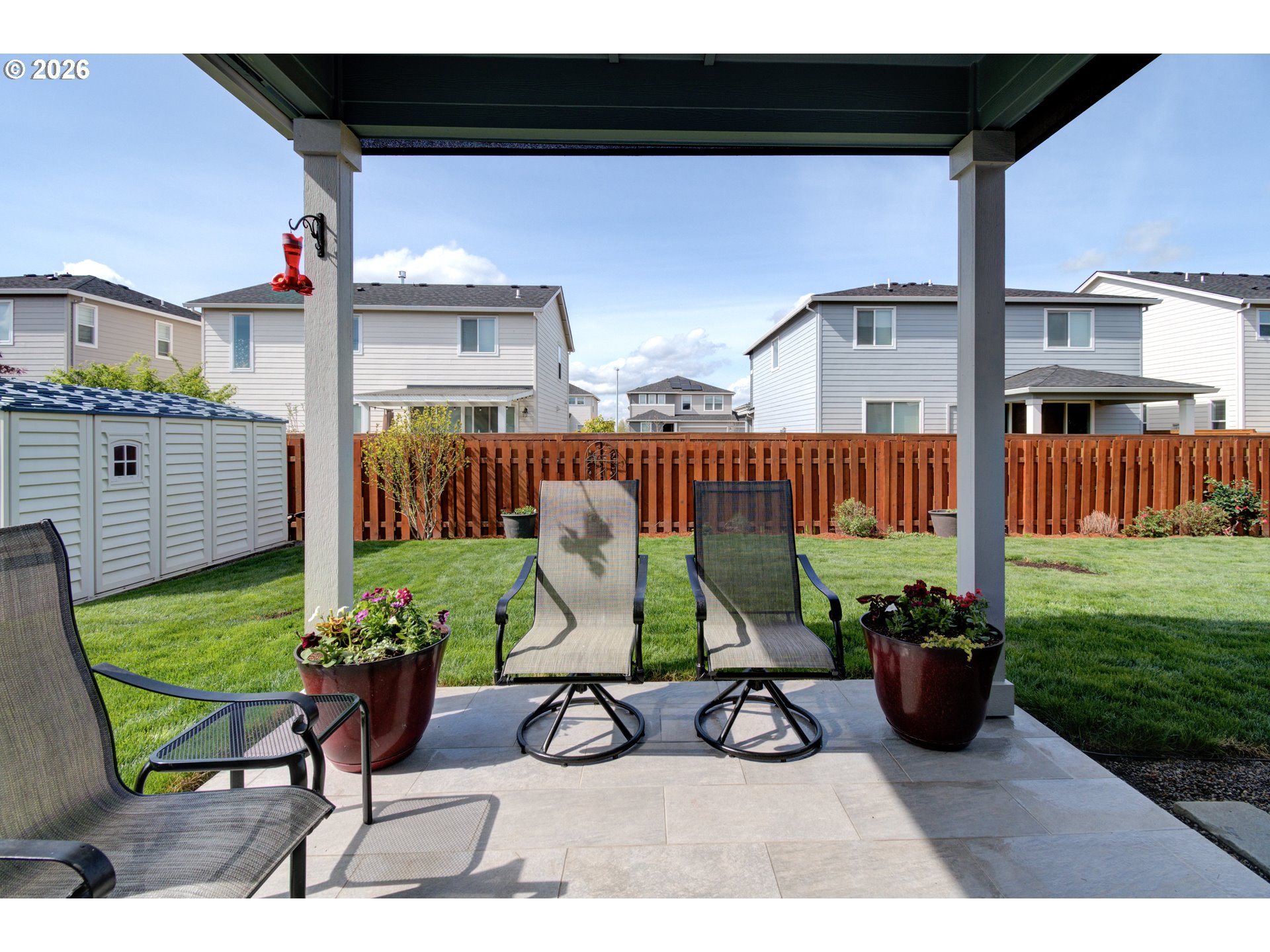 This well-maintained 3-bedroom home was built in 2019 and offers 1,365 sq ft with a functional open-concept layout. The main living area includes vaulted ceilings and gas fireplace which flows into the dining space and kitchen, creating a connected setup for everyday living. The kitchen features beautiful cabinetry, and generous countertop space, along with matching stainless steel appliances. The primary suite includes an attached bathroom, and the additional bedrooms provide flexible space for guests, office use, or hobbies. The home also includes an attached 2-car garage and a fully fenced backyard perfect for entertaining with covered and screened patio, hot-tub, play space, and gardening. Convenient Woodburn location close to shopping, dining, parks, schools, and easy access to I-5 for commuting north toward Wilsonville/Portland or south toward Salem.