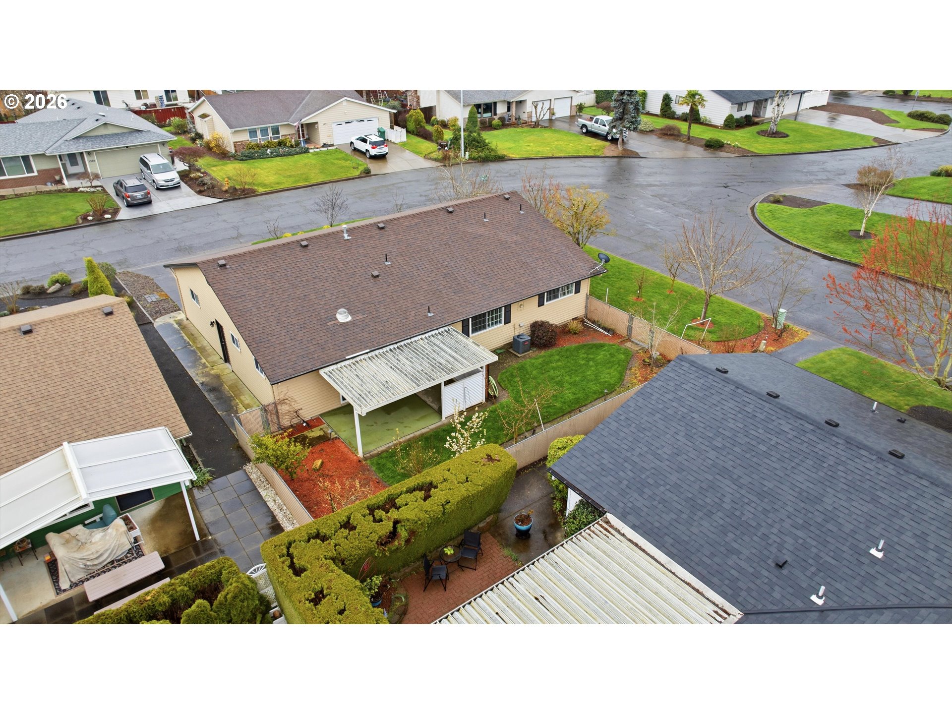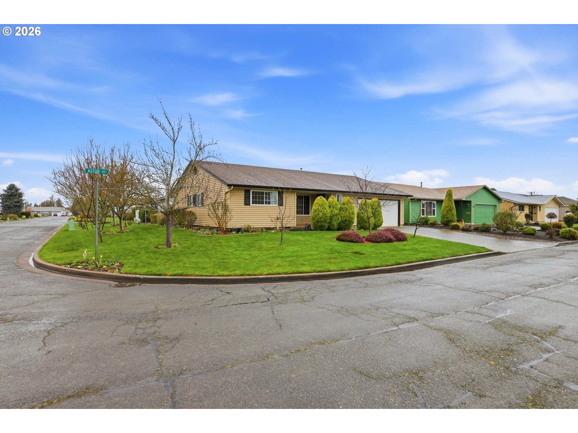 Located in the popular Woodburn Estates, this charming, well-cared-for home sits on a gorgeous corner lot in a quiet area of the 55+ community. Featuring 2 bedrooms, 2 full baths, a 2-car garage, indoor laundry, and a great room off the kitchen, it offers comfortable, open living and entertaining space. The bonus room leads to an easy-care yard with a covered patio, plus a variety of fruit trees and an almond tree! Enjoy peaceful surroundings with close access to the community's beautiful golf course.