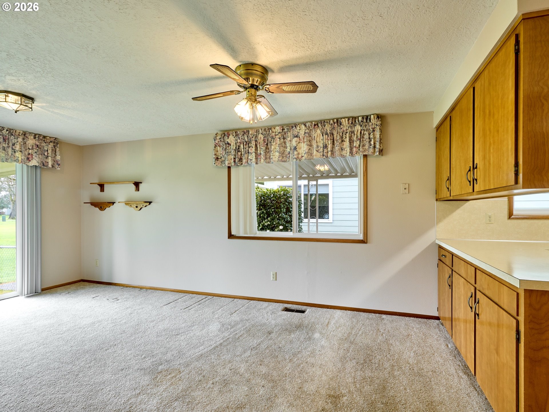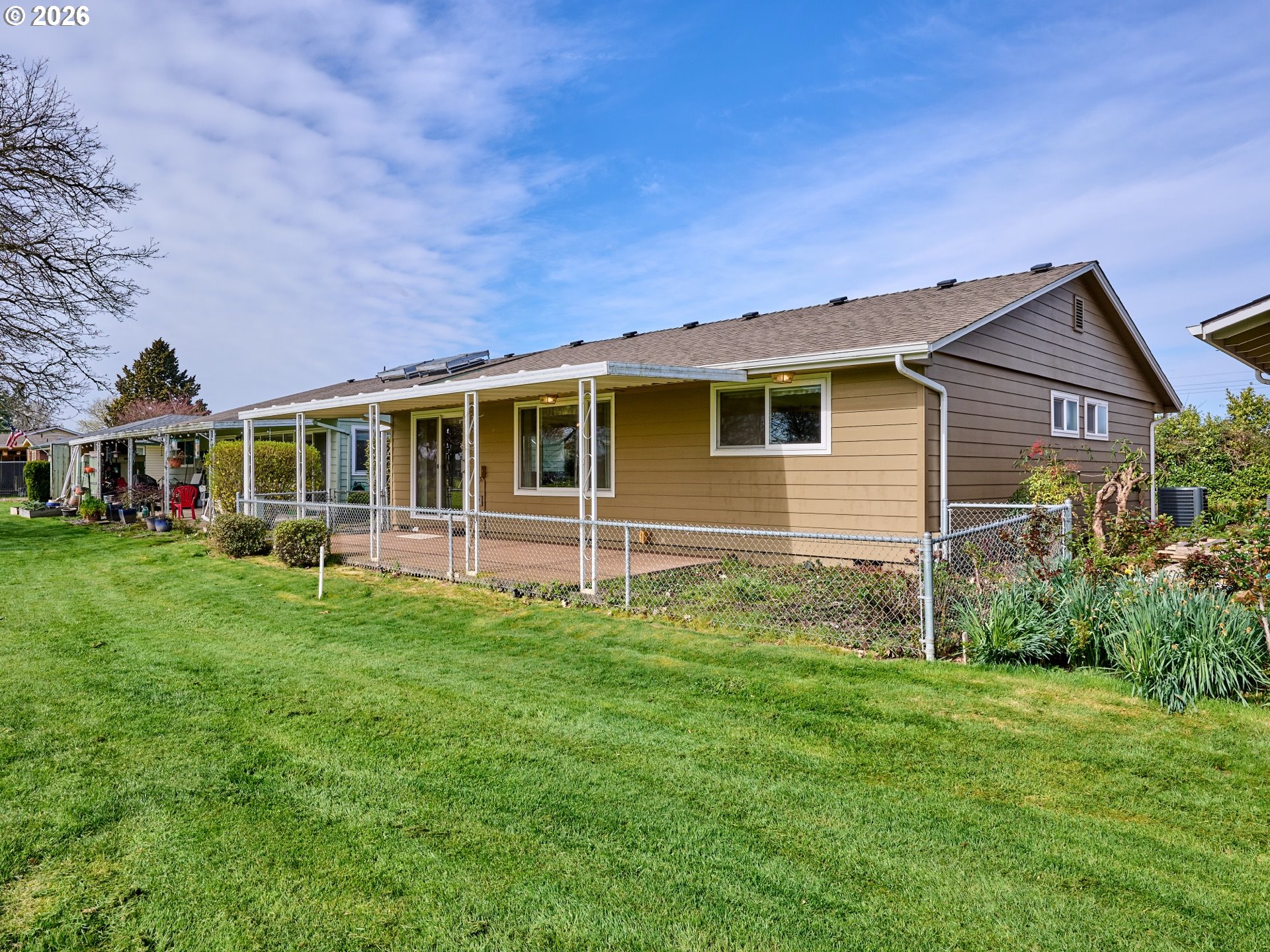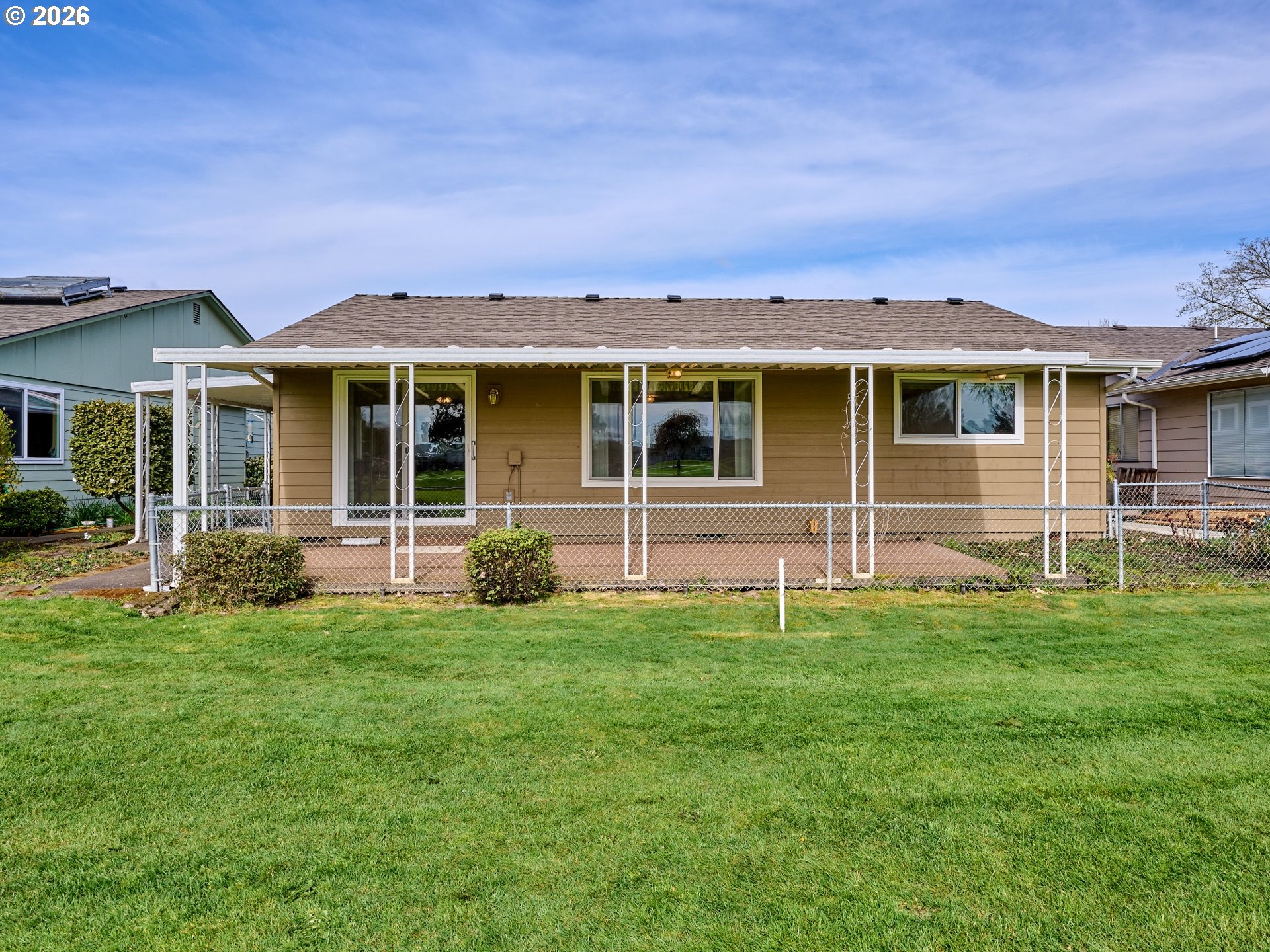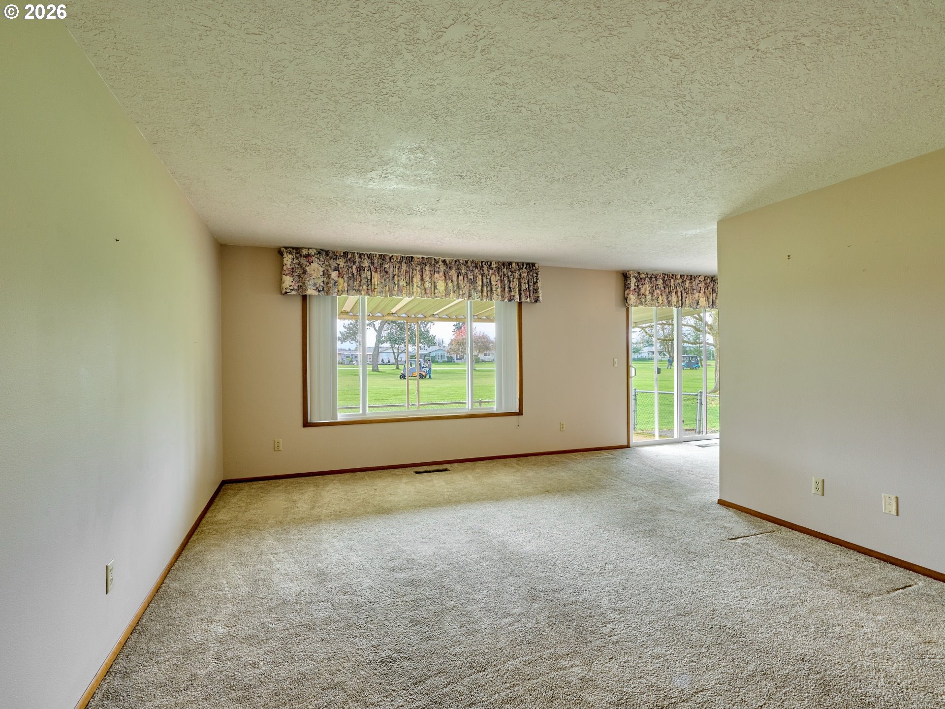Located in the sought-after Woodburn Senior Estates, this home sits on the 4th hole of the golf course with beautiful, open views you can enjoy year-round from the large covered and fenced patio—perfect for relaxing or entertaining.Inside, you’ll find bright, natural light throughout with a seamless flow between the living room, dining area, and kitchen, all showcasing golf course views. The kitchen offers ample storage, including a large pantry, while a separate laundry room with shelving adds everyday convenience.This home features two bedrooms and two bathrooms, including a spacious primary suite with a walk-in closet and full bath. The second bedroom also enjoys golf course views, great natural light, and a closet with built-in shelving.Additional highlights include new bathroom flooring and walk-in showers, a brand-new furnace with a five-year warranty, and a spacious two-car garage with extra storage and dedicated golf cart parking—drive directly onto the course from home.Annual HOA of $1,116 includes golf for two, plus access to the pool, gym, library, pickleball, and community activities—easy living at its best.