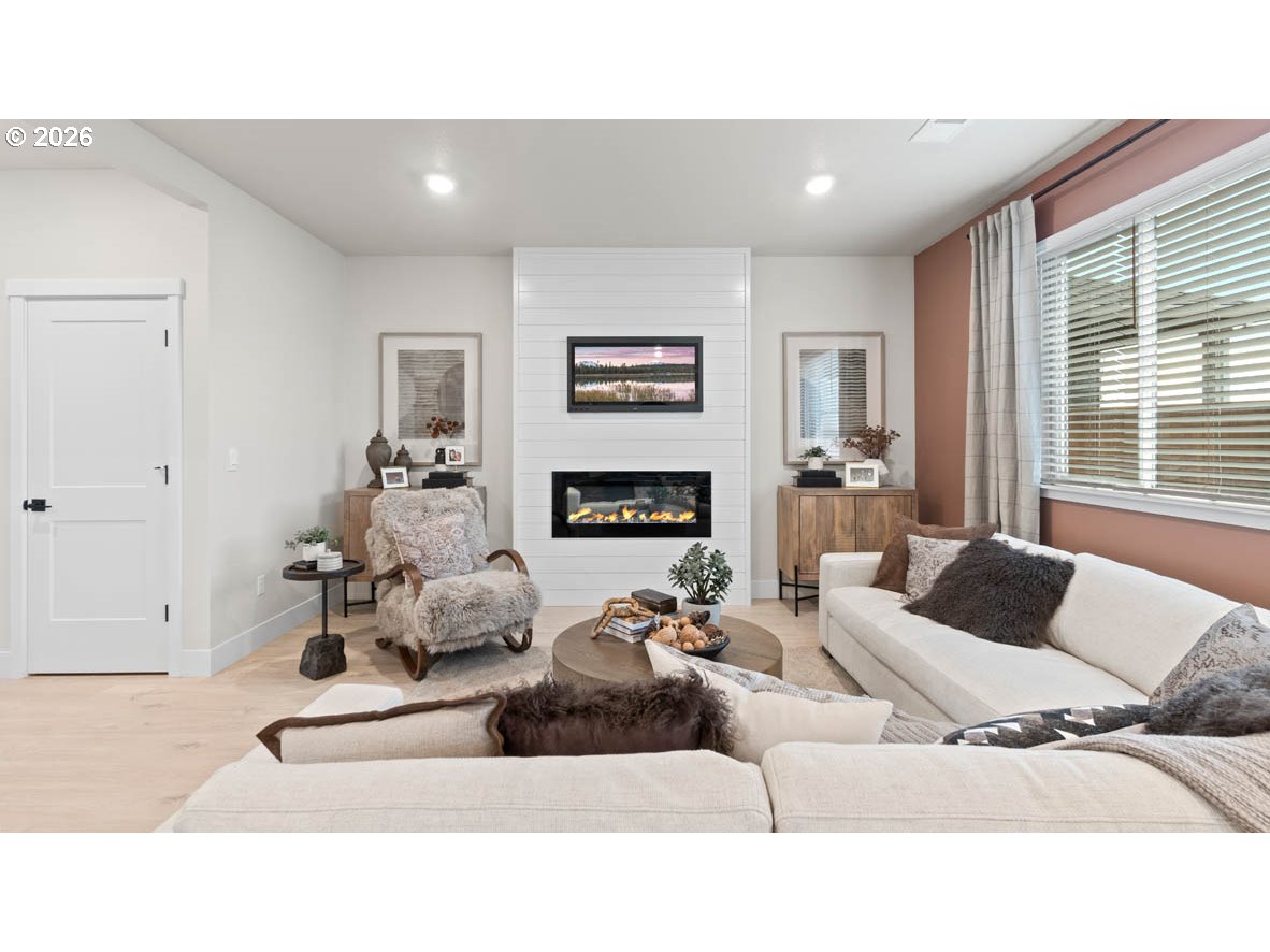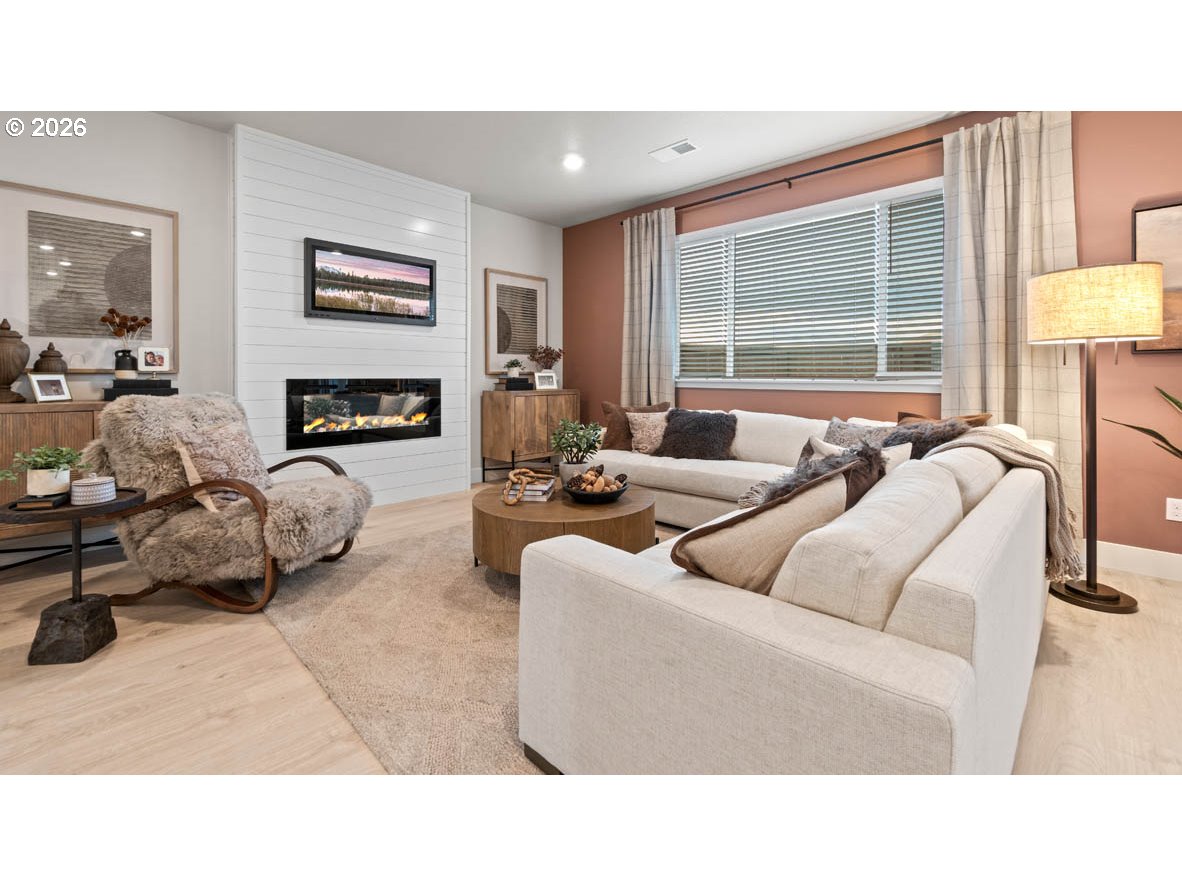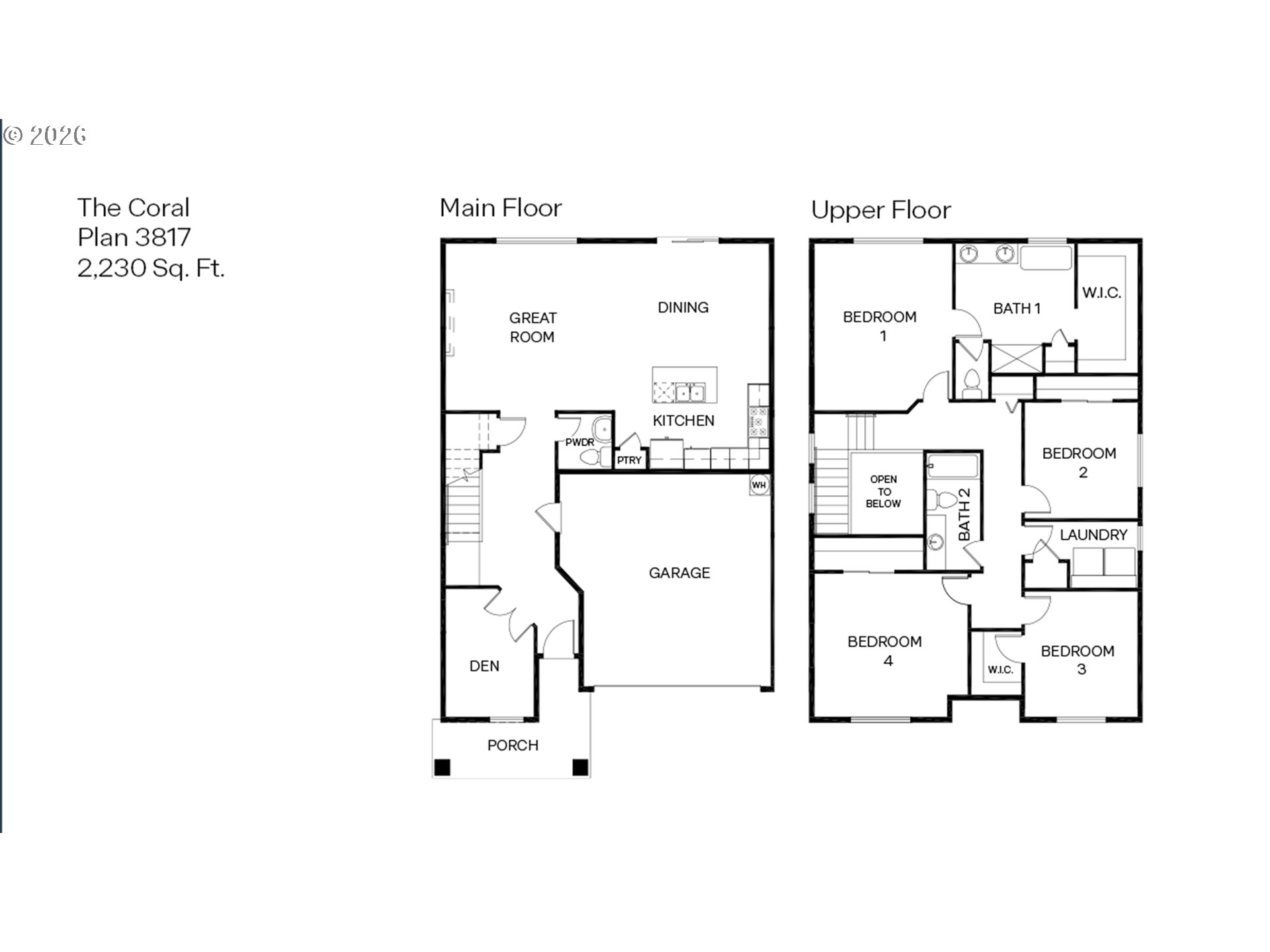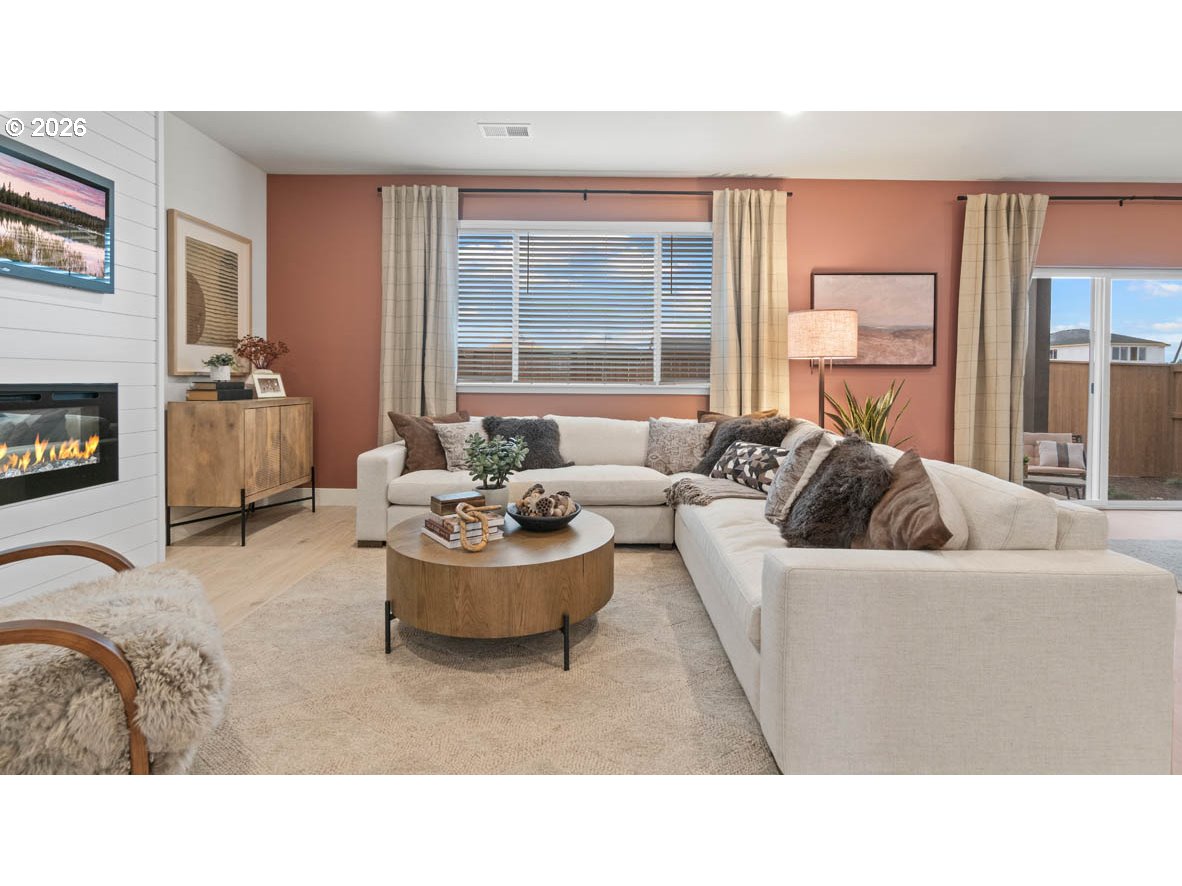 Welcome the Coral floor plan at Sorrento Estates in Salem, Oregon. This beautiful two-story 2,230 square foot floor plan has 4 bedrooms plus a den, 2.5 bathrooms, and an attached 2-car garage. As you walk in, there is a den that provides flexibility for hosting guests. Walking down the hallway and past the extra storage closet, the great room invites you into the open and modern area that includes the dining room and kitchen. A floor-to-ceiling electric fireplace centers the living area. The kitchen offers plenty of space and amenities to create your favorite meals. It features solid-surface countertops, shaker-style cabinets with matte black pulls, stainless-steel appliances, and a pantry for added storage. The upstairs secondary bedrooms each have its own spacious closet, and the third bedroom also include a walk-in closet. The primary bedroom offers a open layout, providing a serene space with an en suite bathroom featuring a double vanity, walk-in shower, a bathtub, a spacious walk-in closet, and a bonus closet for all your clothing! The upstairs laundry room adds convenience to your routine without having to haul your clothes between floors. Receive a closing cost credit with use of builder’s preferred lender, reach out for more details. We know you will love this Coral floor plan. Photos are representative of plan only and finishes may vary as built.