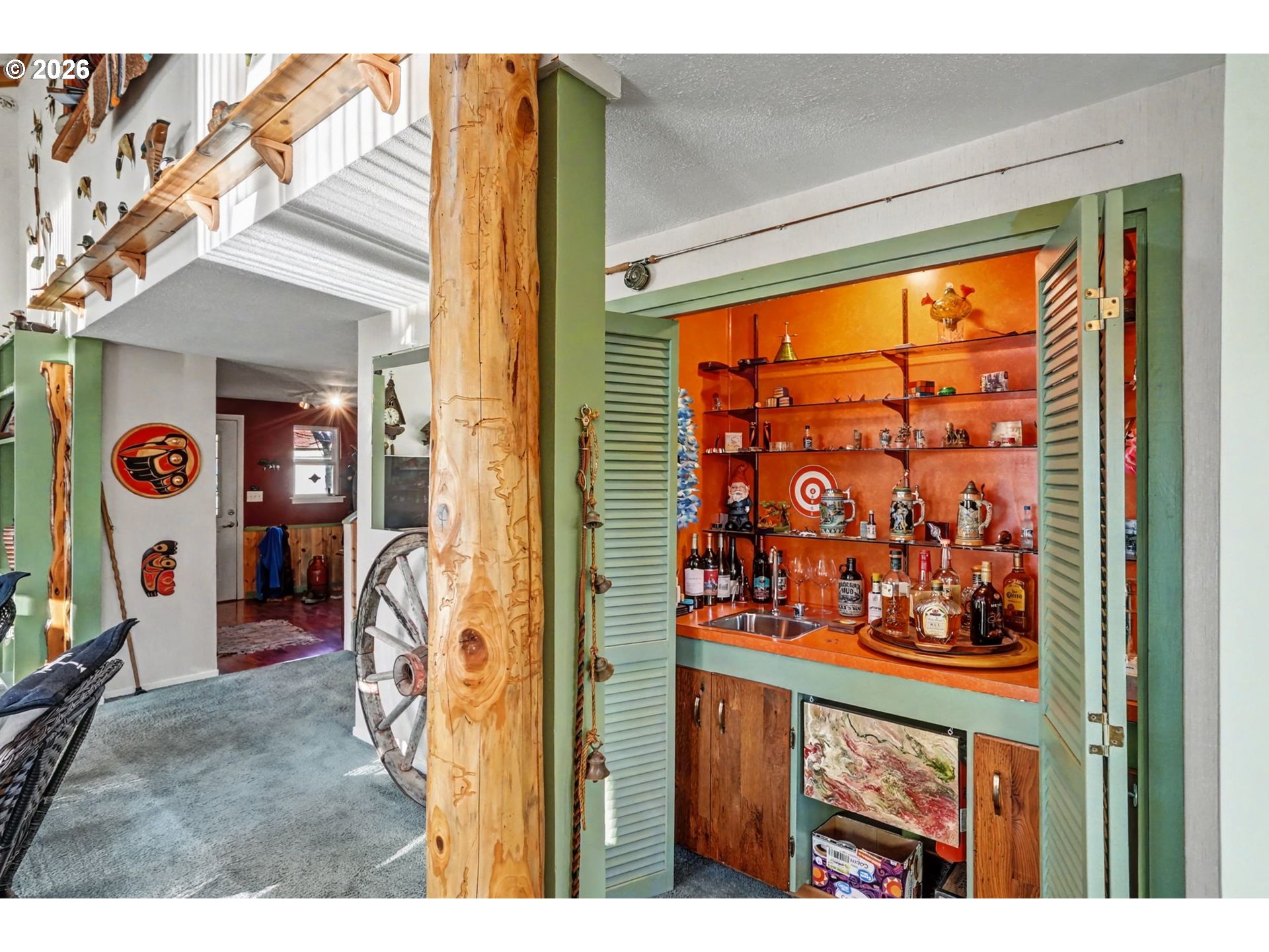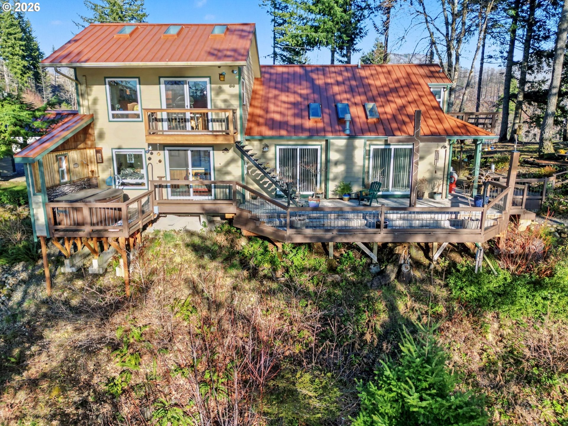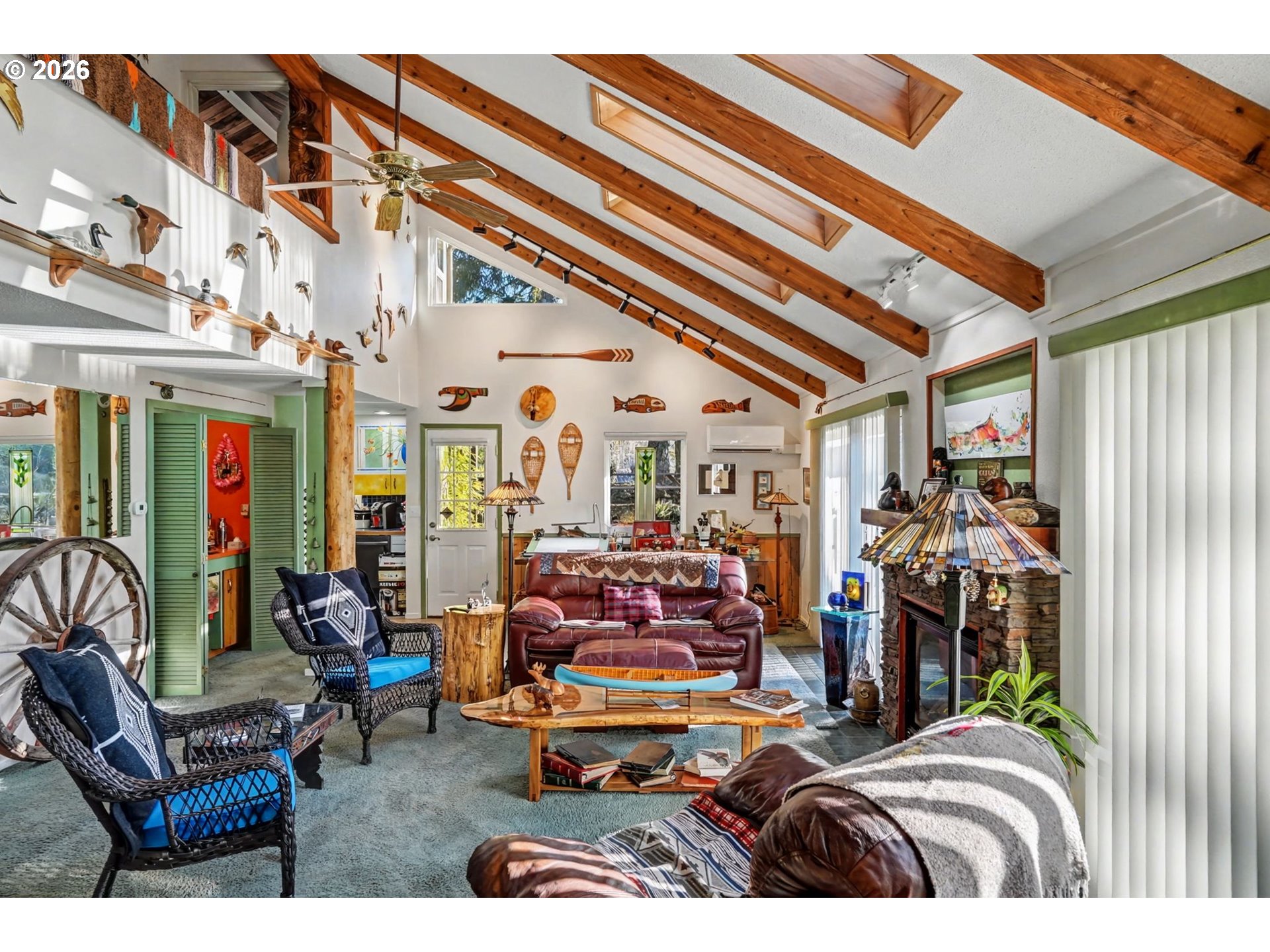 Set along the pristine North Fork River, this one-of-a-kind custom riverfront property offers privacy, craftsmanship, and lifestyle on approximately 1.5 acres surrounded by a non-buildable buffer. The ~2,200 sq ft, two-story home has an effective date of the early 2000’s features concrete siding, a metal roof, and triple-pane windows and doors, blending Mediterranean craft style with thoughtful design.Interior highlights include stained open-beam ceilings, knotty pine accents, skylights, picture windows, and a great room with gas fireplace and heat pump system. Sliding glass doors connect indoor living to decks and patios with river and garden views. The galley kitchen showcases custom floral-painted cabinetry by internationally recognized artist Patricia Woof, tile countertops and splash boards, quality appliances, and a bright breakfast nook with built-ins and office/library space.The primary suite offers French glass doors, private balcony access, outdoor hot tub and shower areas, walk-in dressing room, and a spacious bath with soaking tub, walk-in shower, and pet-wash hardware. Guest accommodations include a fully tiled bath with indoor terrarium and skylight, plus a vaulted-ceiling guest bedroom with custom built-ins and deck access.Outdoor amenities include covered patios, a river-view pavilion with power, swimming access, full RV hookups, and a rare county-built rock dock overlooking salmon and steelhead movement. Two large outbuildings provide nearly 4,000 sq ft under roof, including a heated workshop and high-bay RV storage. A greenhouse with skylights and native landscaping completes this exceptional riverfront retreat.