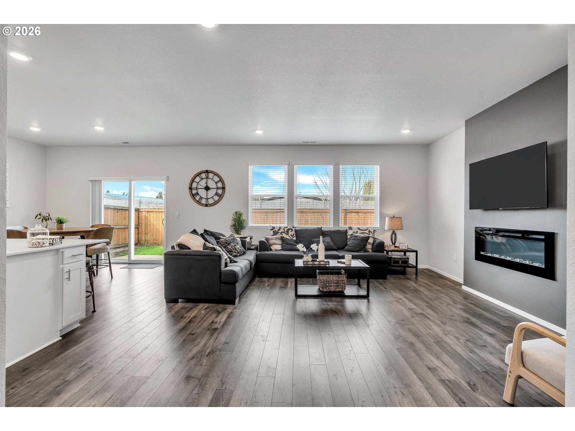 This beautifully designed two-level home offers a spacious and functional layout with common living areas downstairs and private spaces upstairs. The main level features laminate flooring throughout and an open-concept design where the living room and kitchen flow seamlessly together, creating an ideal space for entertaining and everyday living. The living room includes a cozy gas fireplace, while the home is filled with abundant natural light throughout.The large kitchen is a true highlight, showcasing a generous island, beautiful finishes, pantry, eat bar, and a dedicated dining area. Sliding doors open directly to the backyard patio, enhancing indoor-outdoor living.Upstairs, you’ll find four bedrooms plus a versatile family room, all with wall-to-wall carpet and closets. The primary suite features a walk-in closet and a private ensuite bathroom with double sinks and a walk-in shower.Step outside to a fully fenced backyard with a patio and yard space, perfect for relaxing, entertaining, or play. With its thoughtful layout, spacious design, and inviting finishes, this home offers comfort, style, and functionality all in one.