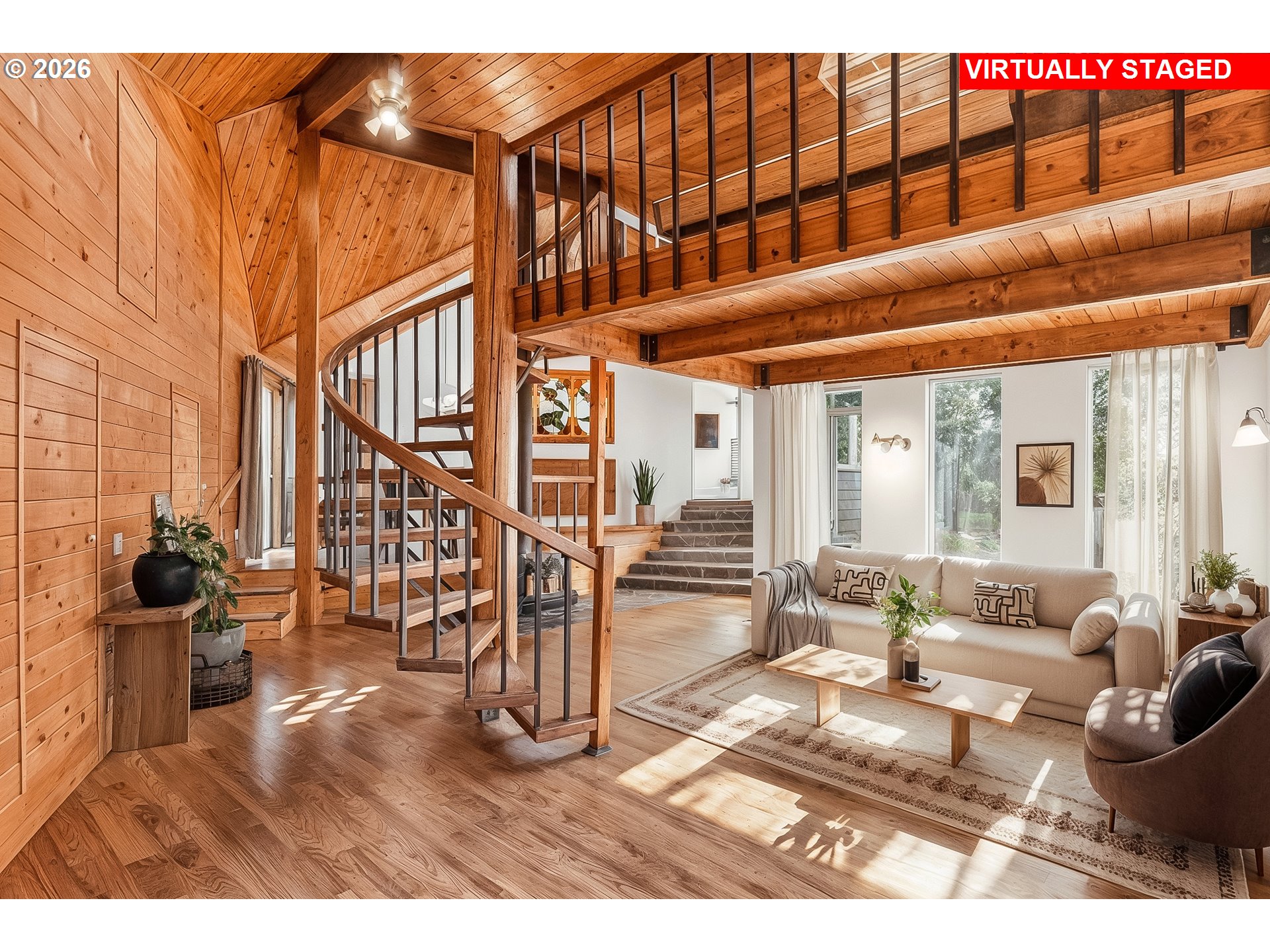 Set on a private half-acre flag lot property this one-of-a-kind home blends rustic farmhouse warmth with distinctive architectural design and modern updates. Vaulted pine plank ceilings, wood-cased windows, and hardwood floors across the main level create a rich, inviting character, while engineered hardwood floors continue throughout the upper level. Enjoy beautiful views of Mount Hood and the city from multiple vantage points. The spacious living room features hardwood floors, a wood stove, and direct access to a relaxing sauna. The kitchen combines charm and function with a copper sink, tile floors, stainless steel appliances, pantry, breakfast nook, and a stained-glass serving window that opens to the dining area. The main level includes two bedrooms (or bedroom + office), including one with a wood-burning fireplace, plus a laundry room with built-in storage. A beautifully crafted spiral staircase leads to a separate loft space tucked into its own section of the home and ideal for a studio or creative workspace. In the main upper level, you’ll find a second loft area with city views, along with the primary bedroom featuring double closets (including a walk-in with organizers) and an additional bedroom. The detached exterior flex space with power adds exceptional versatility, ideal for a future ADU (buyer to verify), guest quarters, home office, gym, or dedicated studio. Combined with the expansive patio, covered carport, room for a hot tub pad, and generous yard, the property is perfectly suited for indoor-outdoor entertaining or multi-generational living. Recent updates include a new furnace and A/C (2019), roof (2015), water heater (2022), and washer/dryer (2021). Conveniently located just minutes from stores, shopping, dining and easy access to I-5, this property offers privacy, personality, and versatility in a rare setting.
