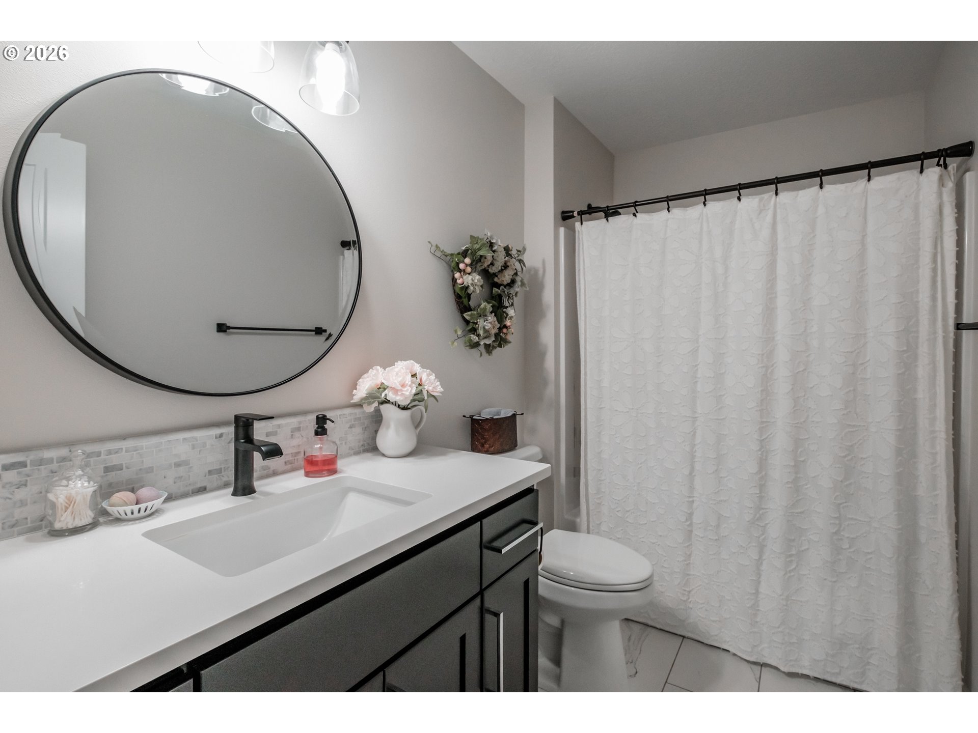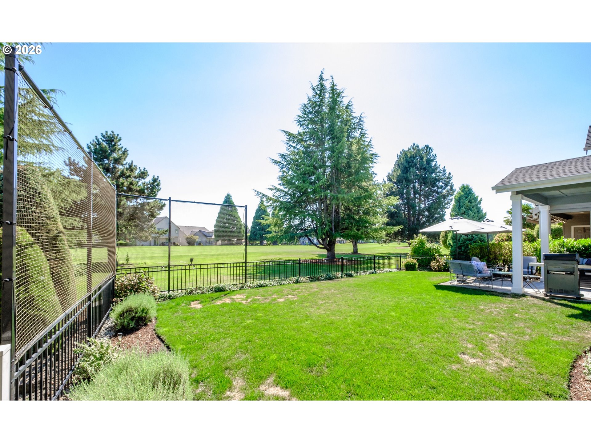 Exceptional custom-built home in Tukwila Estates, ideally positioned on the 9th fairway of this prestigious OGA golf course community with wide open views and a true resort style setting. Light filled great room with dramatic wood beams, expansive windows and a floor to ceiling stone gas fireplace. Gourmet kitchen with quartz counters, large island, subway tile, GE Café S.S appliances and pantry, open to the main living space and designed for entertaining. Dining area opens to an extended covered patio with recessed lighting overlooking the fairway and a beautifully maintained, usable backyard. Main level office and spacious primary suite with vaulted ceiling and custom accent wall. Spa inspired primary bath with dual vanity, freestanding soaking tub, oversized glass walk-in shower and closet with built in dressing vanity. Upstairs offers a large media, additional bedrooms and an updated secondary bath. Dual climate control for each level, custom window coverings and finished garage with extra storage. HOA maintained landscaping, clubhouse, community pool, walking trails, and tennis and pickleball courts. Live where every day feels like a getaway!