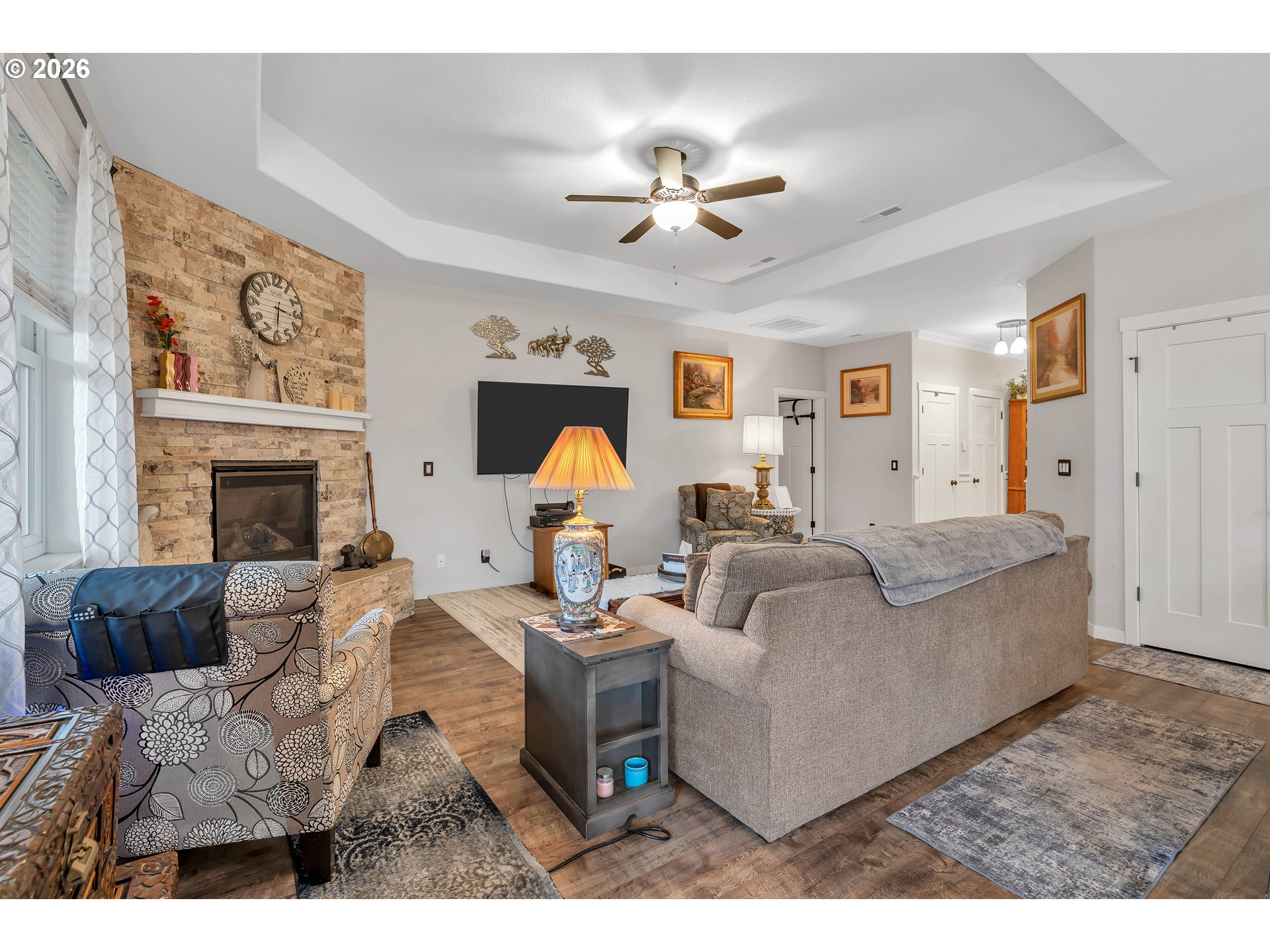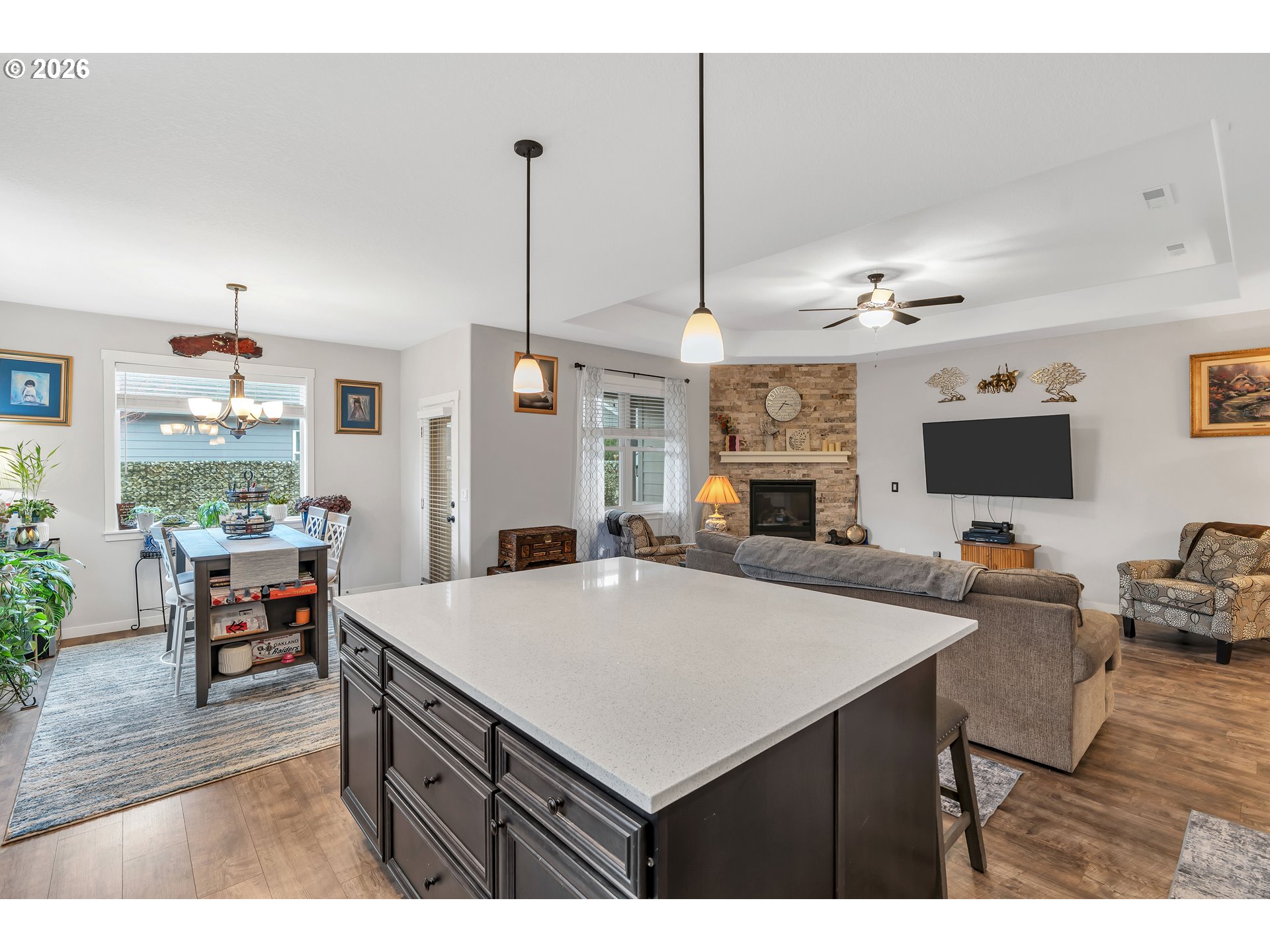 Beautiful one-level living in the sought-after “Nolan” plan by Double Down Development, where every surface showcases thoughtful upgrades and quality craftsmanship. This 3-bedroom, 2-bath home offers a bright, open layout designed for both comfort and style.The living room makes a stunning impression with a dramatic corner gas fireplace featuring a stone surround and hearth, complemented by an elegant coffered ceiling. The gourmet kitchen is a true centerpiece, boasting a HUGE island, slab quartz countertops with full-height backsplash, soft-close cabinetry, stainless steel appliances, and a walk-in pantry—perfect for entertaining and everyday living.The spacious primary suite offers a relaxing retreat with double sinks, tile flooring, and TWO walk-in closets. Additional bedrooms are generously sized, and the laundry room includes convenient built-ins for added functionality.Enjoy year-round comfort with A/C and a tankless water heater. Outside, the fully fenced yard is professionally landscaped with sprinklers and a covered patio, ideal for outdoor living. Complete with a garage door opener, this exceptional home blends luxury, efficiency, and easy single-level living.