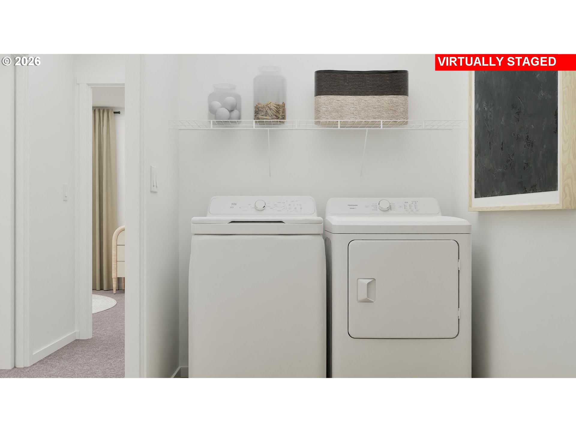 Laundry, LoVOCMaterial, LuxuryVinylPlank, Quartz, WalltoWallCarpet, WasherDryer