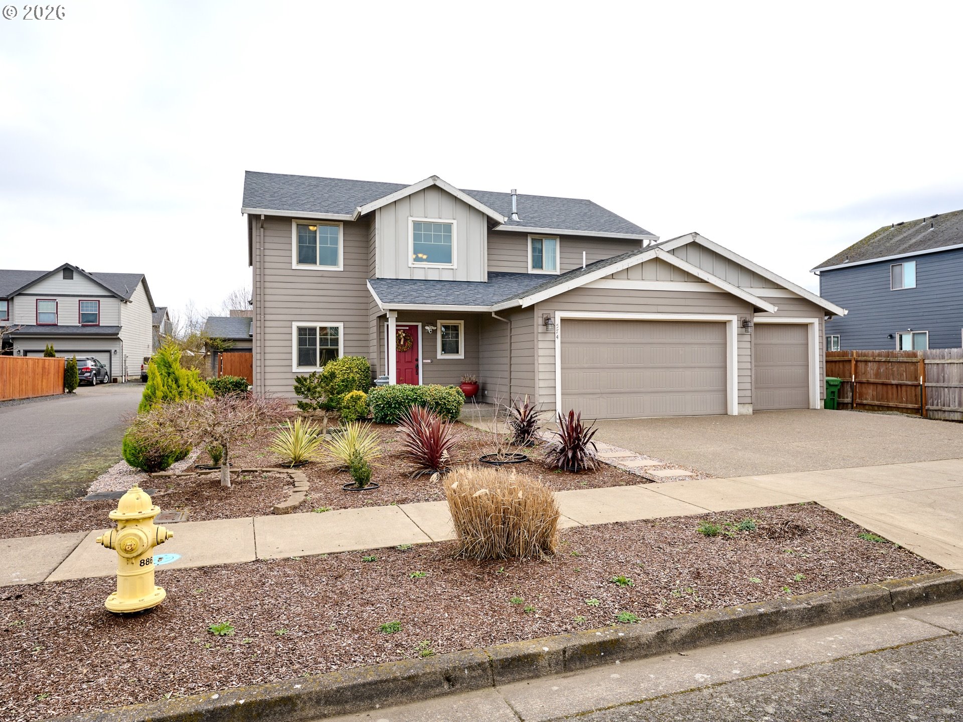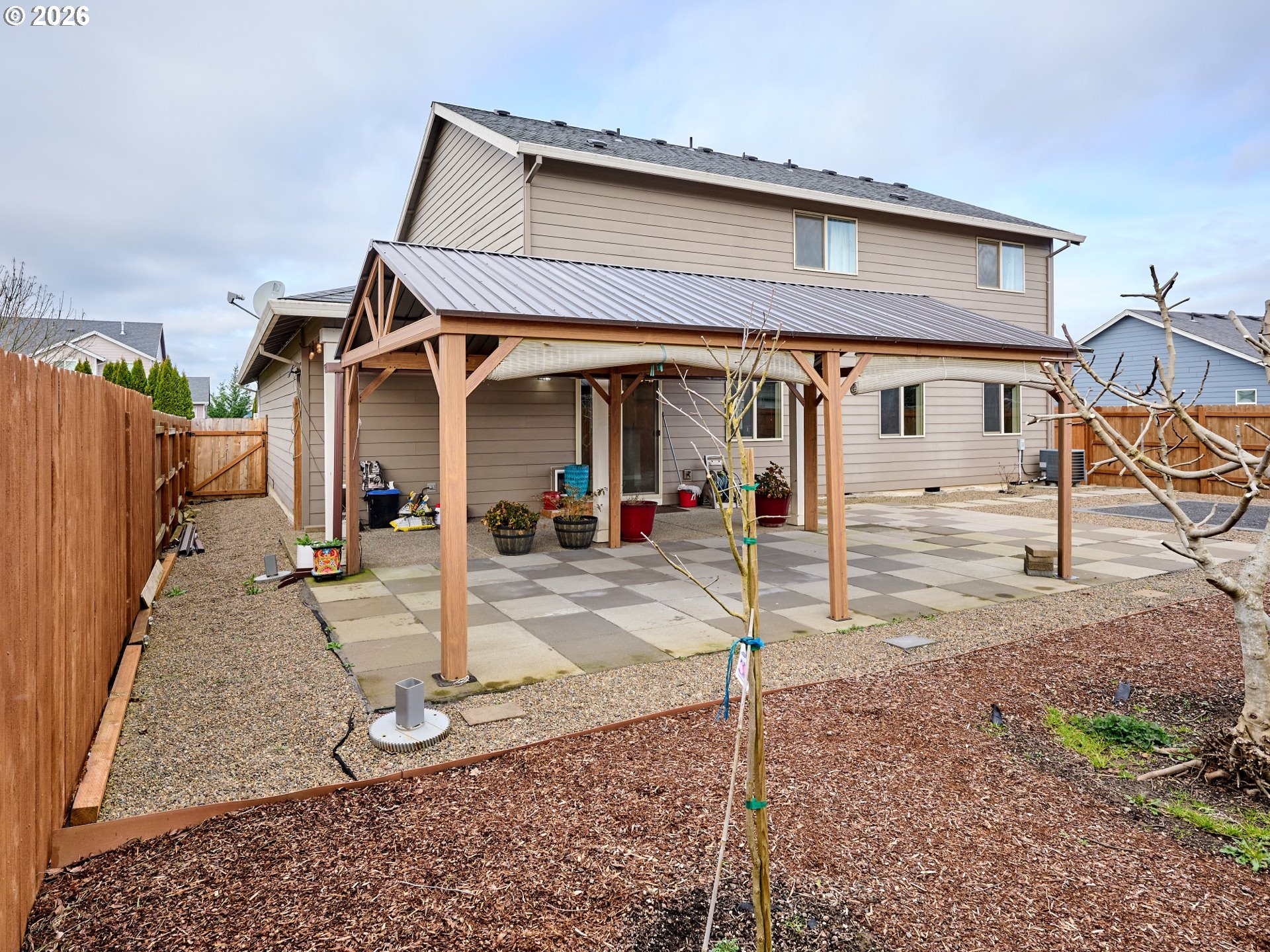 Welcome to your next home! This beautifully maintained 4-bedroom, 2.5-bathroom residence offers a perfect blend of comfort and convenience. The open kitchen seamlessly connects to the main living areas, creating a welcoming atmosphere for family gatherings. On the main floor, you'll find a versatile extra bedroom, ideal for use as a home office, guest den, or bonus room. Step outside to discover a backyard oasis, featuring a newly installed fence for complete privacy. Enjoy evenings around the designated firepit space, ready to entertain guests on the covered rear patio, complemented by an additional, newer, large covered patio, perfect for hosting parties. The property features a wide entry gate for easy backyard access and established trees, including fig, persimmon, cherry, and apple, offering both beauty and privacy. The front landscape is well cared for, with tidy greenery, trimmed shrubs, and a clean, inviting entryway that sets a warm first impression. Located in a well-established neighborhood, this home provides quick access to I-5 and nearby shopping outlets, ensuring convenience at your doorstep. The expansive and deep 3-car garage offers ample room for parking and storage, including built-in shelves, while established landscaping presents a beautiful, low-maintenance solution. To top it off, solar panels are incorporated for energy efficiency. Don't miss the opportunity to own this exceptional home, perfect for those who love to entertain and enjoy a serene, private setting.