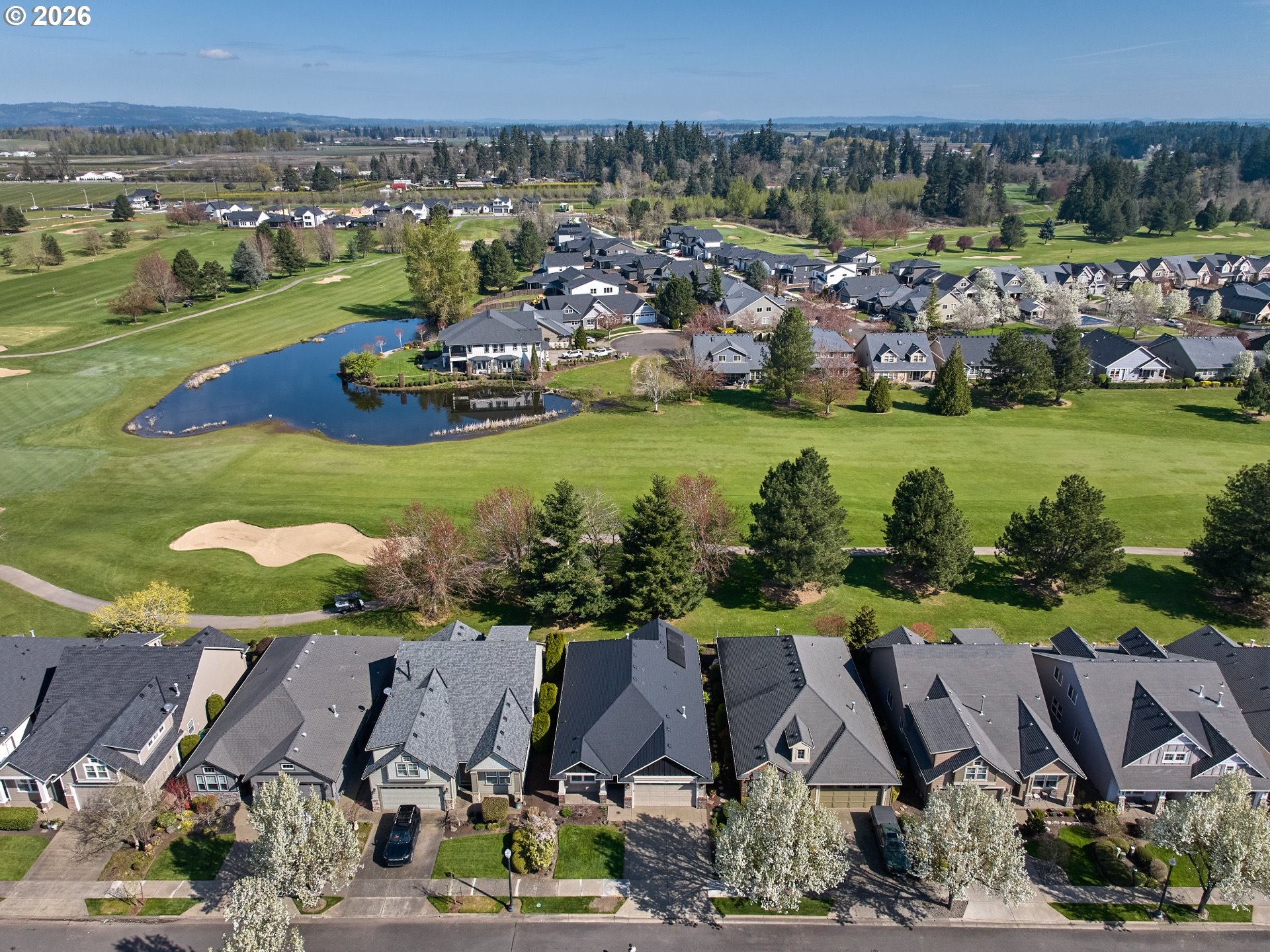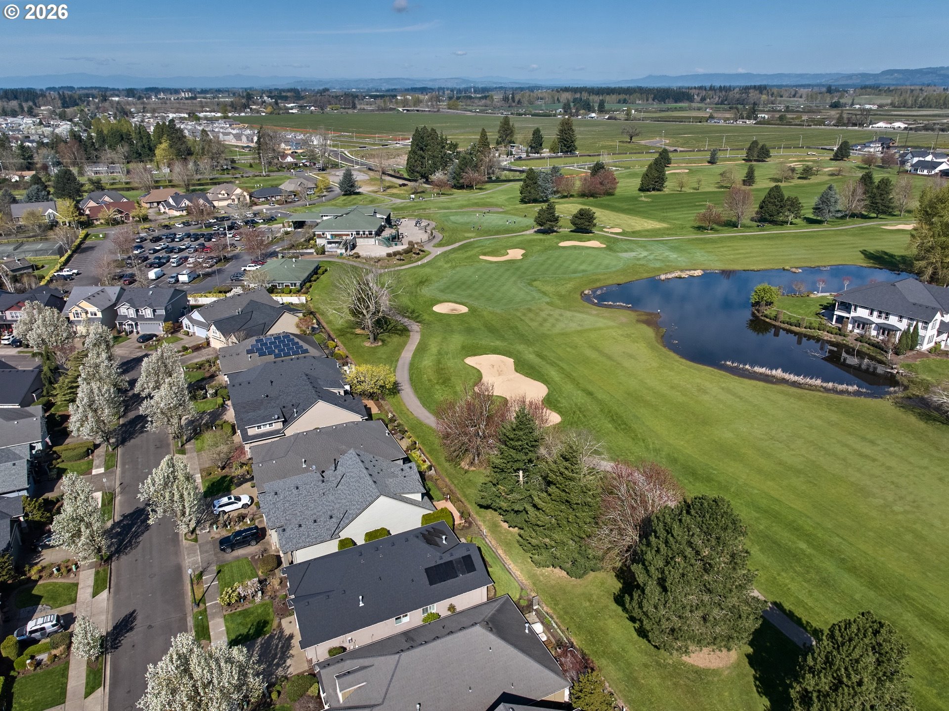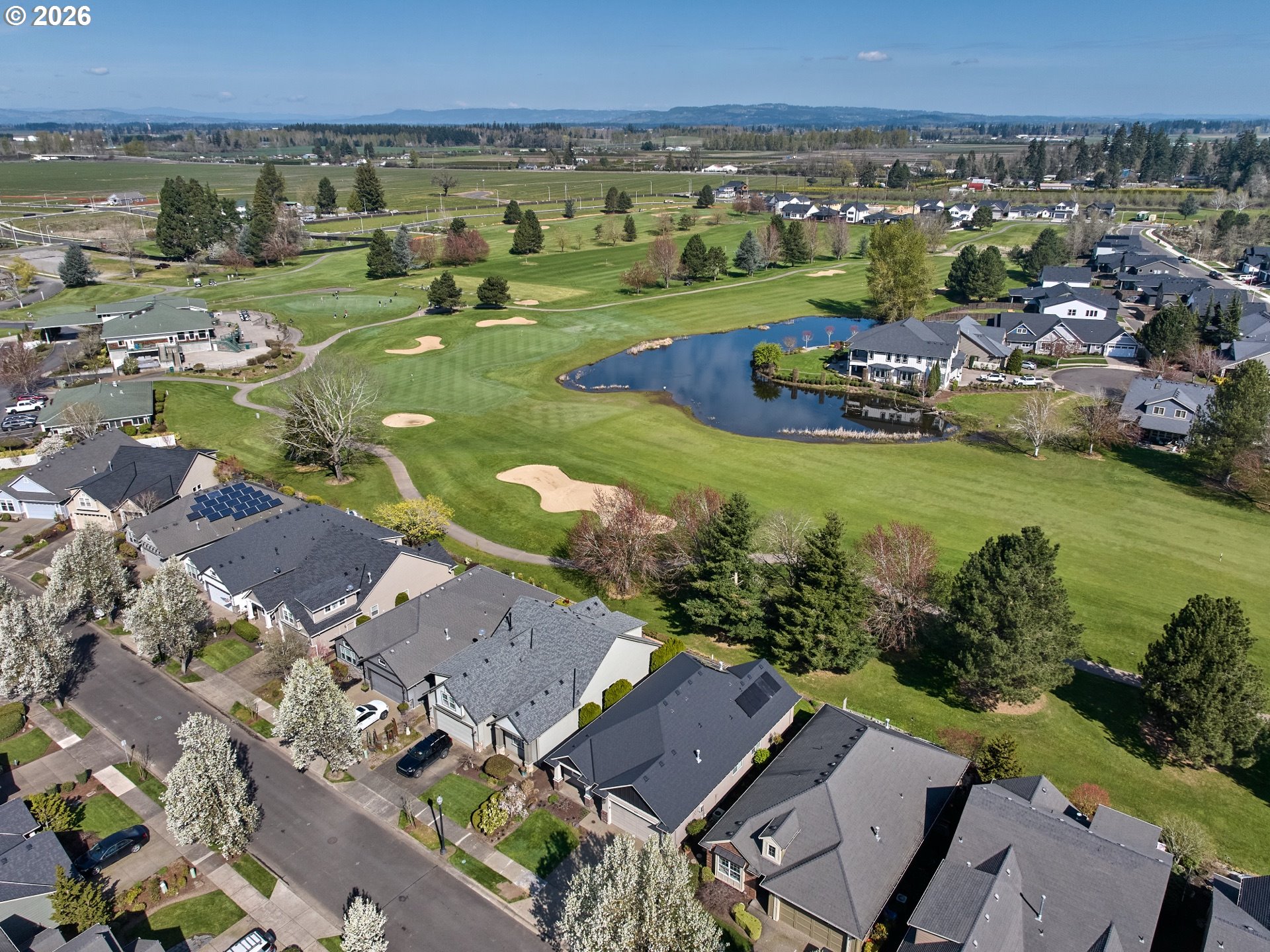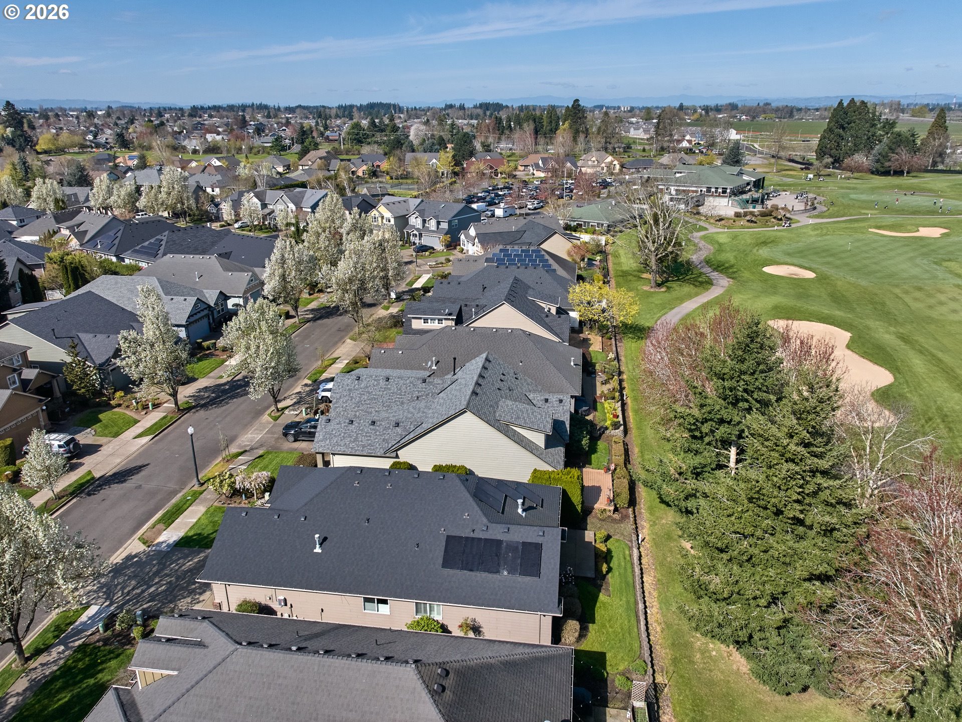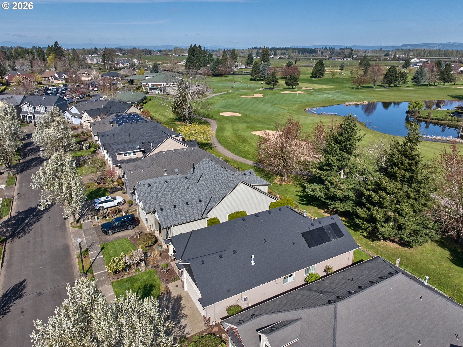 Welcome to this 2 Bedroom + Den/Office beautiful one-level Renaissance Home in Tukwila. Move-in ready and ideally situated on the 9th fairway of the OGA Golf Course. Pride of ownership shines throughout this immaculate home. Thoughtfully designed with high ceilings and abundant natural light, the flexible floor plan features a private den with French doors, high architectural ceiling, floor-to-ceiling windows, and a built-in desk perfect for a home office. The spacious gourmet kitchen is well-appointed for both everyday living and entertaining, offering a cook island with gas range, eating bar, wine fridge, stainless steel appliances, and pantry for added convenience. The kitchen opens seamlessly to the living and dining areas. The primary suite enjoys golf course views and includes a walk-in shower, soaking tub, dual sink vanity, and walk-in closet. Recent updates and features include new roof (2024), fully paid solar system (no cost to Buyer), fresh paint, hardwood floors and well maintained carpet. Additional amenities include a central vacuum system and surround sound system. Step outside to a beautifully landscaped backyard with a stunning golf course frontage. Enjoy year-round outdoor living on the patio that is plumbed with gas for BBQ or Fireplace. Located on a low travel street. A rare opportunity to own a meticulously maintained golf course home with premium upgrades in a highly desirable community!
