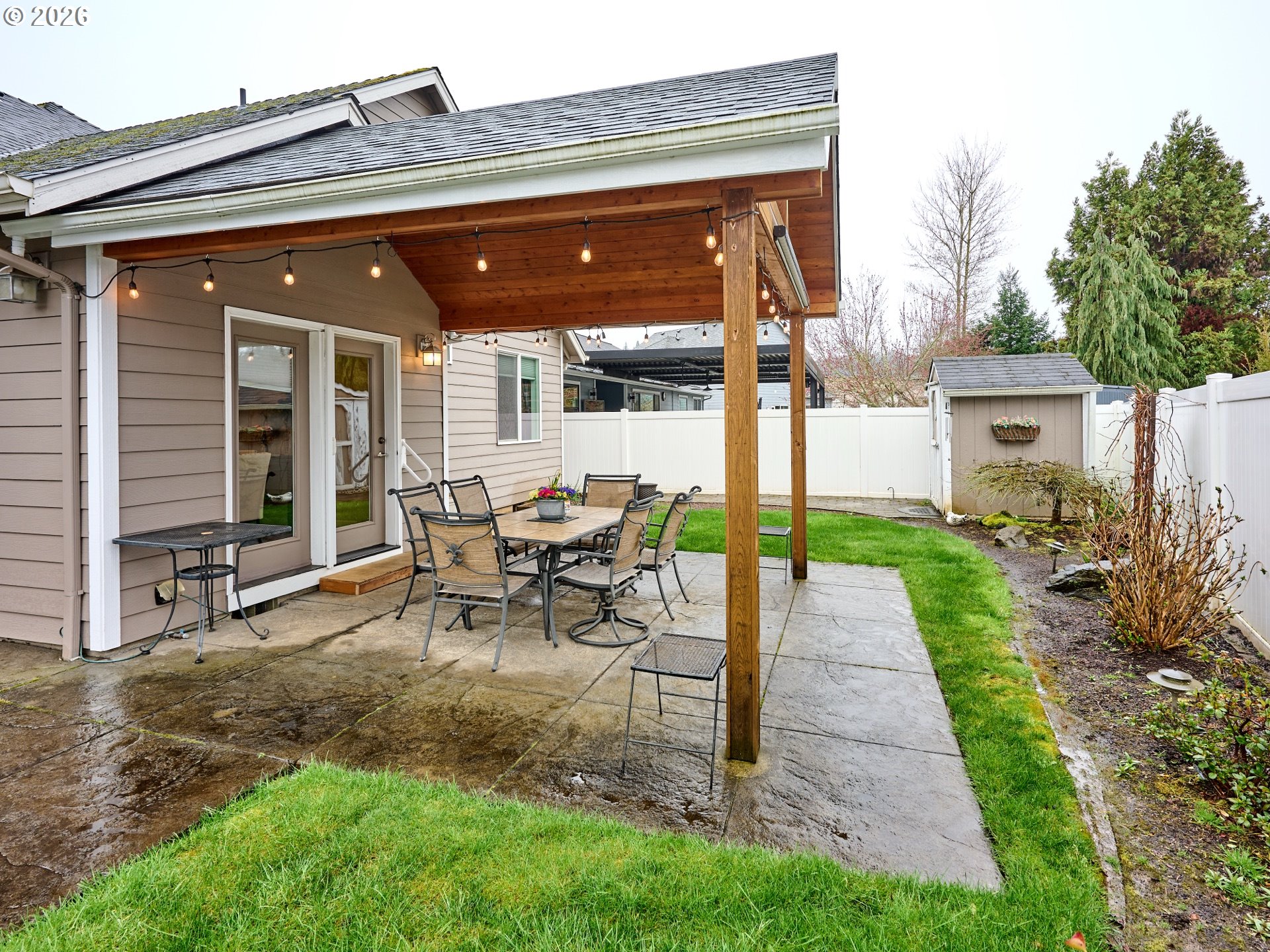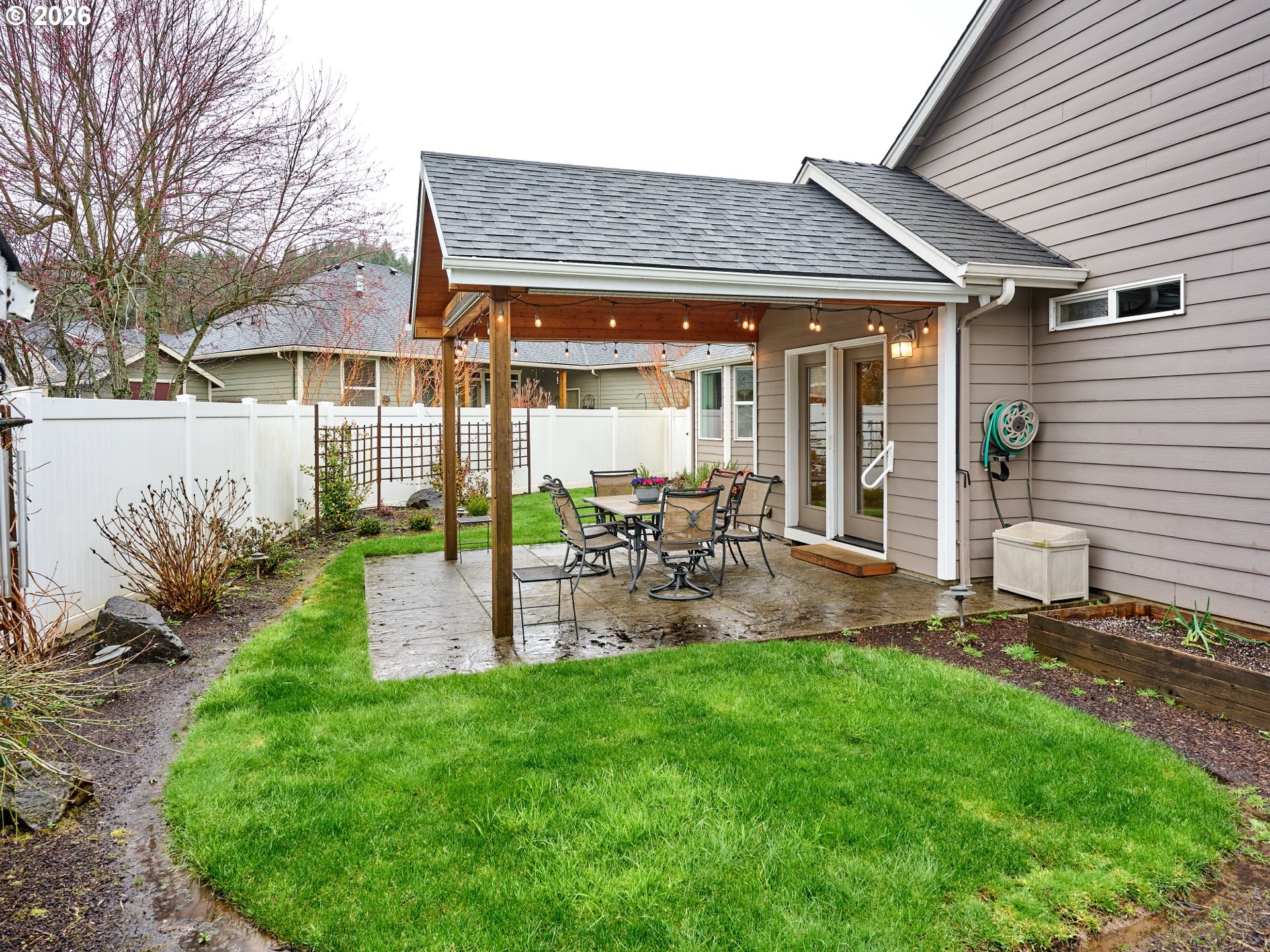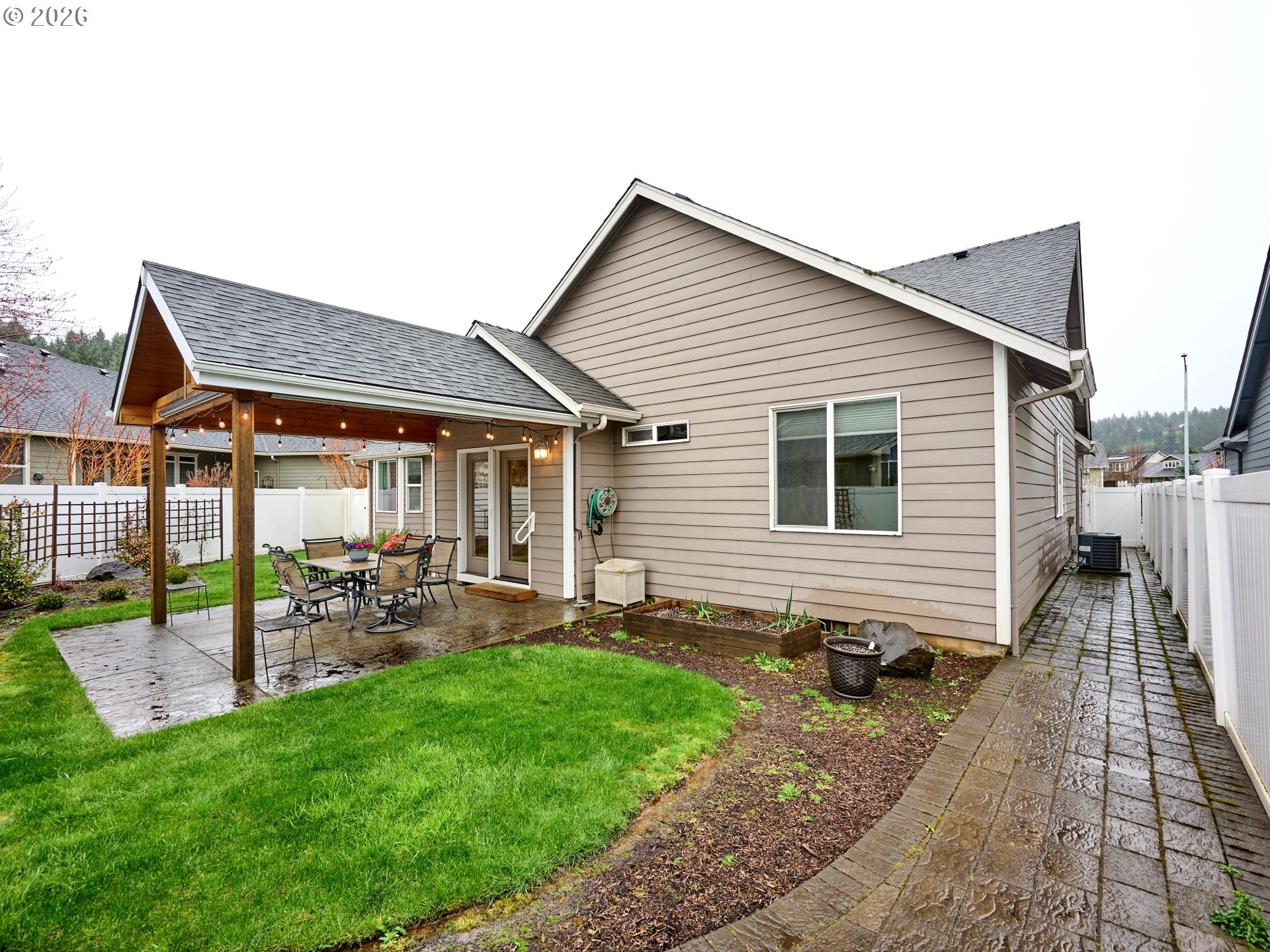 Stunning 1.5-story home featuring 3 bed and 2 bath with a thoughtfully designed, efficient layout that maximizes space and comfort. This beautiful property offers high-end finishes throughout and an inviting open feel. The upstairs bonus area could easily serve as a fourth bedroom, office, or flex space.Enjoy outdoor living in the fully fenced backyard complete with a custom-built covered patio—perfect for relaxing or entertaining year-round. The front walkway welcomes you with a charming water feature.
