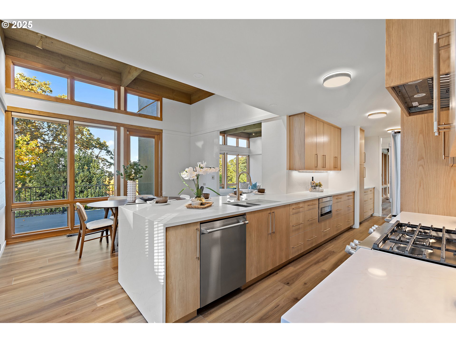 There is nothing like this extensively remodeled luxurious single level Mid Century classic featuring expansive chef's kitchen with custom White Oak cabinetry, high-end Café stainless appliances, pantry, drop zone, indirect cabinet lighting & plug-mold outlets. Stunning quartz counters with slab backsplash & island waterfall. 12’ ceilings with exposed beams & tongue-and-groove rough cut cedar. Designer bathrooms with limewash & lime plaster finishes. Great views, new Trex deck & atrium entry. Welcome Home!