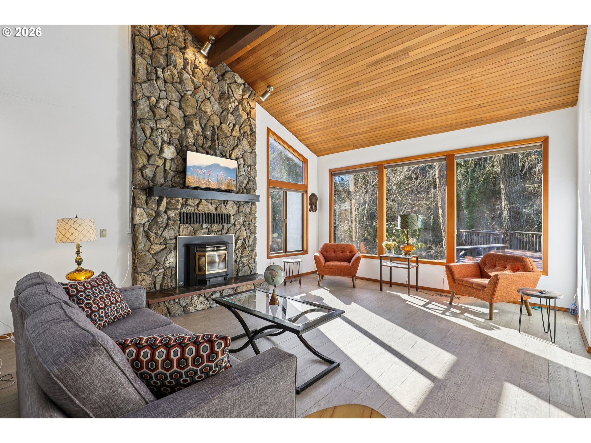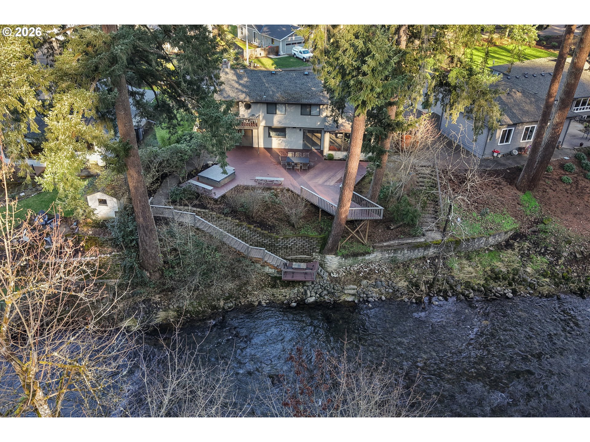 Rare waterfront home in Silverton offering direct river access in a peaceful, private setting. Enjoy fresh-water recreation, including swimming or wading, along with easy access to local pathways, downtown Silverton, and the public library. Extensive updates include a fully renovated kitchen, a rebuilt lower Trex deck, and a refinished upper deck designed to maximize outdoor living and river views. Surrounded by lush, year-round landscaping with accent lighting, the home features an open-concept interior with soaring ceilings and a natural stone fireplace. The chef’s kitchen boasts a 12-foot marble island with generous storage, GE Profile gas double oven with convection and Wi-Fi, commercial-grade vented hood, ceiling speakers, and smart lighting throughout. A centrally located main-floor command center adds convenience. The primary bedroom includes a private balcony with river views. A rare opportunity combining privacy, recreation, and walkability in one of Silverton’s most desirable locations.