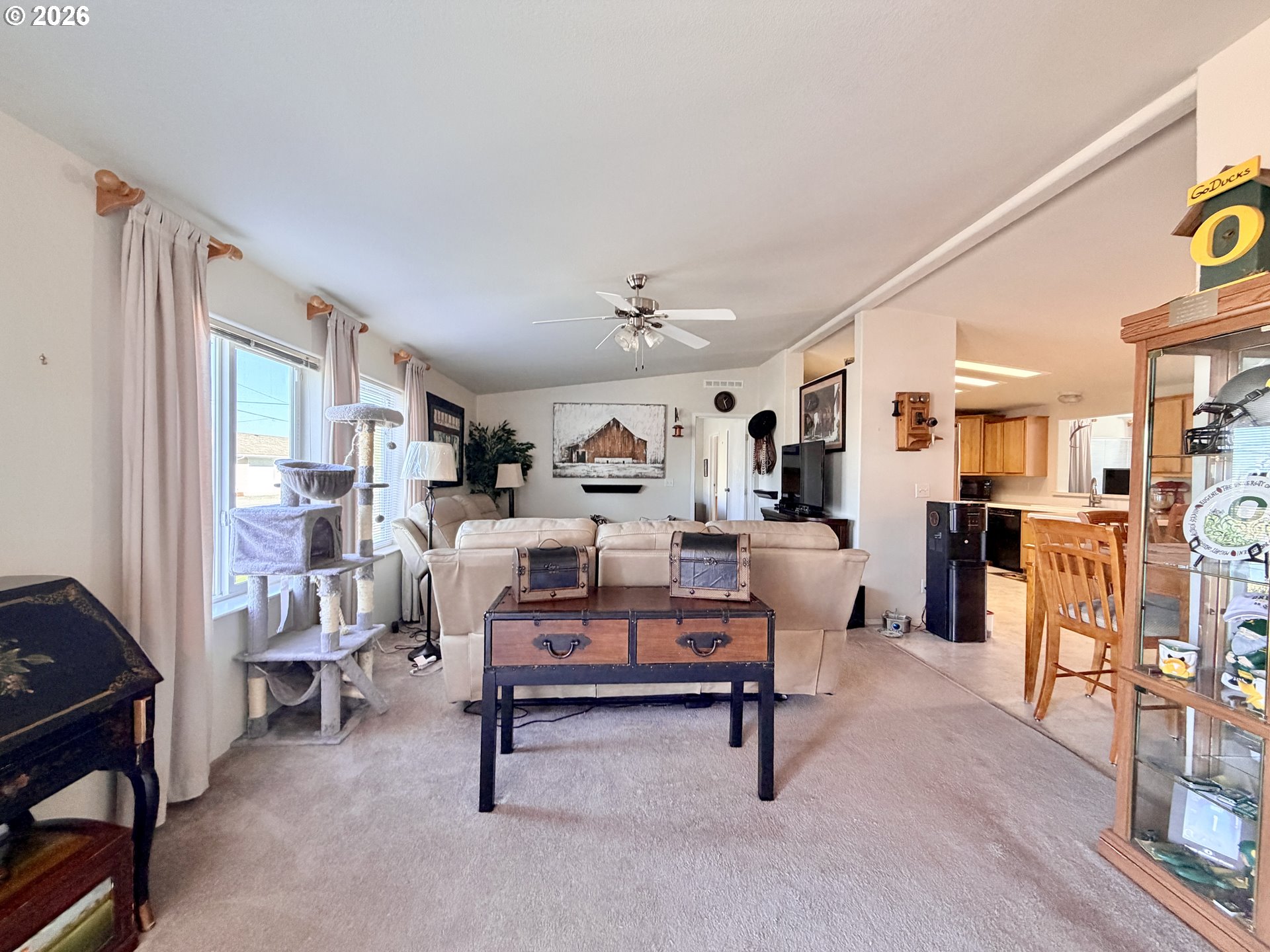 Welcome to this exceptional double-wide home with a pod on a spacious corner lot near the Columbia River, ideal for fishing and boating enthusiasts. Step inside to an entry that flows into a comfortable living, dining, kitchen, and second living space. The dining area opens to a generously sized kitchen. You’ll find extensive cabinetry, a pantry, and a vaulted ceiling that adds volume to the space. Off the kitchen/dining room, a second living area adds flexibility—ideal for gatherings, hobbies, or a quiet retreat. This space features a vaulted ceiling, abundant windows, and a sliding door that opens to a covered deck for outdoor enjoyment. Primary bedroom is entered off the living room with the ensuite having a double sink vanity, walk-in shower and linen closet. On the opposite end of the home is a full bathroom with adjoining laundry, and two spare bedrooms that have vaulted ceilings. Outside, the property is equipped with timed underground sprinklers, fencing with gates, and gutters. An oversized 26x38 garage was built alongside the home and features insulation, lighting, a propane heater, roll-up door with opener, and multiple outlets—ready for projects or storage. There’s also generous RV parking with (2) 50-amp hookups. A new HVAC system was installed in 2024. If you’re looking for a property that offers usable space inside and out, this one is worth seeing and let this be the home you move into!