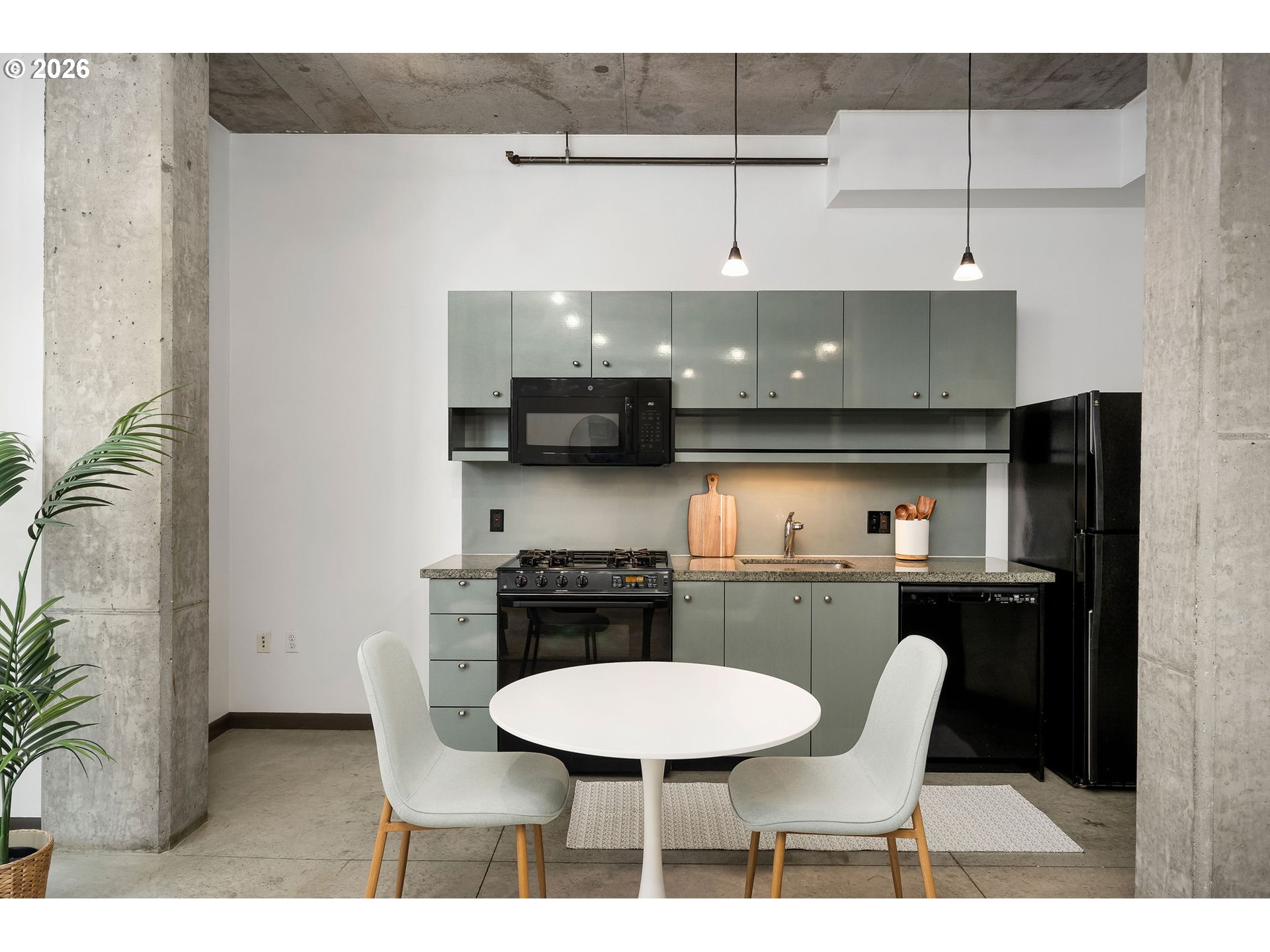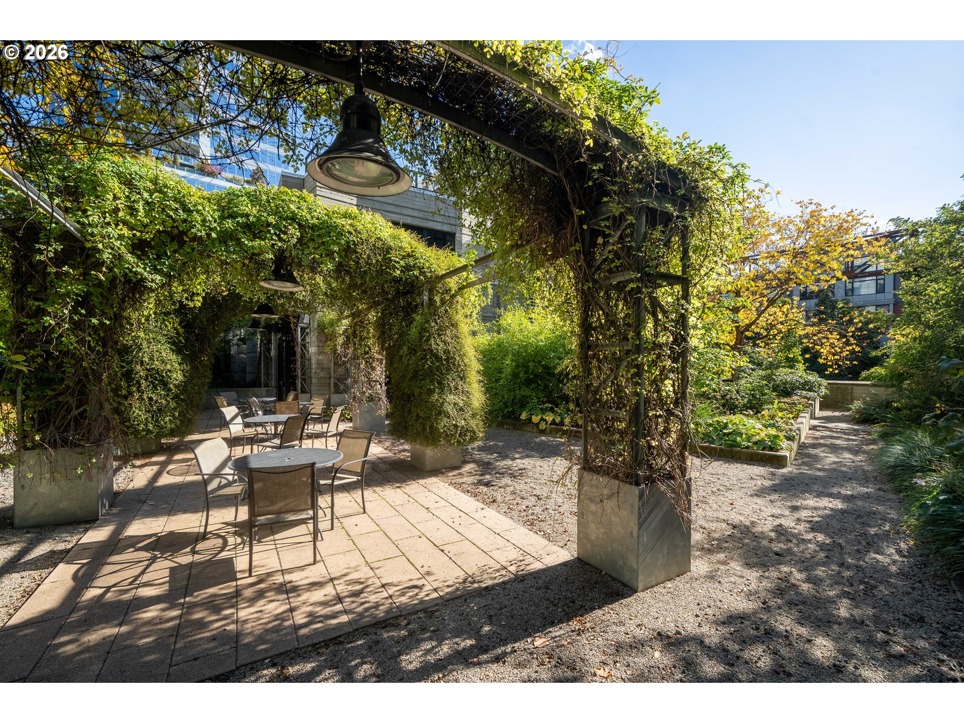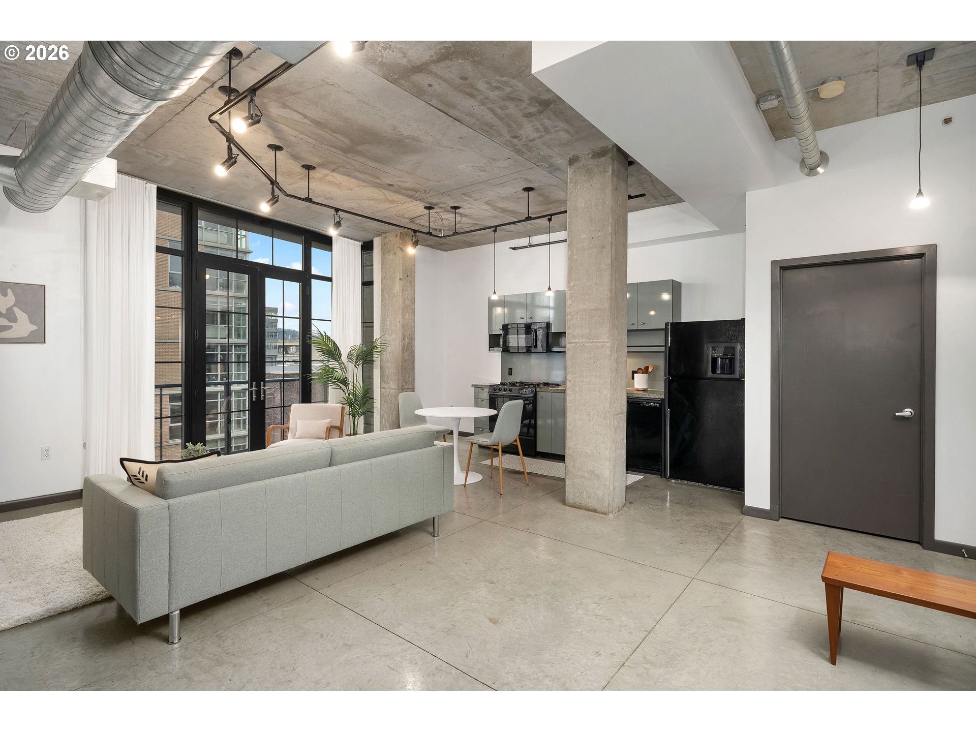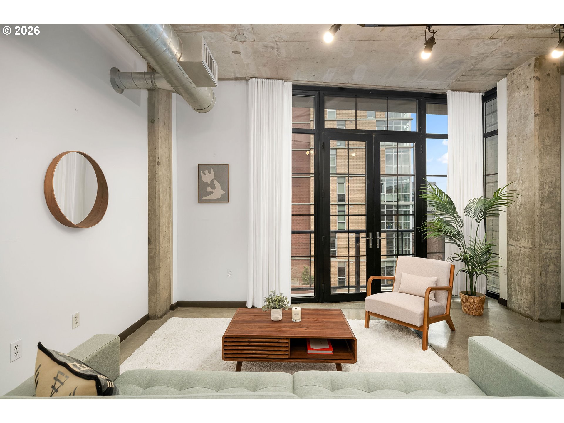 Streetcar Lofts no. 415. A refined pied-à-terre with an open, west-facing living space framed by 10-foot French doors and floor-to-ceiling windows. Enjoy sunsets with peekaboo views of Portland’s West Hills. Below, the landscaped courtyard is a certified wildlife habitat, a quiet green counterpoint to the city. The fitness studio overlooks NW Lovejoy, grounding your daily routine in the rhythm of the neighborhood. Deeded parking and generous storage add rare convenience. With a 99 Walk Score, cafés, galleries, parks, and the streetcar are just outside your door.