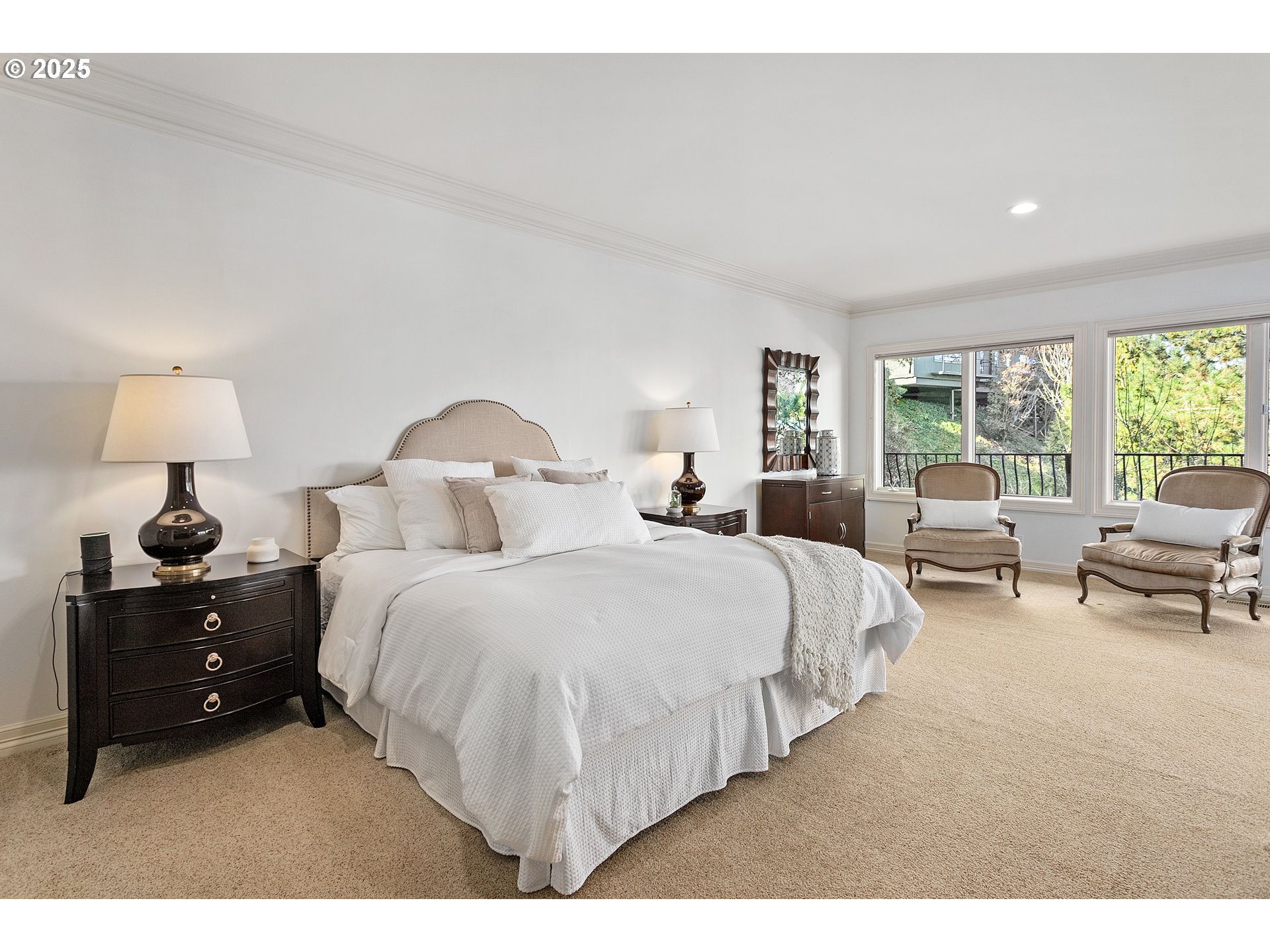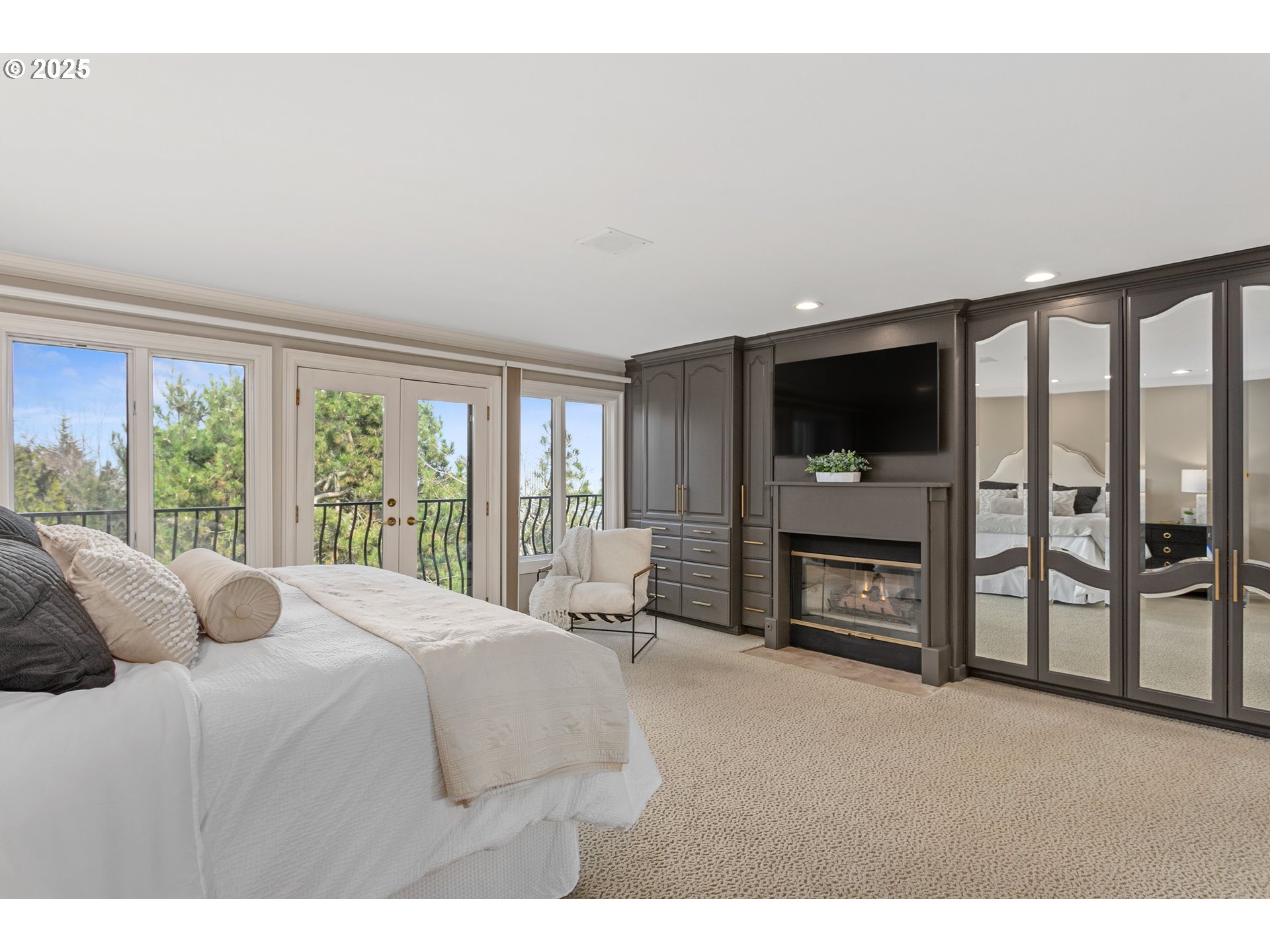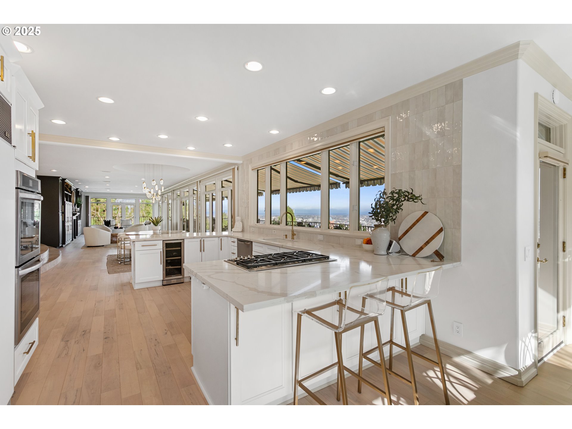 Amazing price for Portland Heights! Breathtaking unobstructed views & unparalleled gated privacy await. Experience luxury living at its finest in this beautiful Portland Heights home. Perched high above the city, this exceptional residence boasts panoramic views of the city, river, and mountains—creating an awe-inspiring backdrop to your everyday life. Step into the stately foyer, where a dramatic wall of windows immediately captivates, seamlessly blending indoor elegance with the beauty of nature. Designed for effortless living and exceptional entertaining, the open-concept main level features hardwood floors that flow through the sophisticated living, dining, and kitchen areas. The living room is a masterpiece of comfort, complete with built-ins, a gas fireplace, and access to the expansive wraparound deck—perfect for sunset toasts or morning tranquility. The formal dining area is as grand as your imagination, offering a setting for intimate dinners or large gatherings. At the heart of the home, a newly renovated chef’s kitchen dazzles with classic white cabinetry, gleaming quartz countertops, a stunning wall of counter-to-ceiling tiles, and automated blinds. High-end appliances, including a Wolf cooktop, double ovens, and a Subzero refrigerator, elevate the culinary experience, while the dry bar and sunlit nook provide the perfect finishing touches. The main-floor primary suite is a retreat with deck access, a warm fireplace, and abundant closets. The en-suite bath features dual vanities, a walk-in shower, a discreet laundry area for ultimate convenience, and more closets. A stylish half bath completes the main level. The lower level is a haven of its own, with a spacious family room with a fireplace and opening to covered decks for year-round enjoyment, an en-suite bedroom with a fireplace, a third bedroom, a full bath, plus a large laundry room and extensive storage space. OPEN SUNDAY APRIL 12TH FROM 1:00 PM - 3:00 PM [Home Energy Score = 1. HES Report at https://rpt.greenbuildingregistry.com/hes/OR10221292]
