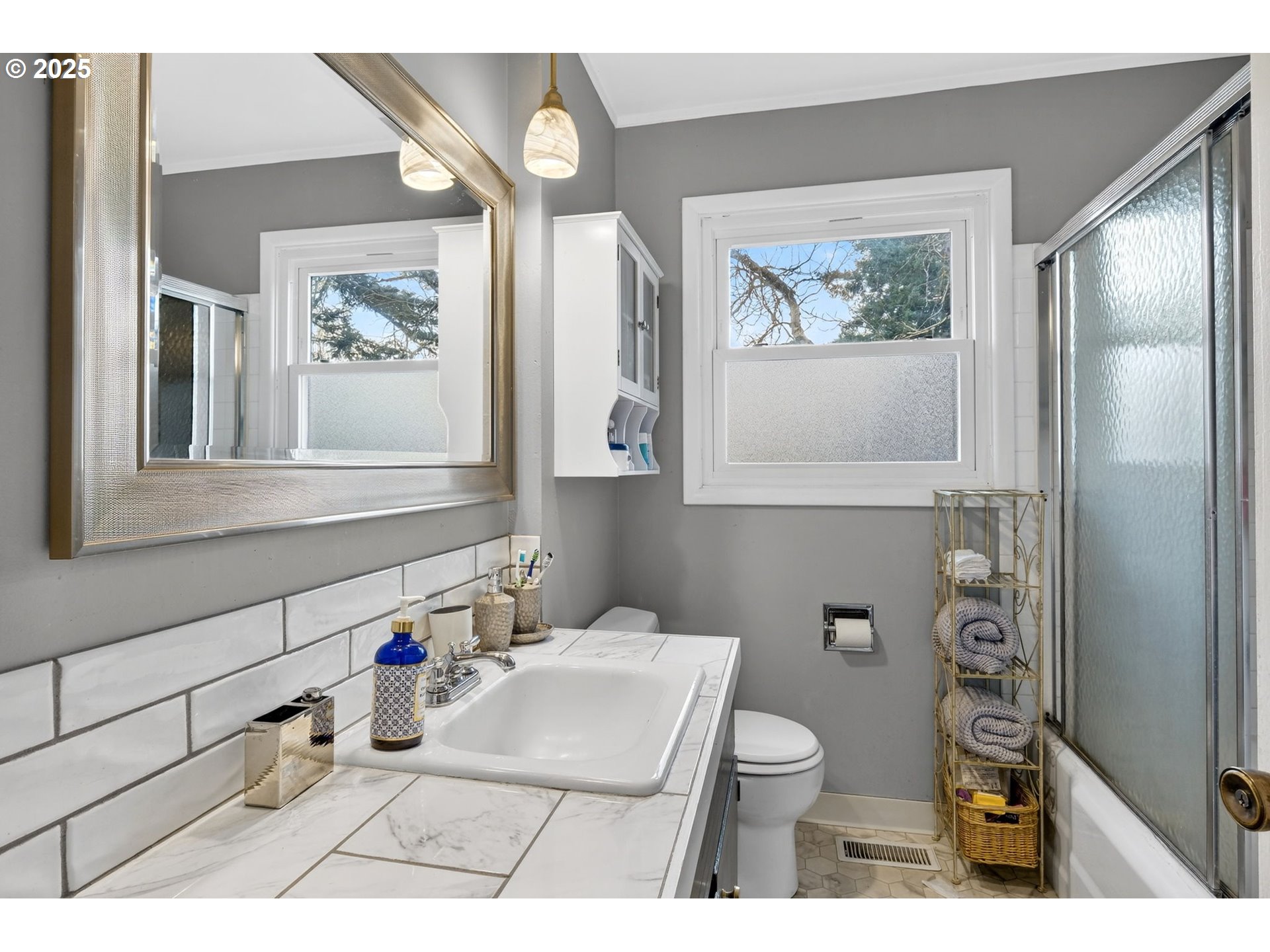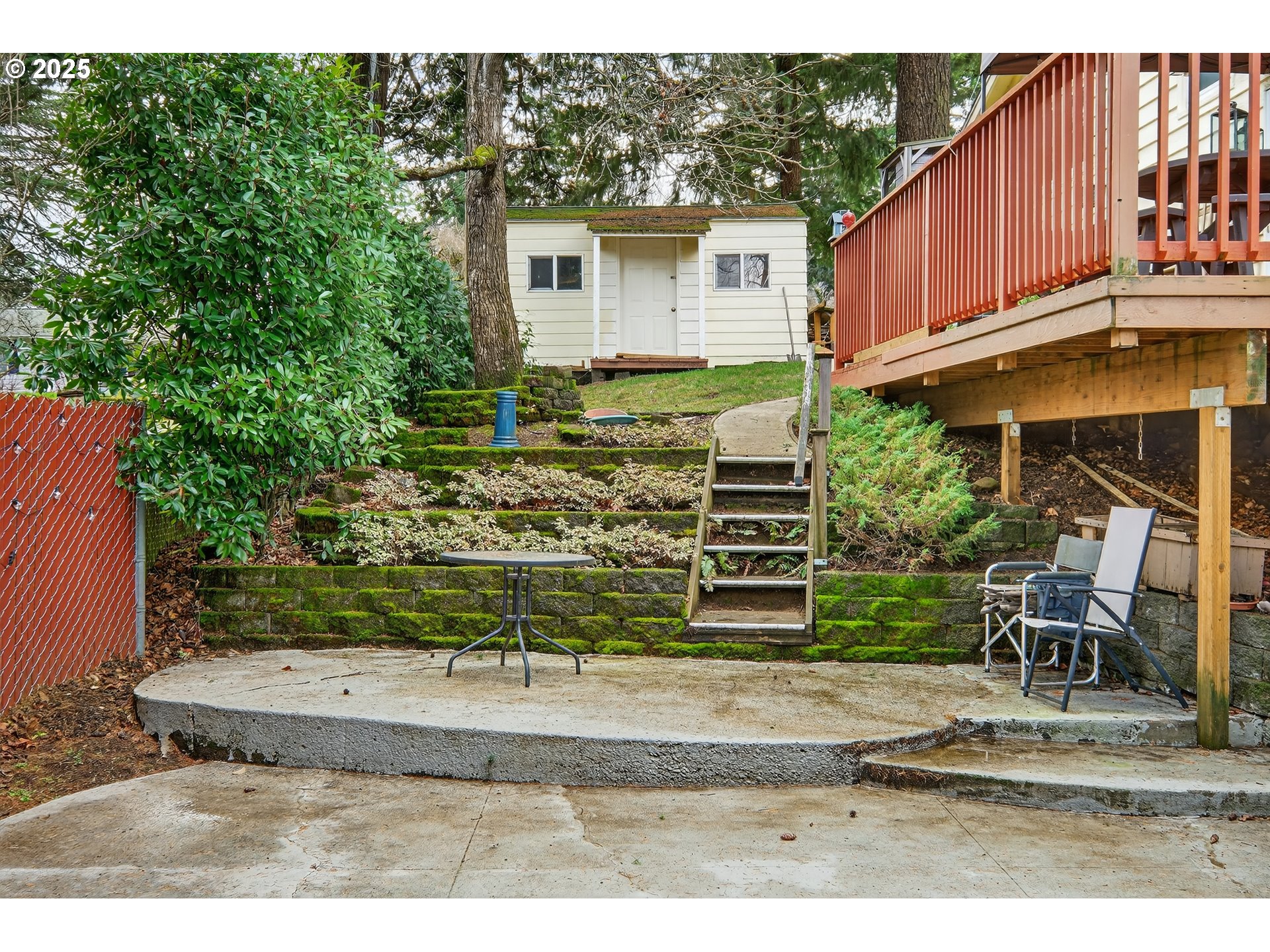 Move-in Ready, well maintained & updated Contemporay Home at top of dead-end road with easy turn round. Definitely can easily be a multi-generational Home. 3 Bedroom, 2 Bath, 2 Fireplaces. An interior staircase accessible from interior of garage is split both up to main level and down to lower level. Efficient galley kitchen leads out to spacious deck with patio below. Hardwood flooring on main level. Pellet Stove insert in living room. 2nd Fireplace in the separate living space on lower level. Spacious deck with patio below. Outdoor storage spaces with space off the back of the garage and a separate free standing stucture farther back in yard. The garage allows a interior entryway with a split entry access: both up to main level and down to totally finished lower level. A roomy laundry room includes storage cabinets. David Douglas School District: Menlo Park Elementary is easily accessible by short foot path to the school (no traffic/cars) Both a deck and a private patio for outdoor entertaining. Even more Exterior Storage off patio