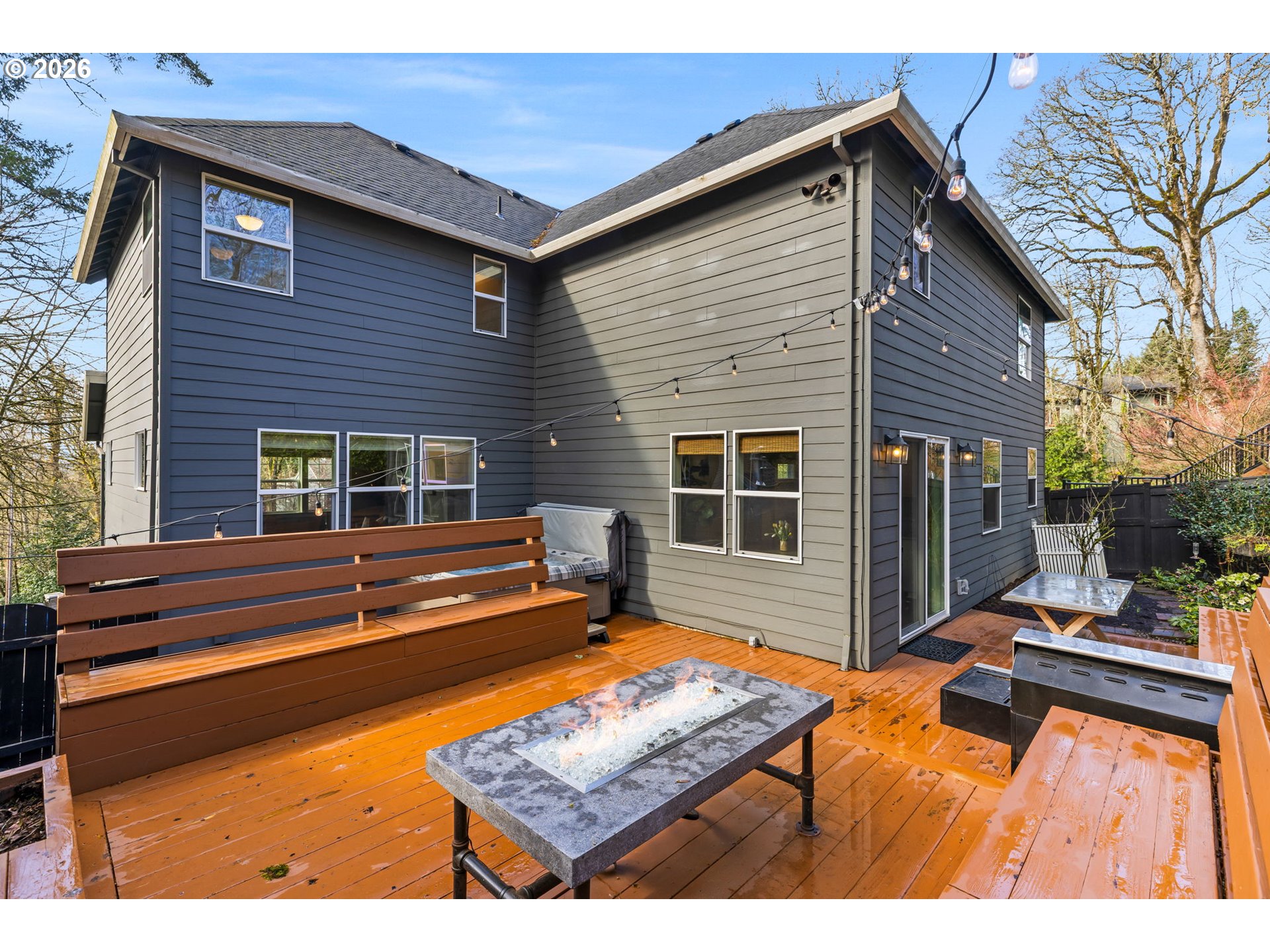 This light-filled residence showcases beautifully curated, thoughtfully selected finishes throughout, blending contemporary style with everyday comfort. The kitchen features quartz countertops, a full-height backsplash, stainless steel appliances, and freshly painted cabinetry, perfectly designed for both entertaining and daily living. The open-concept main level offers engineered hardwood floors, a gas fireplace with built-ins, and expansive windows that fill the space with natural light. Upper level, you’ll find generously sized bedrooms and two beautifully updated bathrooms with cabinetry and marble tile. Additional upgrades include fresh interior paint, a newly expanded front porch, and light fixtures in the dining room. The oversized two-car garage offers a dedicated workshop space along with generous storage options. Step outside to enjoy the low-maintenance yard with decks, ample seating space, adjacent green space for added privacy, and a brand-new hot tub. [Home Energy Score = 5. HES Report at https://rpt.greenbuildingregistry.com/hes/OR10115249]