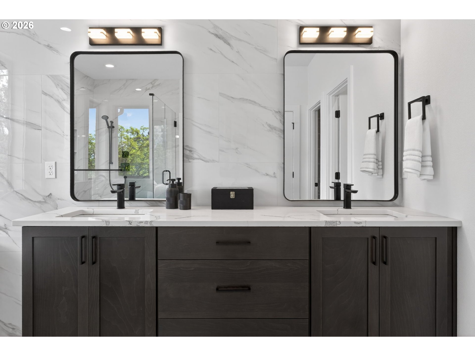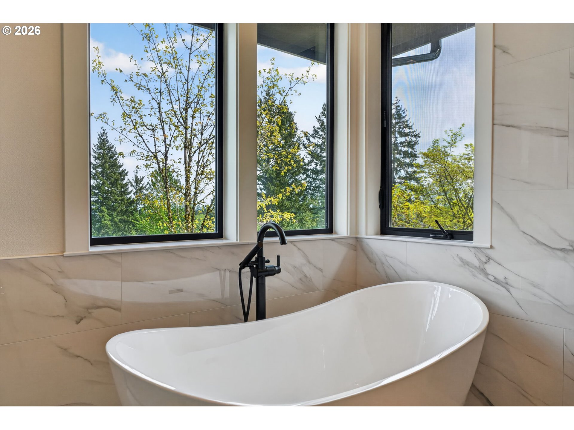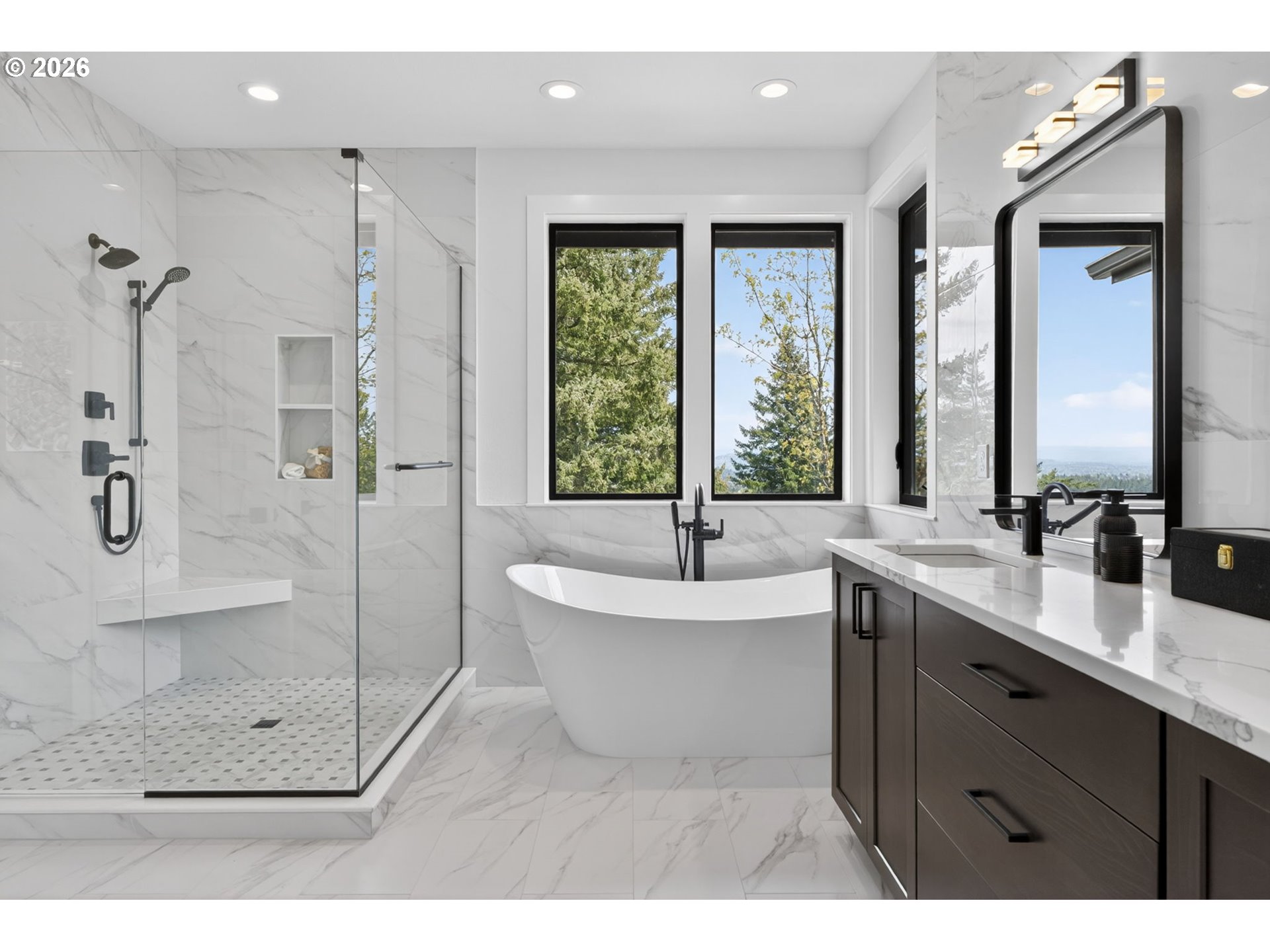 Modern luxury meets incredible views in this Lake Oswego Mt. Park new construction home! Overlooking Mt. Hood and the valley and designed with intention and style, this home features hardwood floors, sleek black vinyl windows, and high-end finishes throughout—from statement lighting and custom railings to horizontal grain cabinetry and floor to ceiling tiling. The gourmet kitchen is the heart of the home, complete with quartz countertops, a large island with an eat bar, European-style stainless steel appliances, wine fridge, walk-in pantry, 3D tile backsplash and soft close cabinets and drawers. Built-in appliances! The great room centers around a dramatic floor-to-ceiling tiled fireplace and french doors leading to the outdoors. Take in the views year-round from the expansive covered deck or unwind on the covered patio, fully equipped for entertaining with a gas BBQ hookup. Retreat to the primary suite with a spa-inspired bathroom featuring a frameless glass shower, soaking tub, and walk-in closet. Other notable features: tankless water heater and oversized 3-car garage with EV charging. HOA provides access to a premier community center offering an aquatic center, fitness facilities and classes, basketball and tennis courts, social spaces, walking trails, neighborhood activities and seasonal events. This home offers both lifestyle and design-grab it before it's gone!