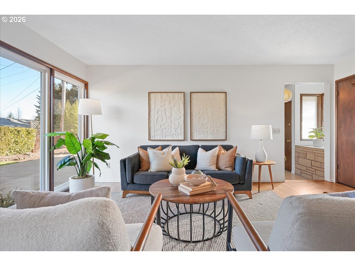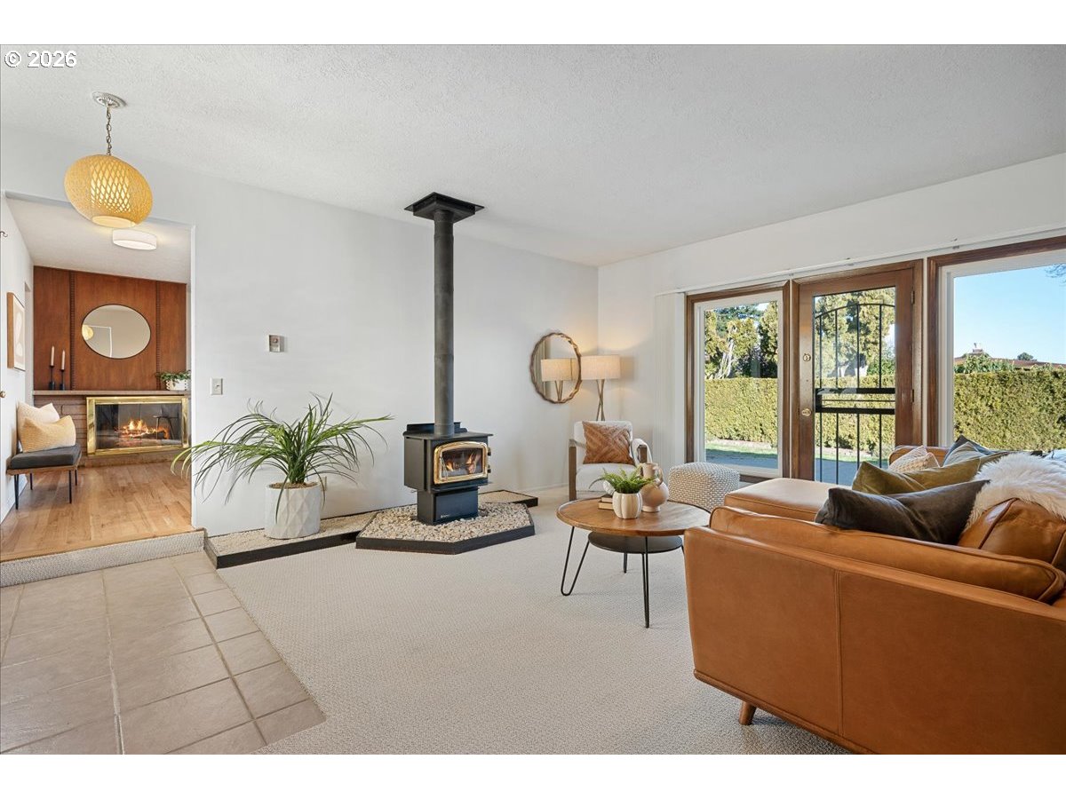 Wonderful mid-century ranch on a generous 7,875-SF lot in a sweet neighborhood. A spacious front yard with a charming water feature welcomes you into this inviting 3-bedroom, 2-bath home featuring newly refinished oak & fir floors, fresh interior paint, and cozy carpet in the family room.The family room offers a woodstove and an entire wall of closet storage, while the main living room showcases a gas fireplace and lovely picture windows that flood the space with natural light. The adjacent dining room overlooks the expansive backyard patio and flows seamlessly into the kitchen, which includes a darling eating nook with a custom hand-painted table and fold-away benches. Sliding glass doors provide easy access to the side yard.All 3 bedrooms are on the main level, including a primary suite with double closets and an adjoining bath, along with a hall full bath. Additional features include an attached 1-car garage and an outdoor storage shed. Meticulously maintained and full of charm—this is a true gem. Come take a look!