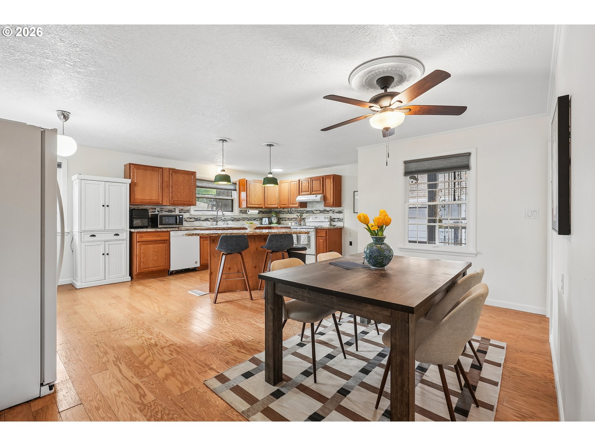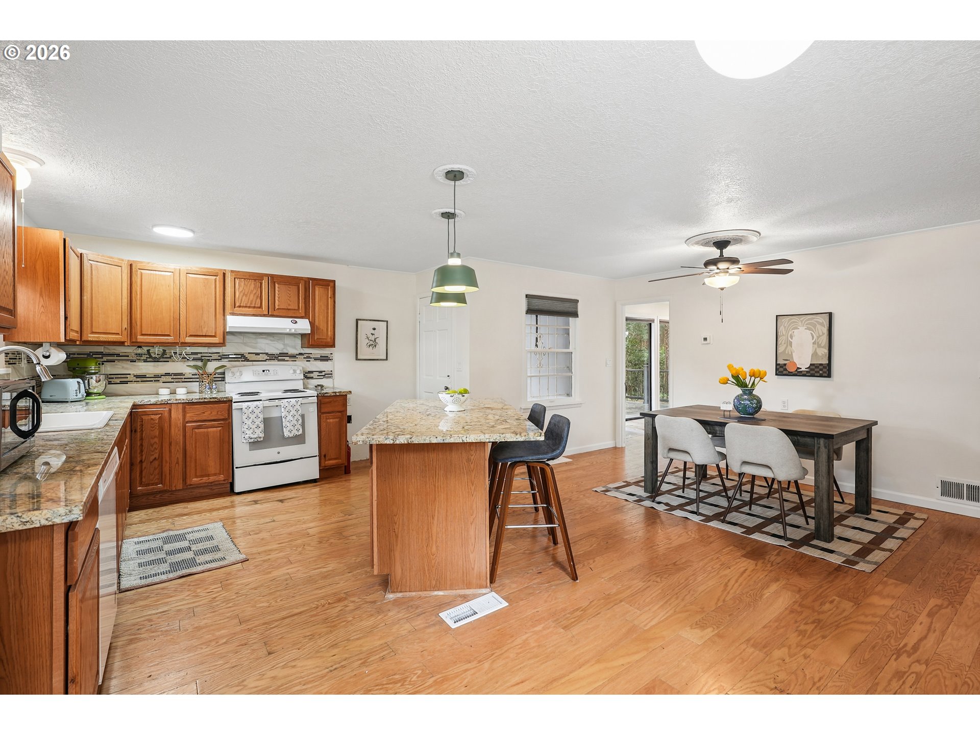 Adjacent to Glendoveer Golf Course lies a jolly 1952 home draped in gray and red, watched over faithfully by a towering set of pine trees. Here is 14005 NE Halsey St. who beckons you for a gander with expansive spaces, a bounty of updates, and 0.33 acres of a pleasant corner lot. Four bedrooms, two of which anchor the main floor, accompany two bathrooms (and one of those is main floor accessible, too). The kitchen is breathable while the living room and a sunny flex room are its direct neighbors. Crawl space and attic fixes, cleaned gutters, interior paint, light fixtures, refreshed landscaping (2026). Back deck (2025). Electrical panel (2023). Main floor bathroom, furnace, stove, dishwasher, partial laminate floors, sewer (2022). Abundant natural light will greet you from every room; the wood-burning fireplace can only add to such comfort. NE Halsey grants you easy access to I-84 and I-205 and, once home again, there is a detached garage to meet you and your creativity. Take a gander. Be a silly goose. Geese visiting from Glendoveer could help you choose.