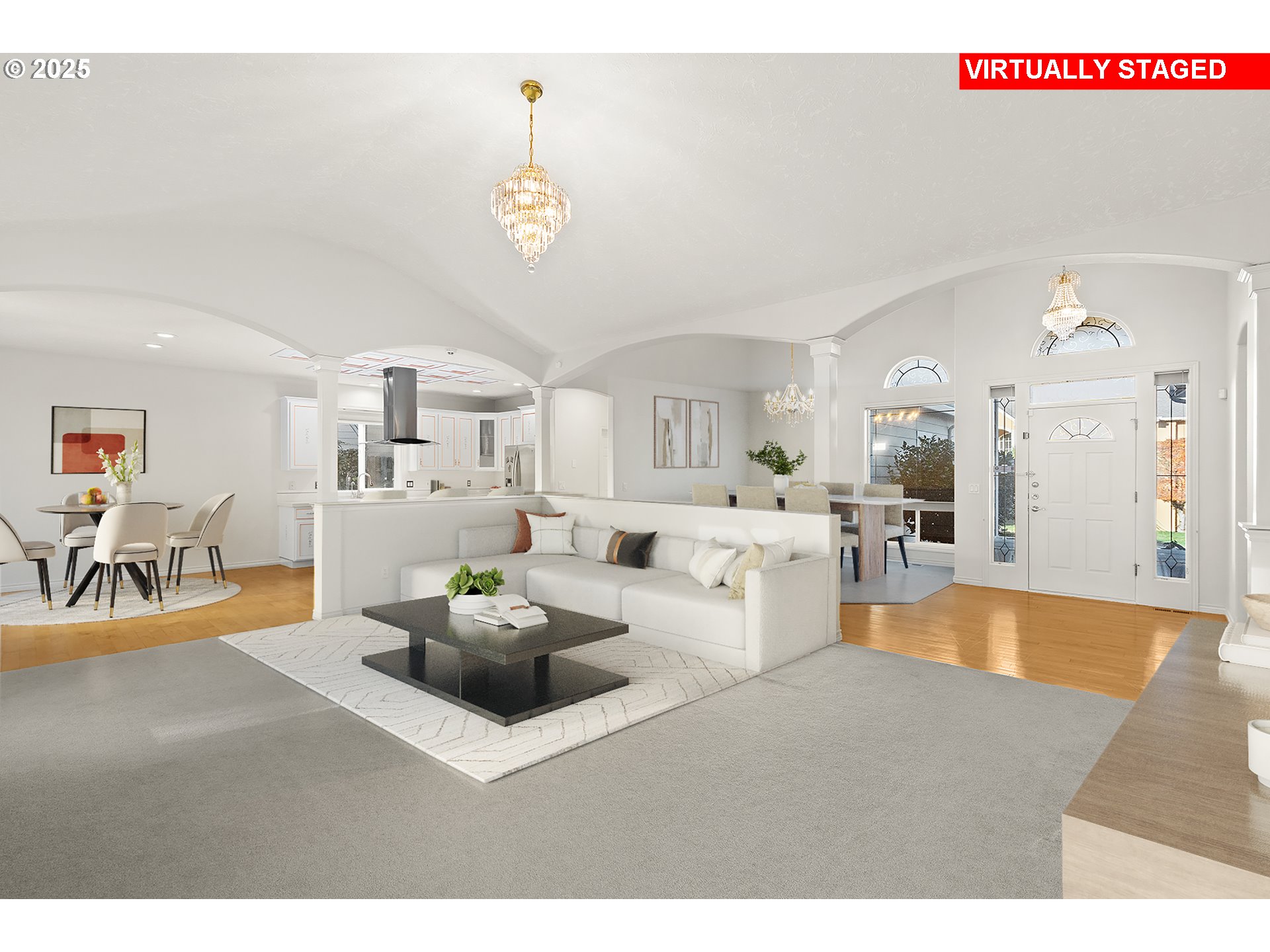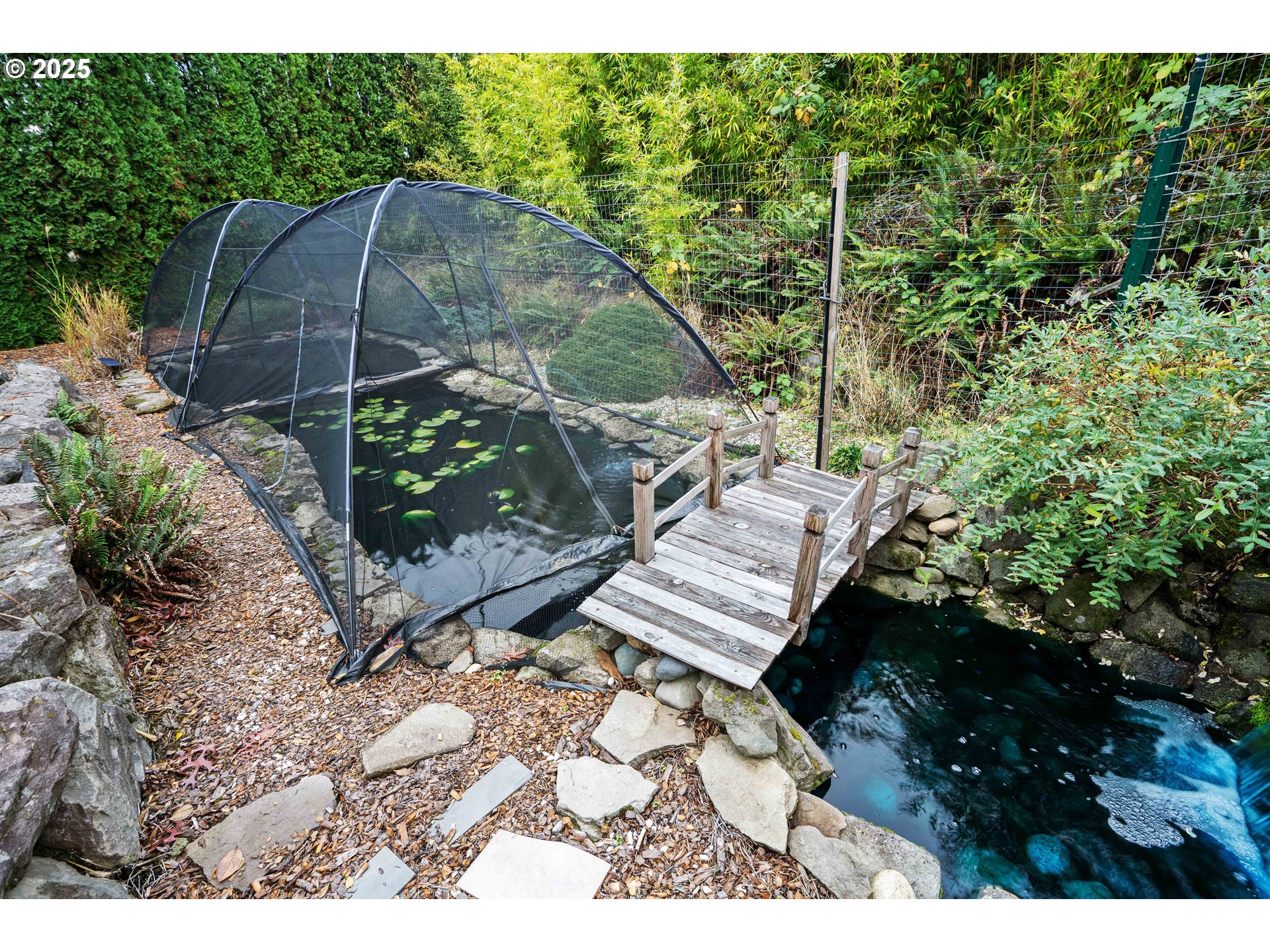 Tucked against Powell Butte Nature Park, this one-level home lives like a private sanctuary. Sunlight fills the open concept living, dining, and kitchen spaces, highlighting warm finishes and drawing your eye to the lush backyard. The kitchen is designed for gathering, featuring custom cabinetry with rose-gold accents, stainless steel appliances, a statement range hood, and an inviting eat-in island. Upgrades include an air-fry flex-duo oven with Wi-Fi connectivity, quiet Energy Star dishwasher with upper cutlery rack, and reverse osmosis water filtration system. The spacious primary suite offers peaceful backyard views, direct patio access, and an ensuite with double vanity, soaking tub, and a walk-in closet with custom built-ins. Two additional bedrooms share a convenient Jack-and-Jill bathroom. Both full bathrooms feature glass sliding doors with privacy film. A well-appointed laundry room includes the convenience of an additional mini washer. The backyard is a true retreat with stone paths, raised garden beds with organic soil, a gentle waterfall flowing into a mesh-protected pond where koi and goldfish glide beneath a charming footbridge. A pergola with curtains and mesh creates a private outdoor living space ideal for entertaining or relaxing. Additional features include LED recessed RGB lighting, one-way mirror window films for privacy and energy efficiency, and solar-powered motion sensor lights in both front and backyard. With private access to miles of trails, you can explore forests, meadows, and panoramic viewpoints without ever getting in the car. It’s a unique blend of tranquility and convenience - minutes to shops, trails, parks, and the everyday essentials. A home that feels like an escape, yet keeps you connected to everything you need. Welcome to the serenity of Powell Butte living! [Home Energy Score = 4. HES Report at https://rpt.greenbuildingregistry.com/hes/OR10059553]